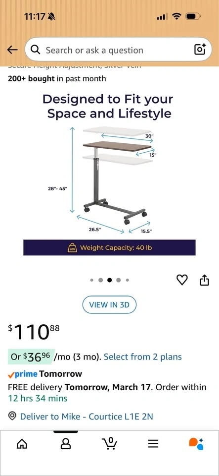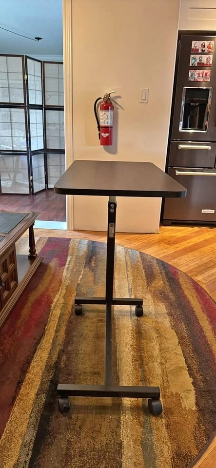 Bought from Amazon but ended up not needing it. Still brand new and assembled. Adjustable height 28” – 45”. Desktop size 30” x 15”. Base size 26.5” x 15.5”. 40 lb weight capacity. Rolling wheels for easy movement. Compact and perfect for laptop work, couch use, or a standing desk. Paid $110.
