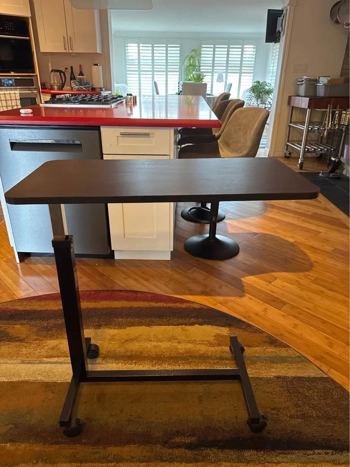Bought from Amazon but ended up not needing it. Still brand new and assembled. Adjustable height 28” – 45”. Desktop size 30” x 15”. Base size 26.5” x 15.5”. 40 lb weight capacity. Rolling wheels for easy movement. Compact and perfect for laptop work, couch use, or a standing desk. Paid $110.