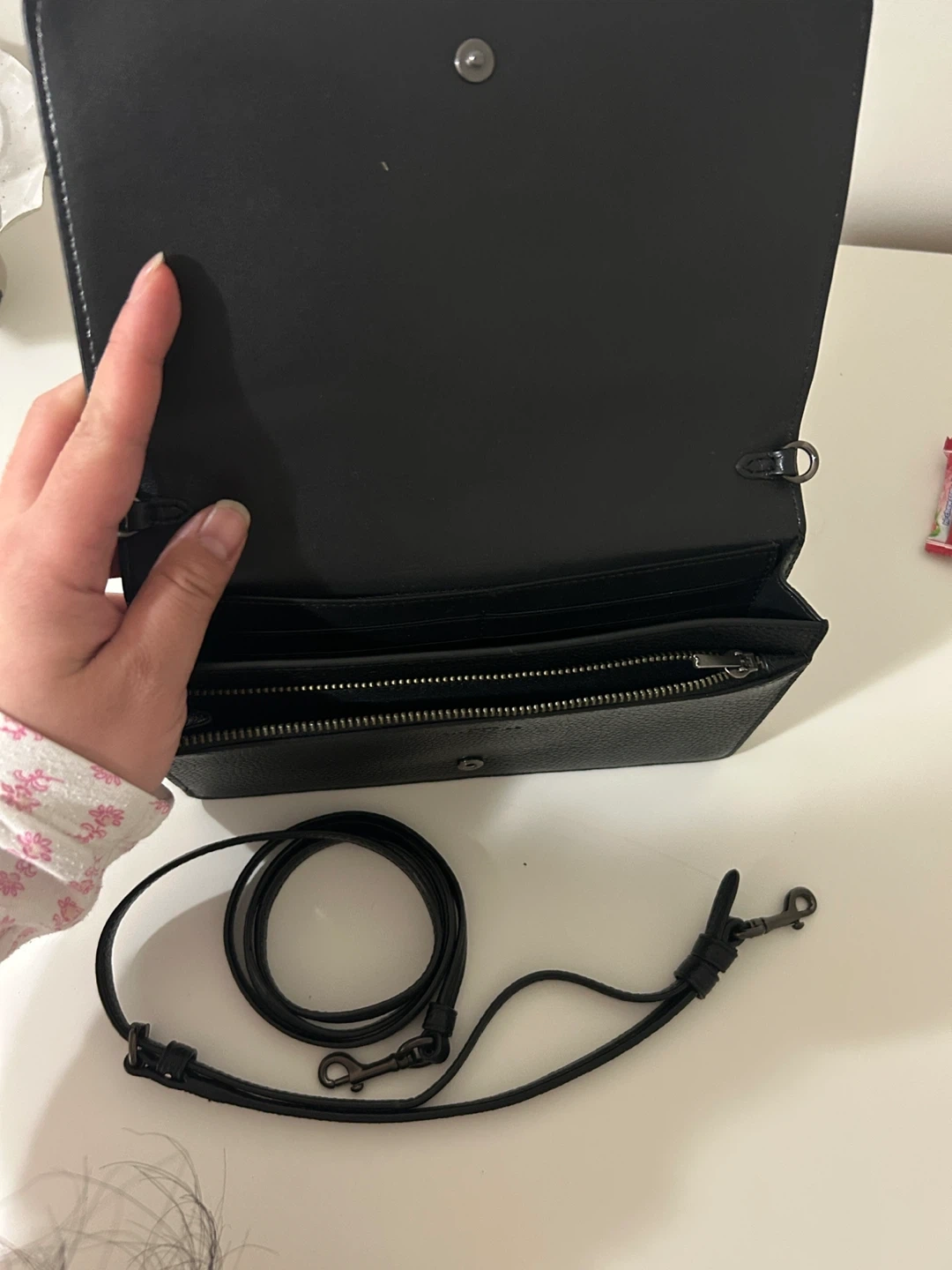 Black pebbled leather wallet with a cute floral and bow pattern. It comes with a detachable crossbody strap. Plenty of card slots and a zippered coin pocket inside.