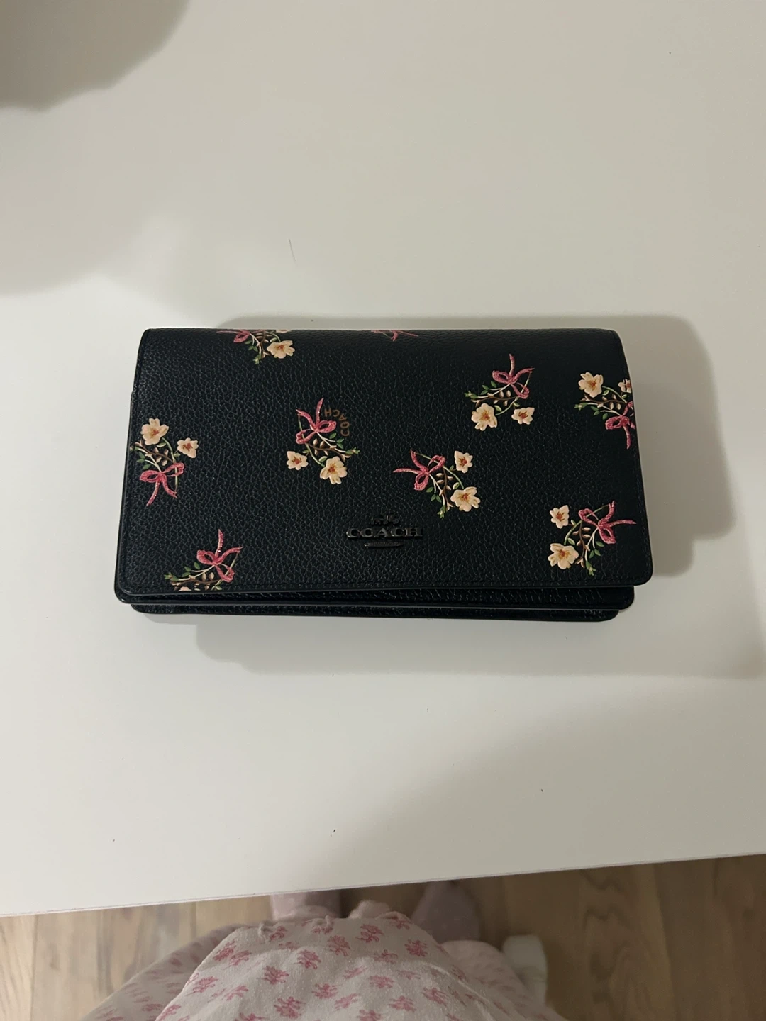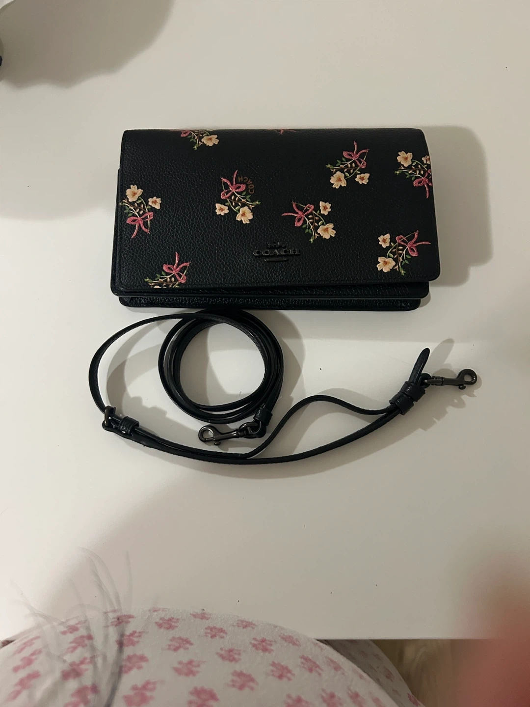 Black pebbled leather wallet with a cute floral and bow pattern. It comes with a detachable crossbody strap. Plenty of card slots and a zippered coin pocket inside.