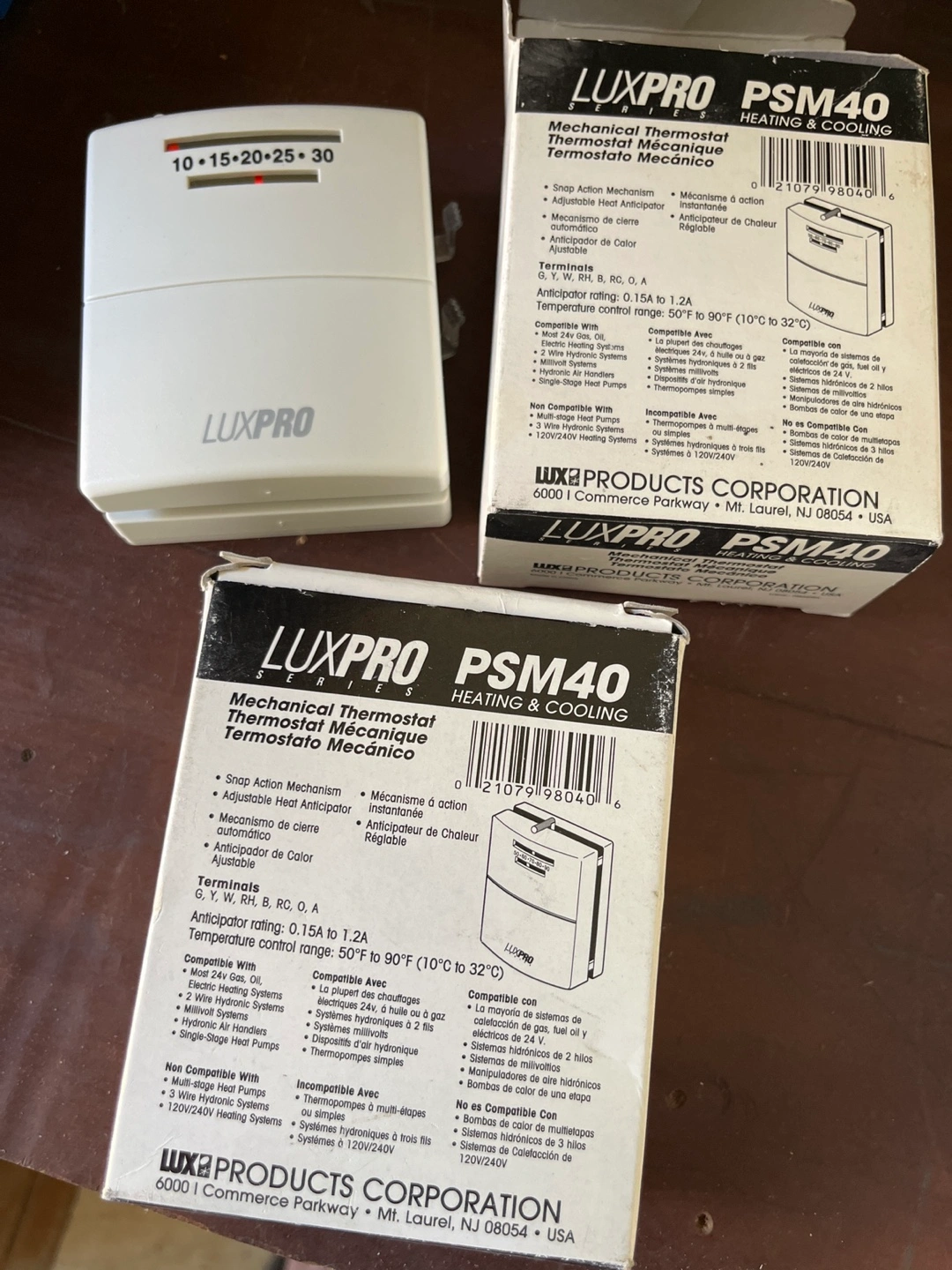 Selling a LUXPRO PSM40 mechanical thermostat. It's compatible with most 24v gas, oil, and electric heating systems, as well as 2-wire hydronic systems. It also works with millivolt systems and hydronic air handlers. The temperature control range is 50°F to 90°F (10°C to 32°C). Box included!