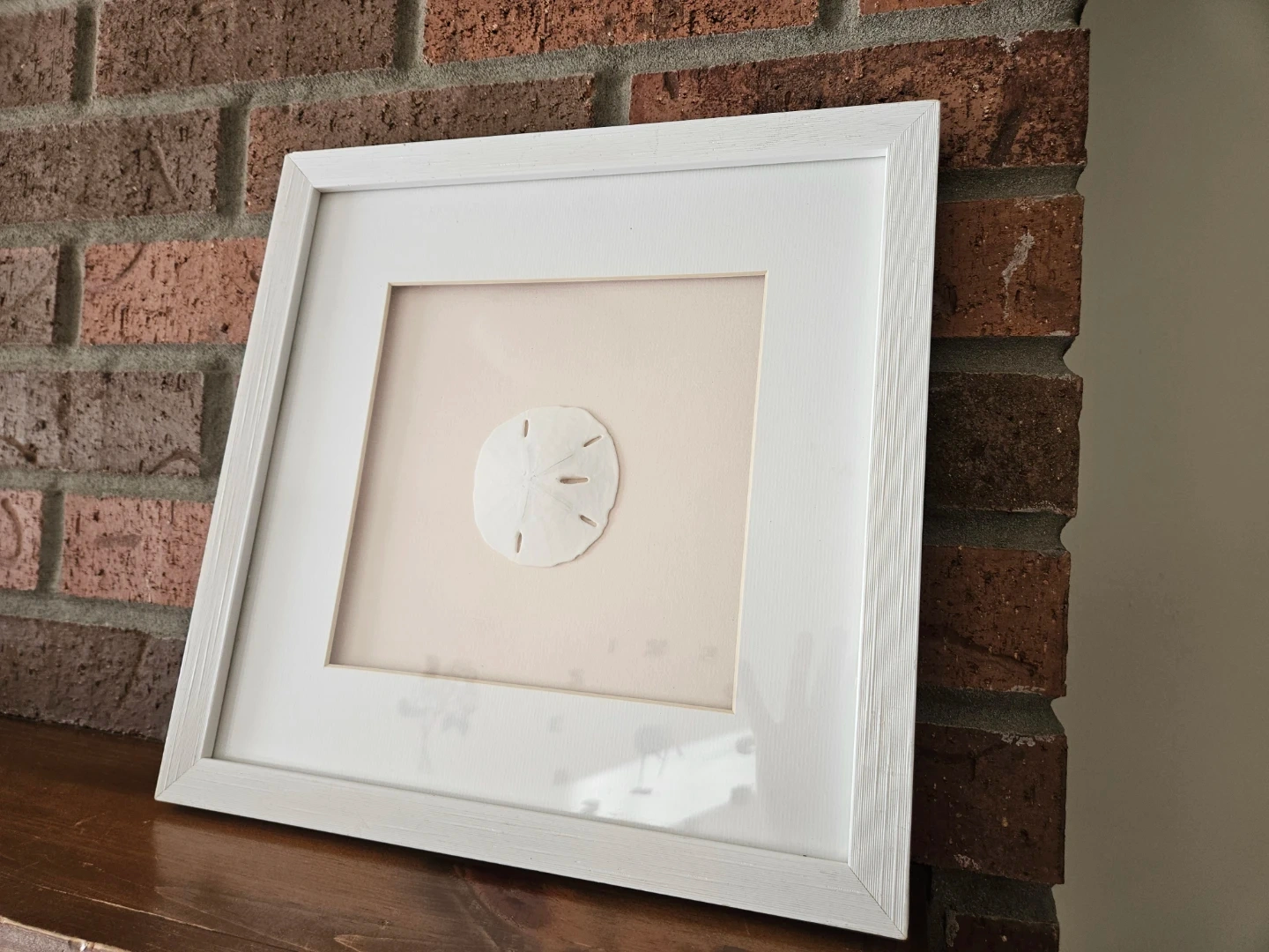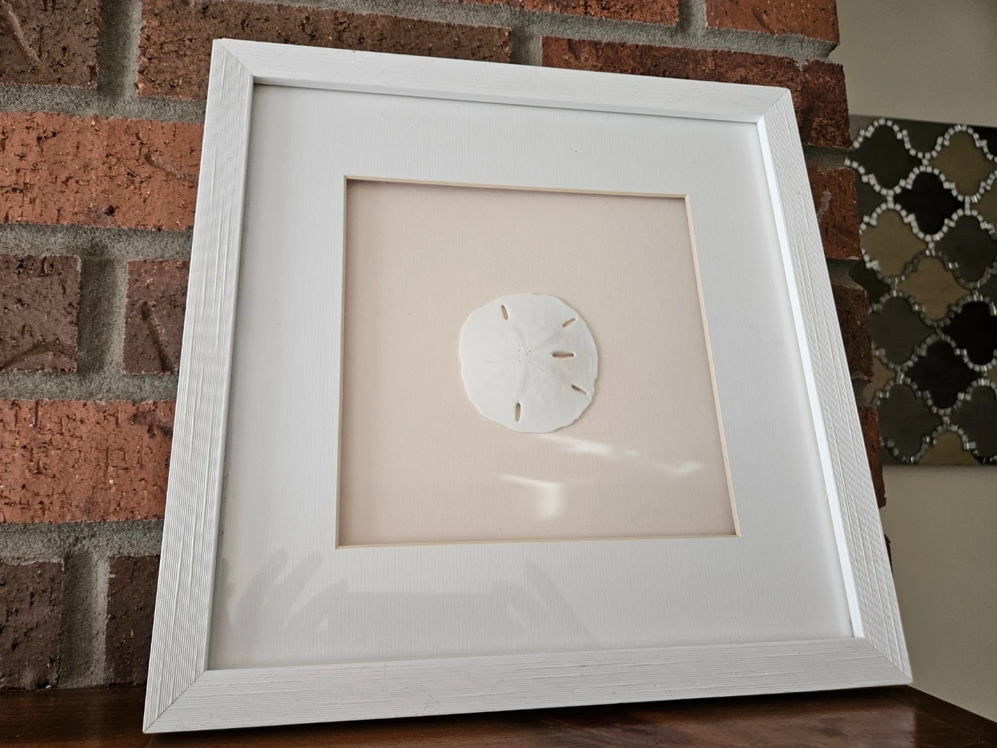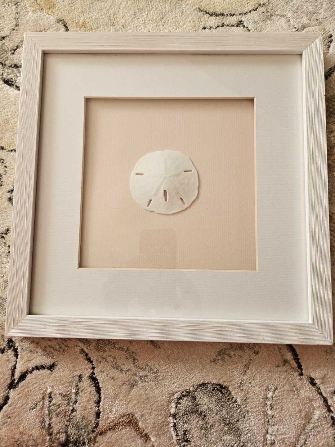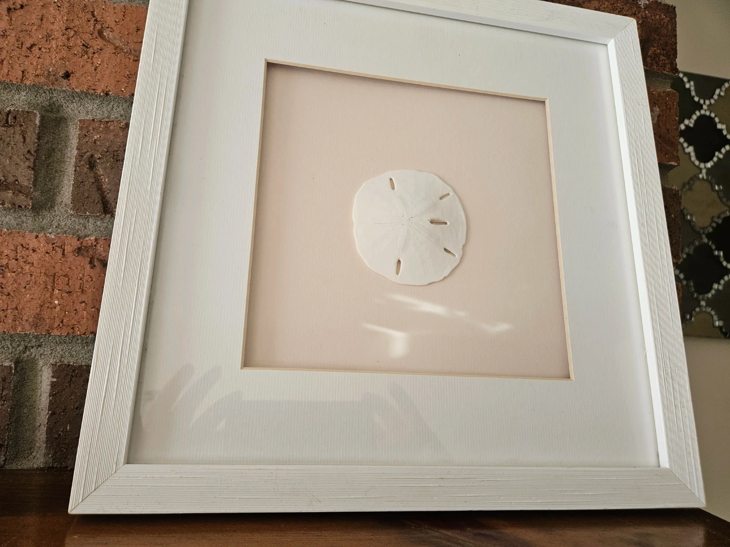 A white framed piece featuring a single sand dollar on a light pink mat. It's a lovely decorative item for any room or bathroom. Adds a touch of coastal charm to your home!