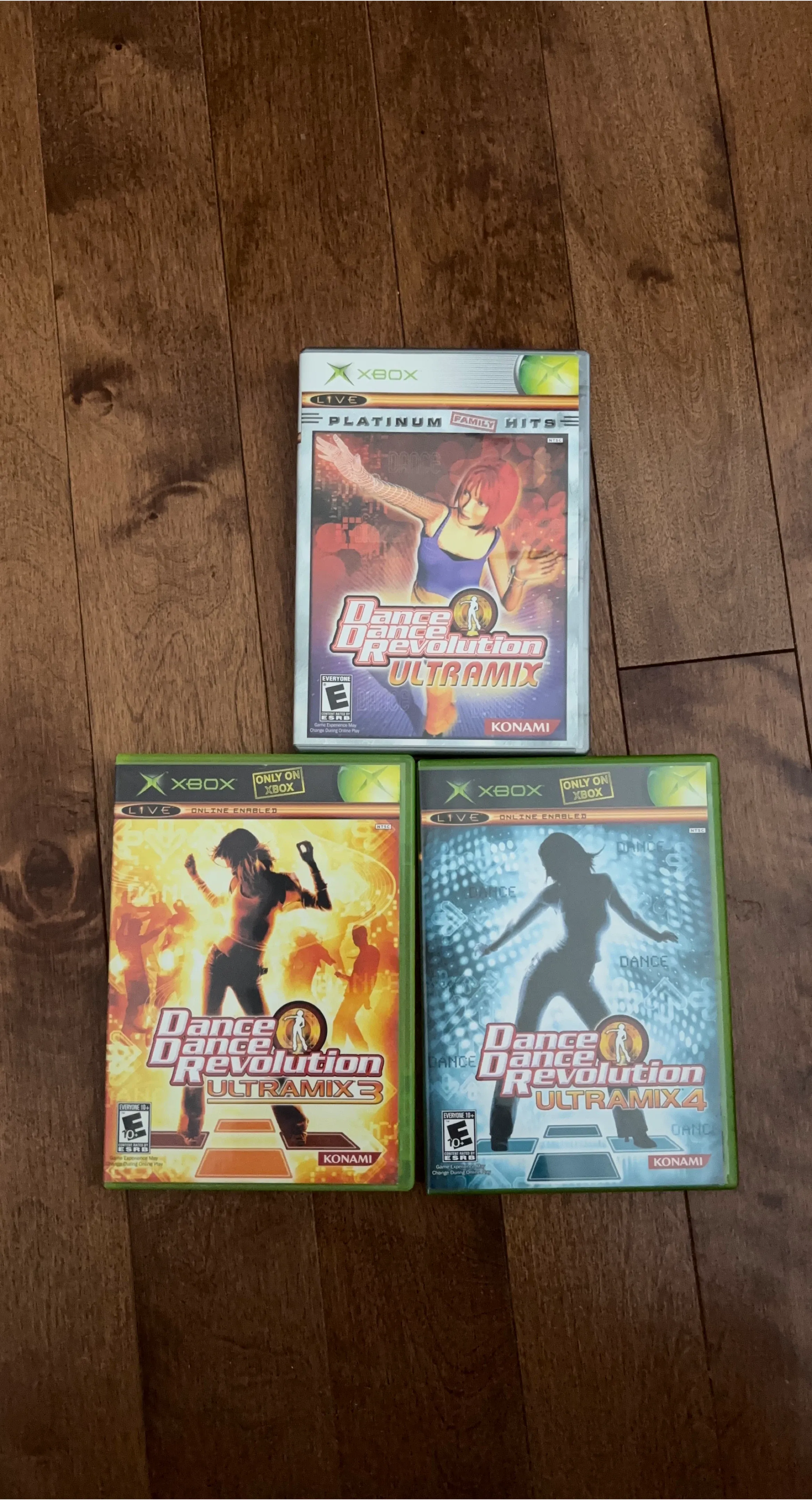 Three Dance Dance Revolution games for the original Xbox: Ultramix, Ultramix 3, and Ultramix 4. These Platinum Family Hits are online enabled. All three games are rated E or E10+ by ESRB.