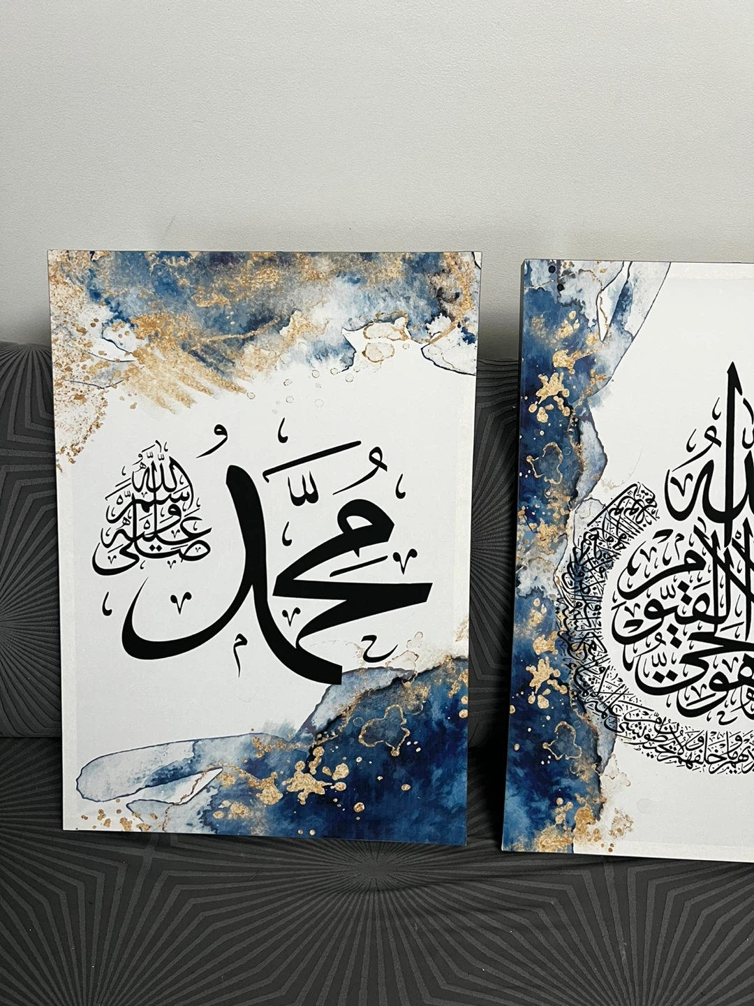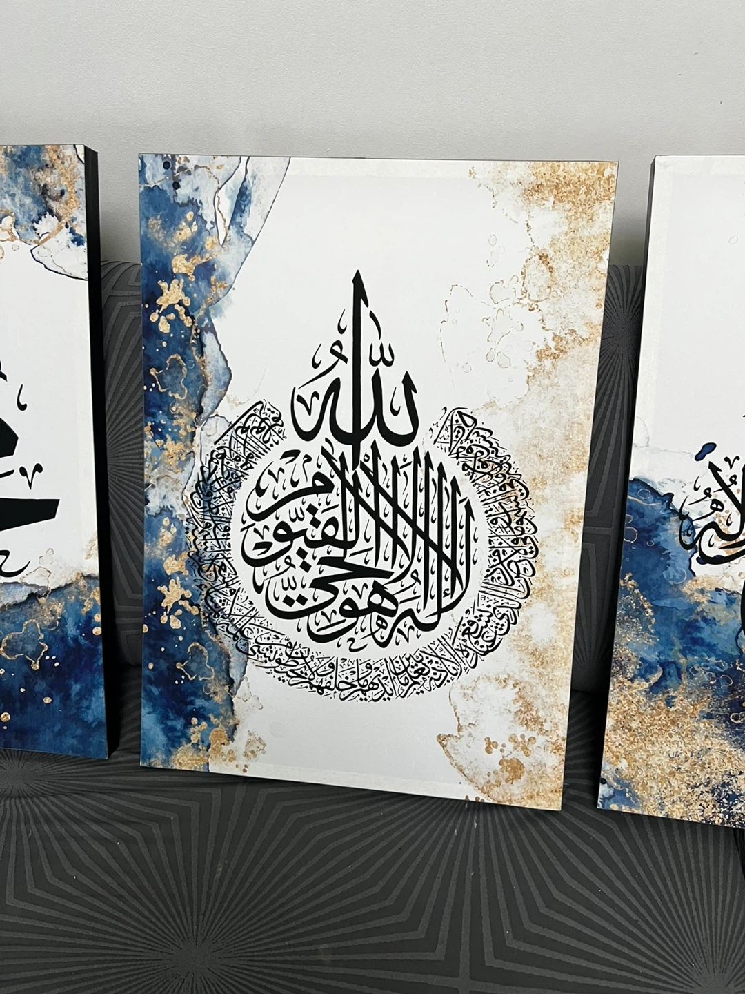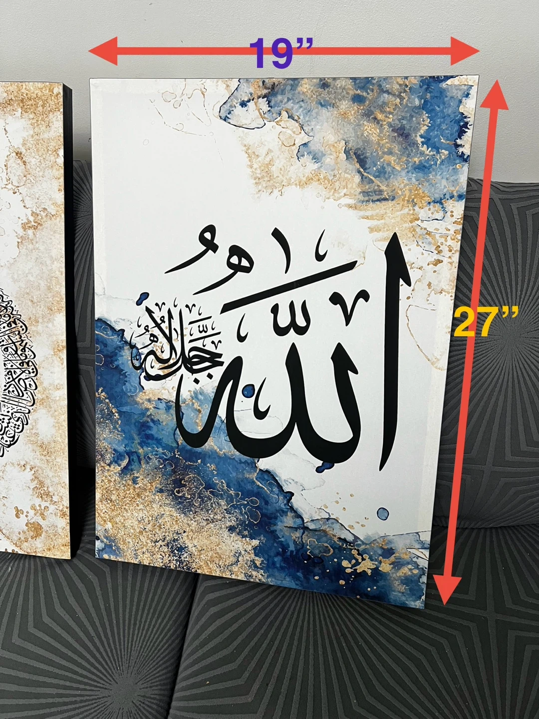 Selling a set of new three Islamic calligraphy wall art pieces. They feature beautiful Arabic script on a canvas with a blue and gold marble effect. The dimensions are approximately 19" x 27". They're in great condition and would add a lovely touch to any room