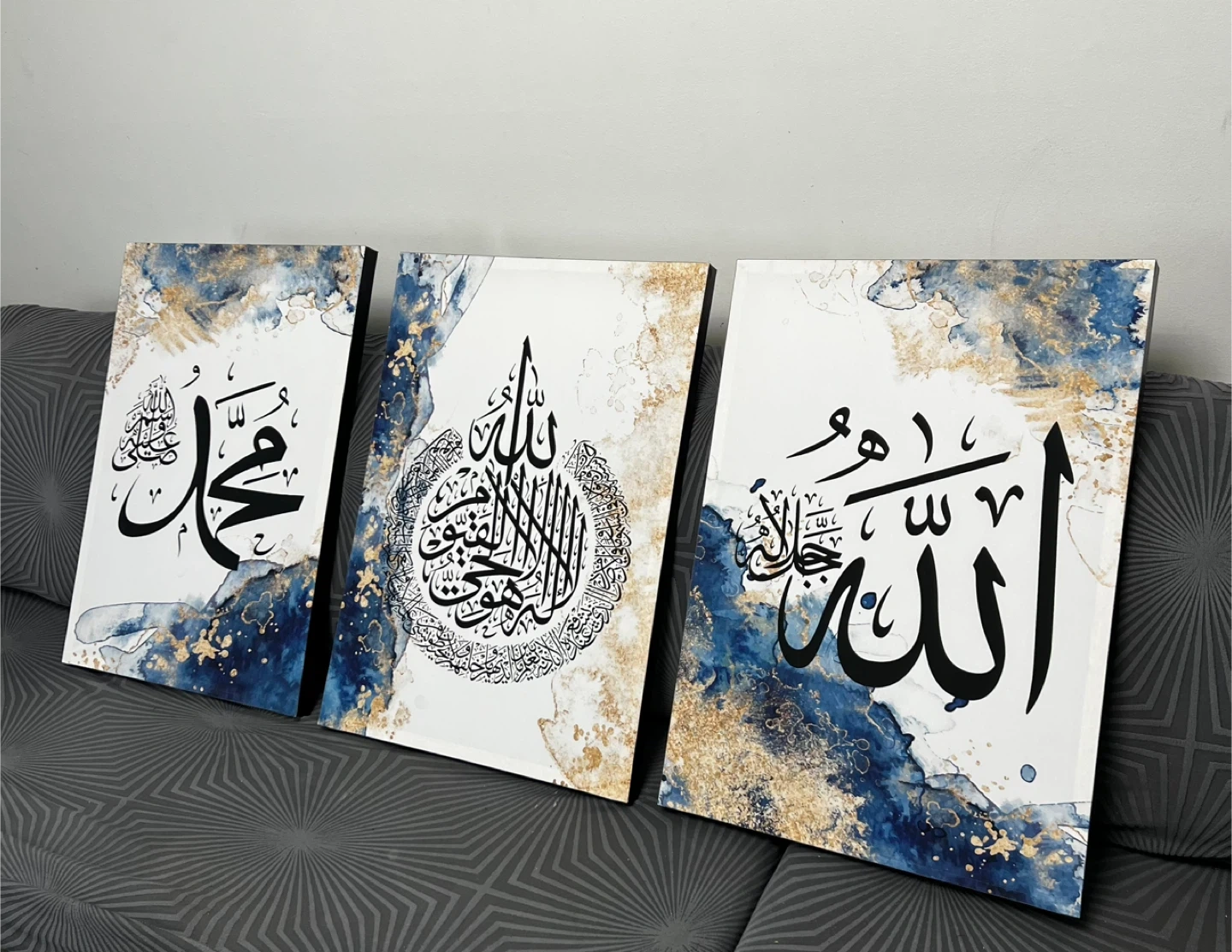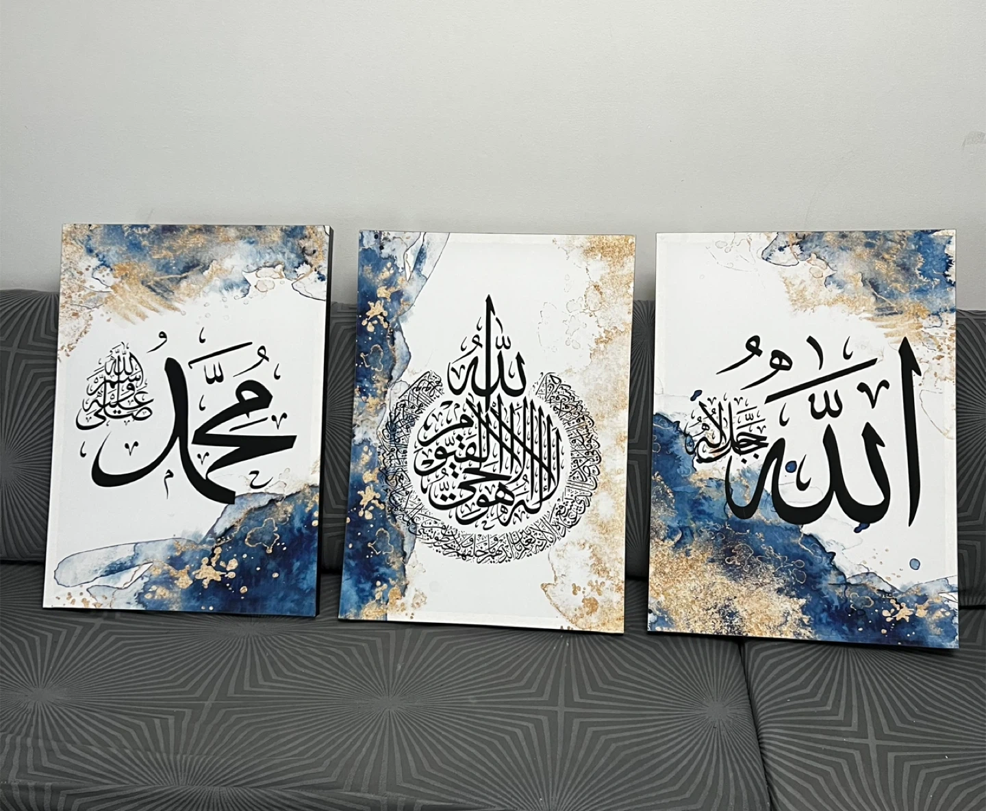 Selling a set of new three Islamic calligraphy wall art pieces. They feature beautiful Arabic script on a canvas with a blue and gold marble effect. The dimensions are approximately 19" x 27". They're in great condition and would add a lovely touch to any room