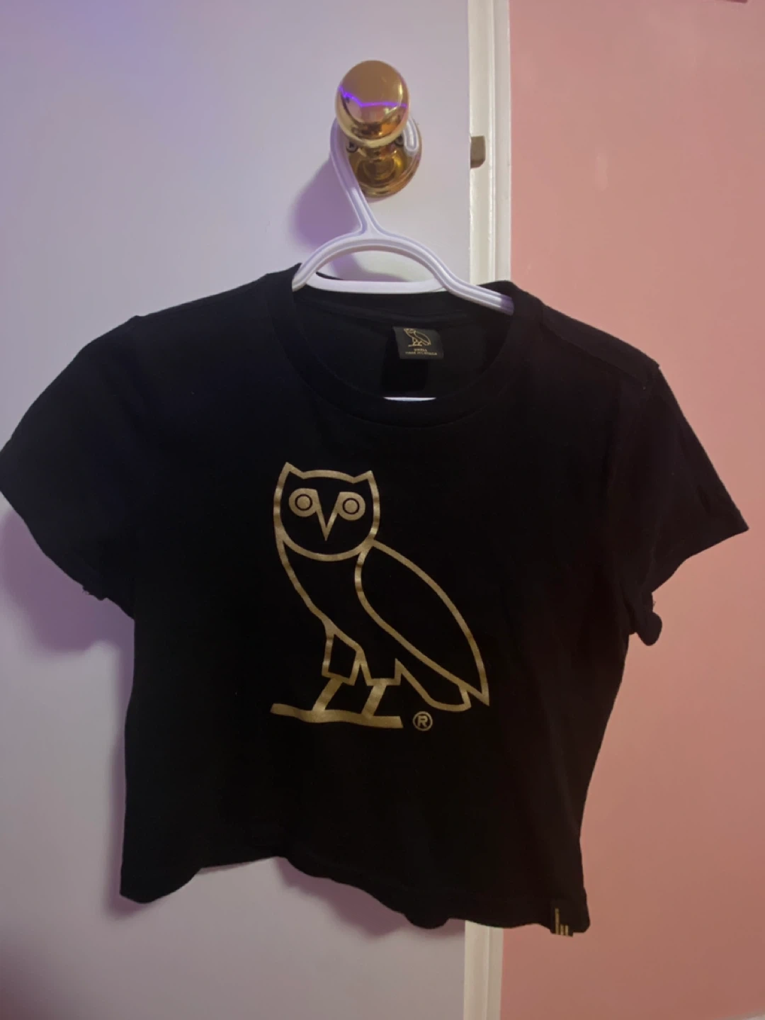 Selling a cute black crop top from October's Very Own (OVO)! It's in great condition and features the iconic OVO owl logo in gold with glitter. Size is small.
