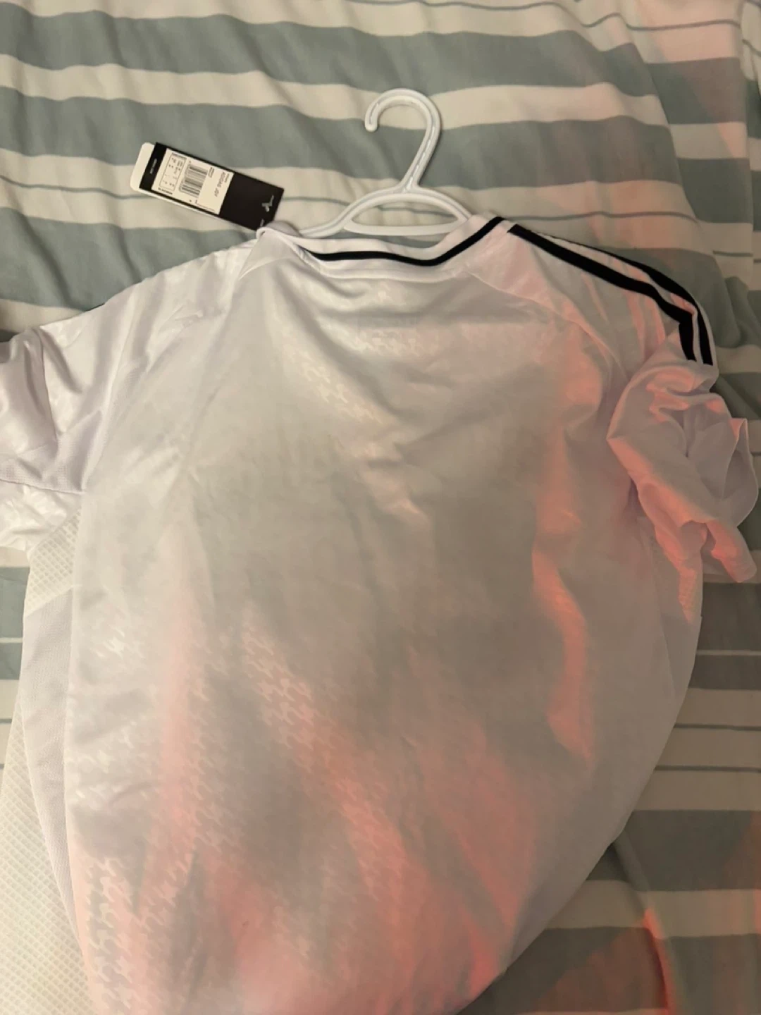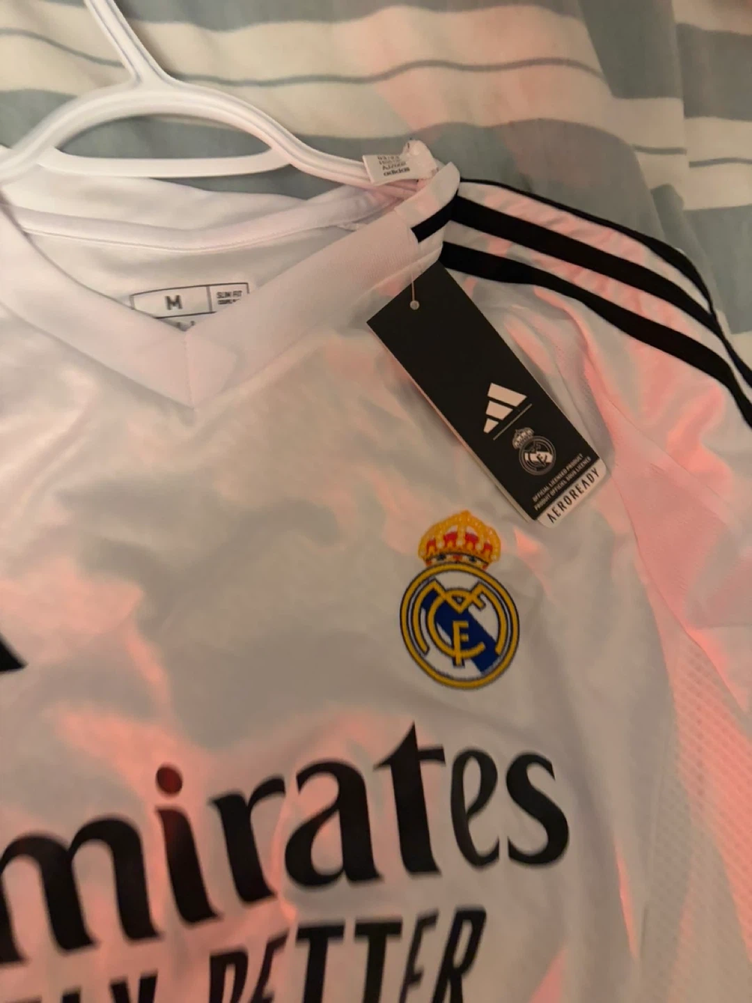 White Adidas Real Madrid CF jersey with Emirates Fly Better sponsor. It's a size medium with a slim fit. AEROREADY material keeps you dry. This jersey is made for fans and players alike!