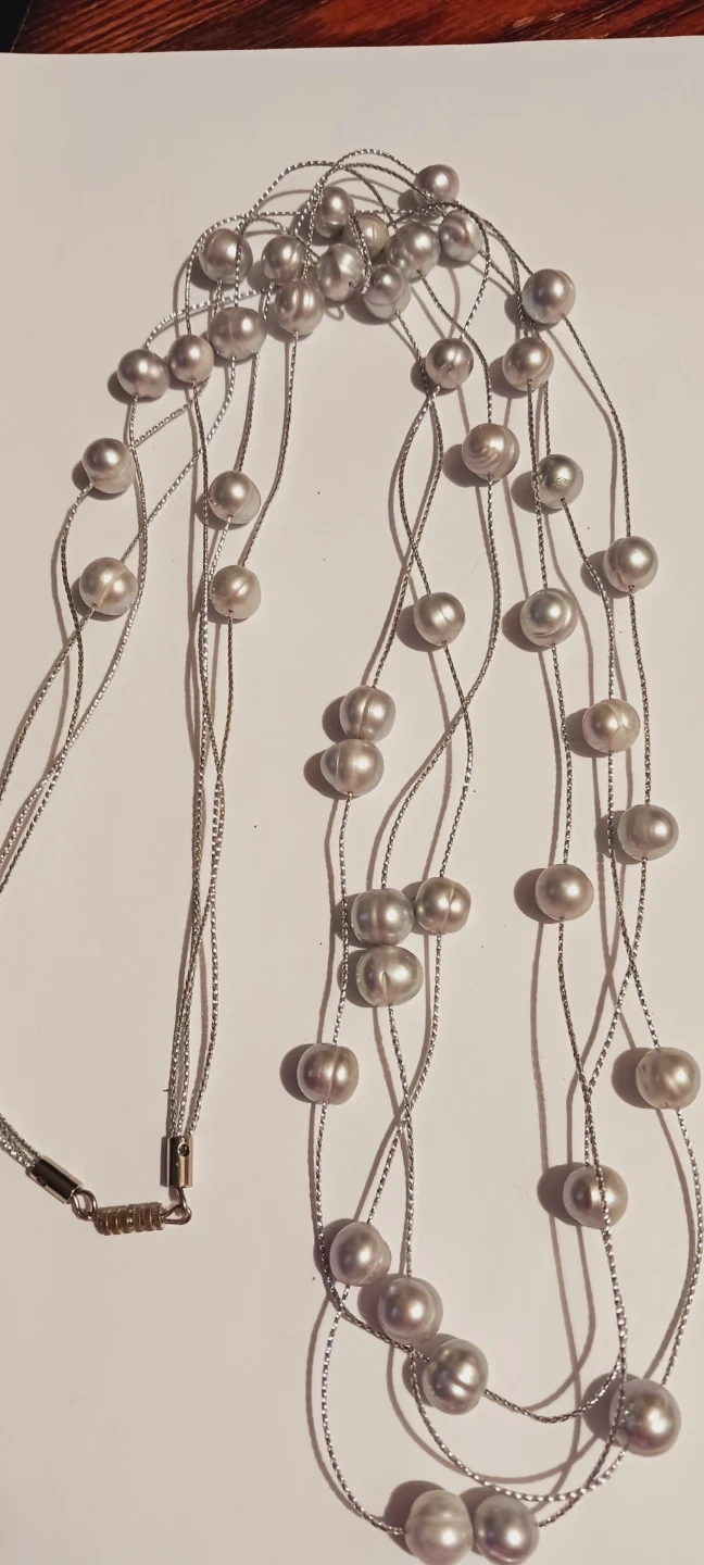 Gorgeous Genuine Freshwater Pearl Multi Strand Necklace. The pearls are strung on thin, silver-toned cords. Excellent condition. 32" long
