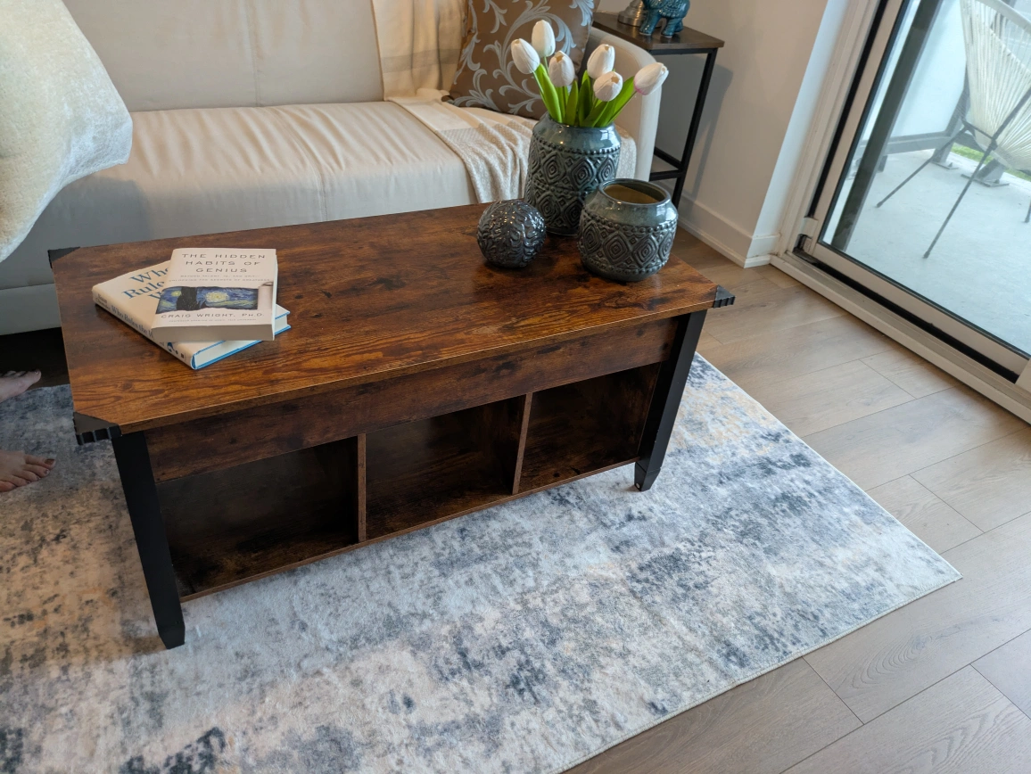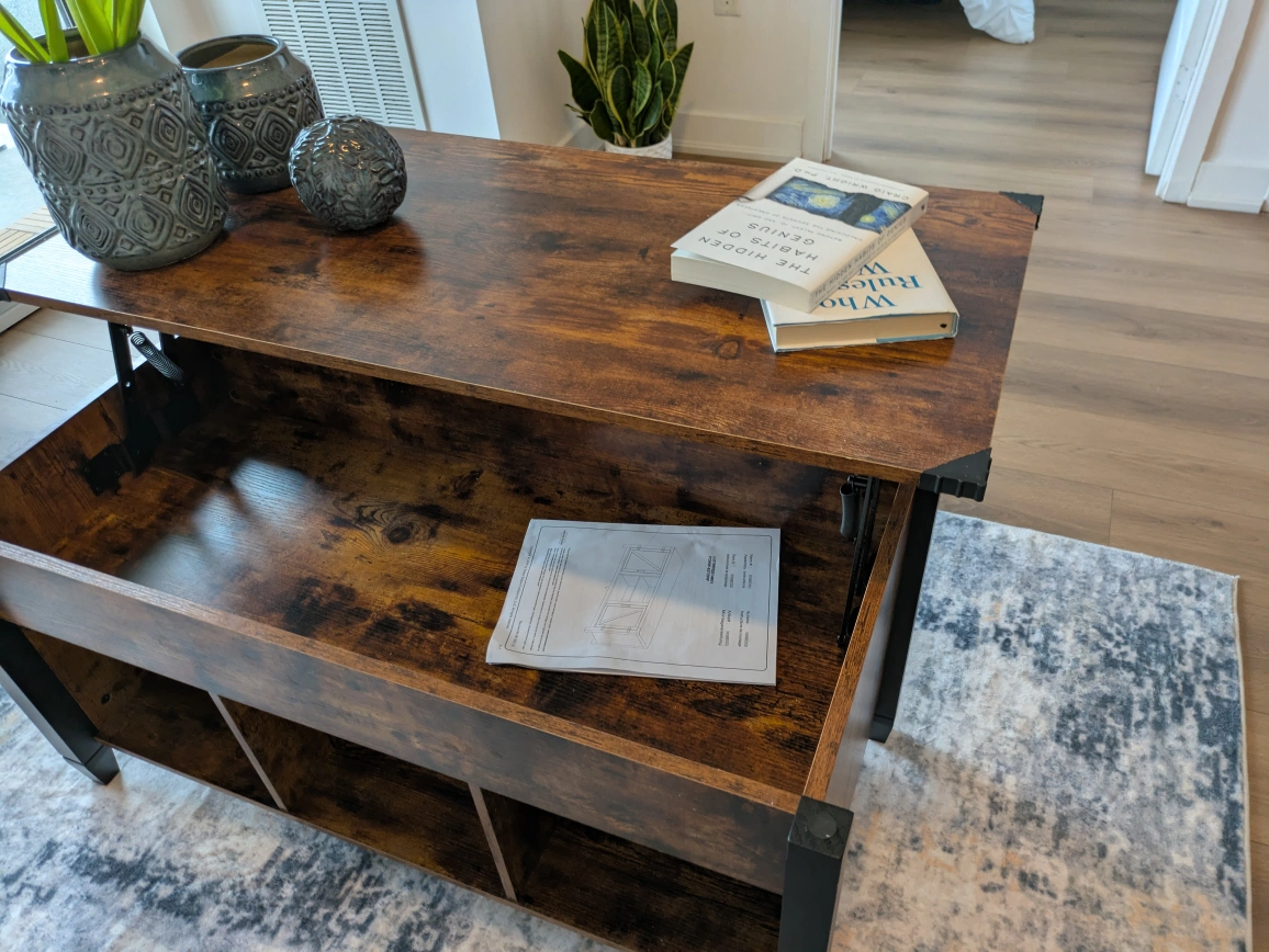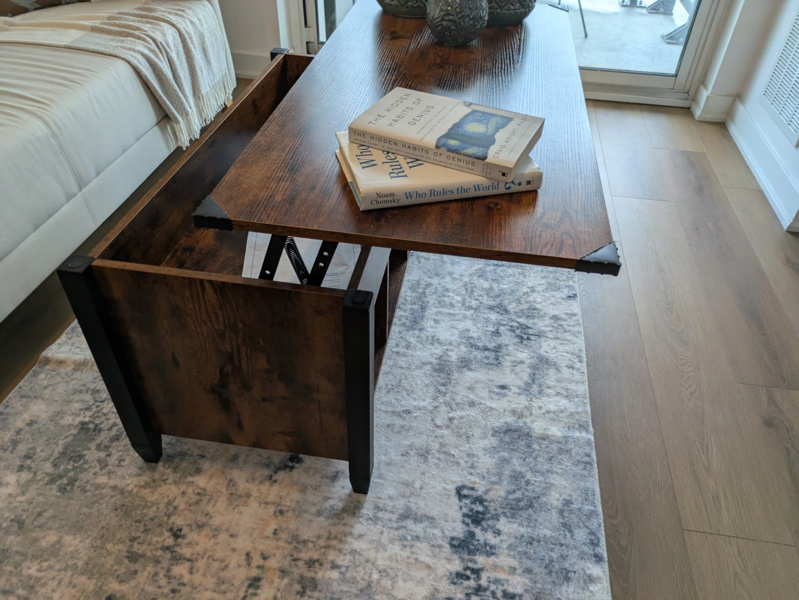 This lift-top coffee table is perfect for adding functionality and style to your living room! The dark brown finish gives it a warm, inviting look. It's great for working from home or enjoying a meal in front of the TV. It also has storage space underneath the lift top.
