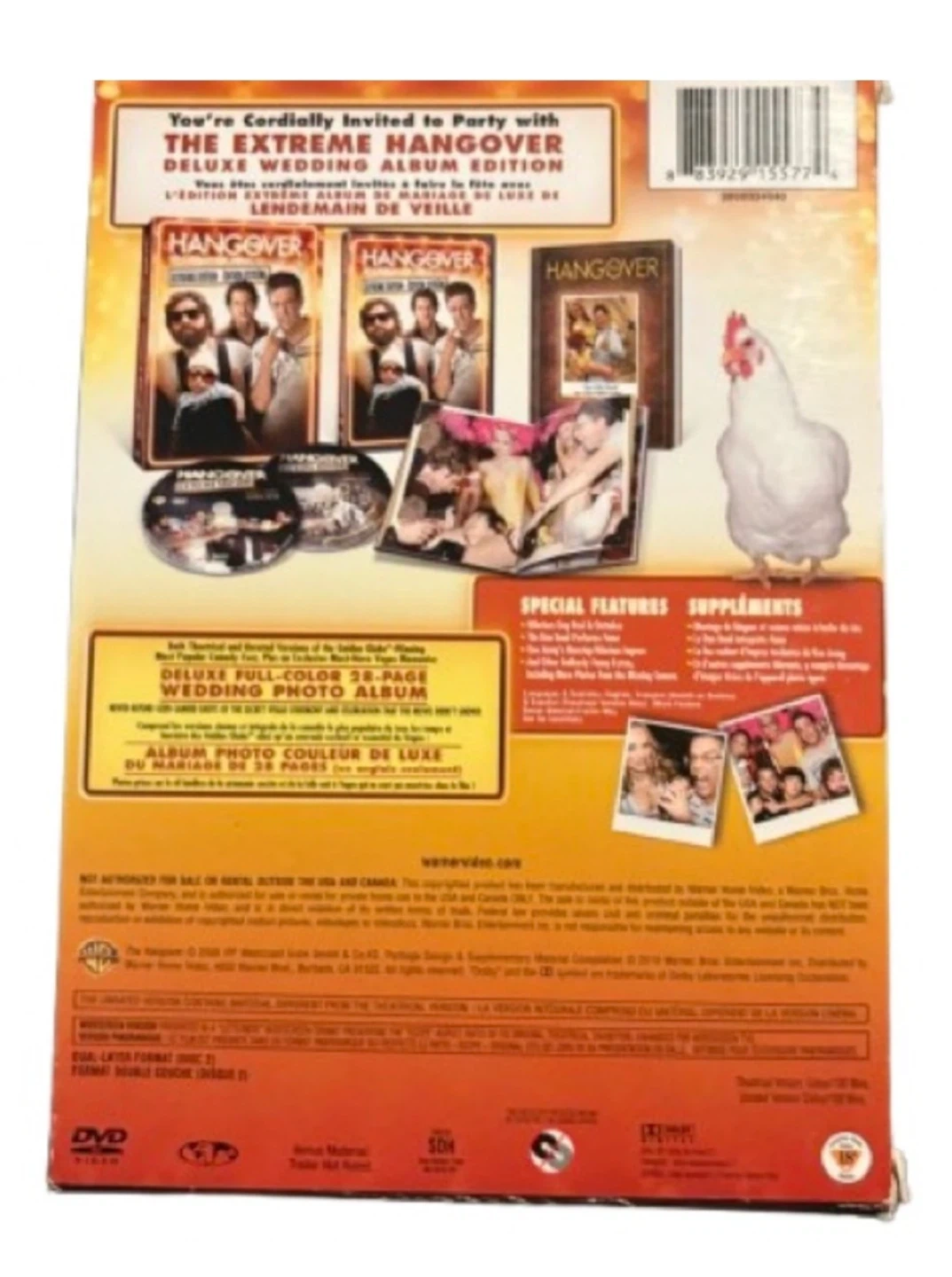 A wildly popular comedy following the Wolfpack’s unforgettable night in Vegas. This Deluxe Edition includes the original film, the Extreme Hangover version, and a full‑colour 28‑page wedding photo album packed with bonus images. Discs play perfectly; case shows minimal shelf wear.