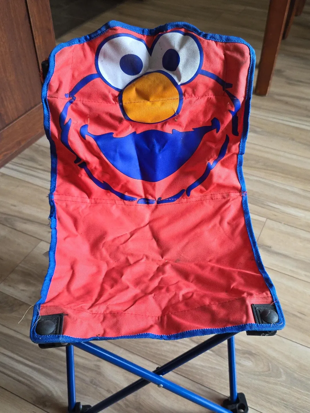 Here's a super cute Elmo folding chair for kids! It's in good condition and perfect for little ones to use indoors or outdoors. The chair features a fun Elmo design with red fabric and blue trim, and a sturdy blue metal frame. It's lightweight and easy to fold up for storage or transport, making it great for camping trips or picnics!