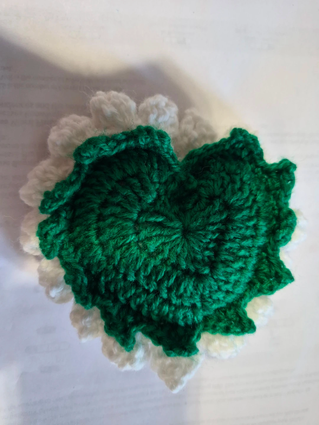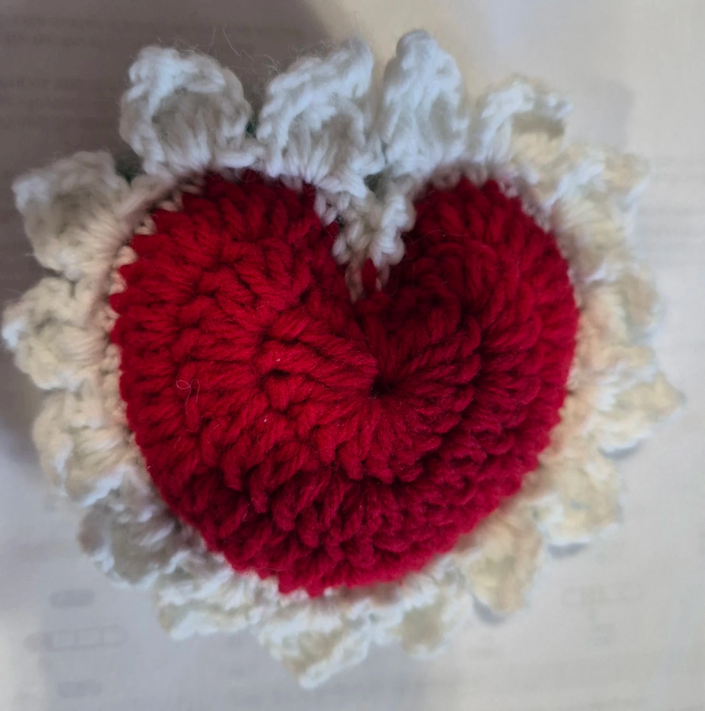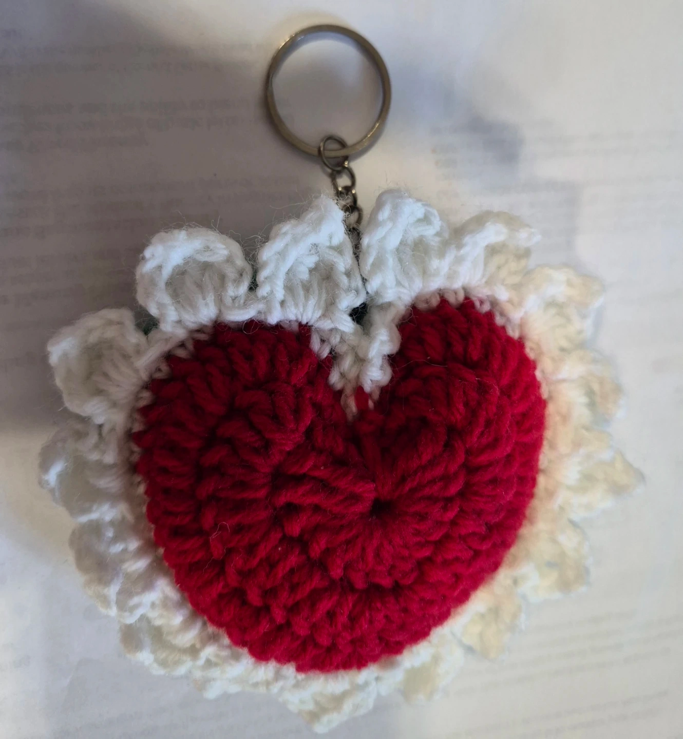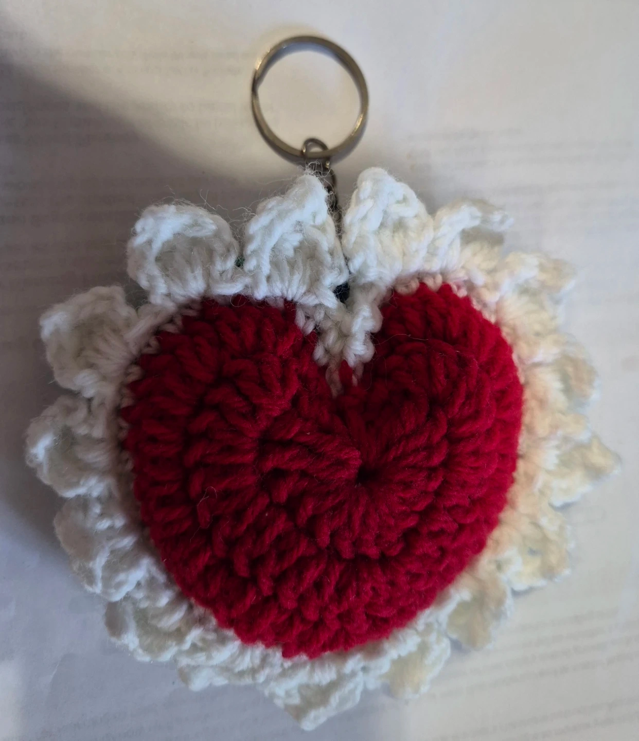 Handmade crocheted keychain featuring a red heart with a white ruffled edge. It's a sweet accessory for your keys or bag!it's big size