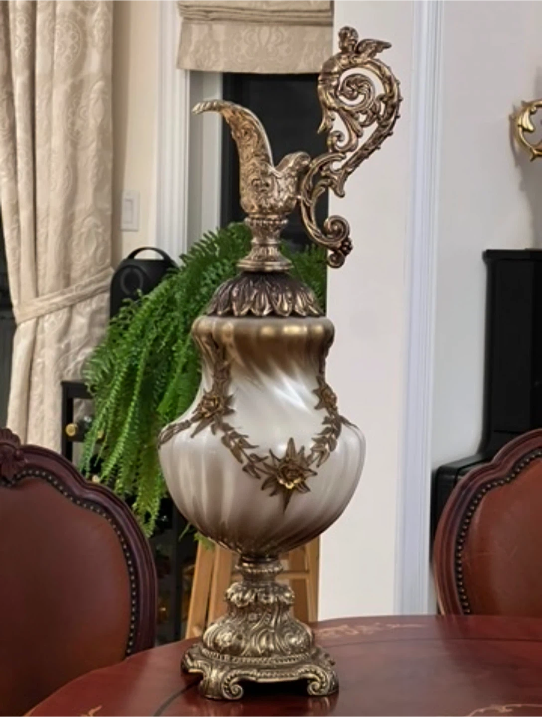 This is a beautiful, ornate decorative urn. It features intricate gold detailing and a unique design. It would make a stunning addition to any home decor