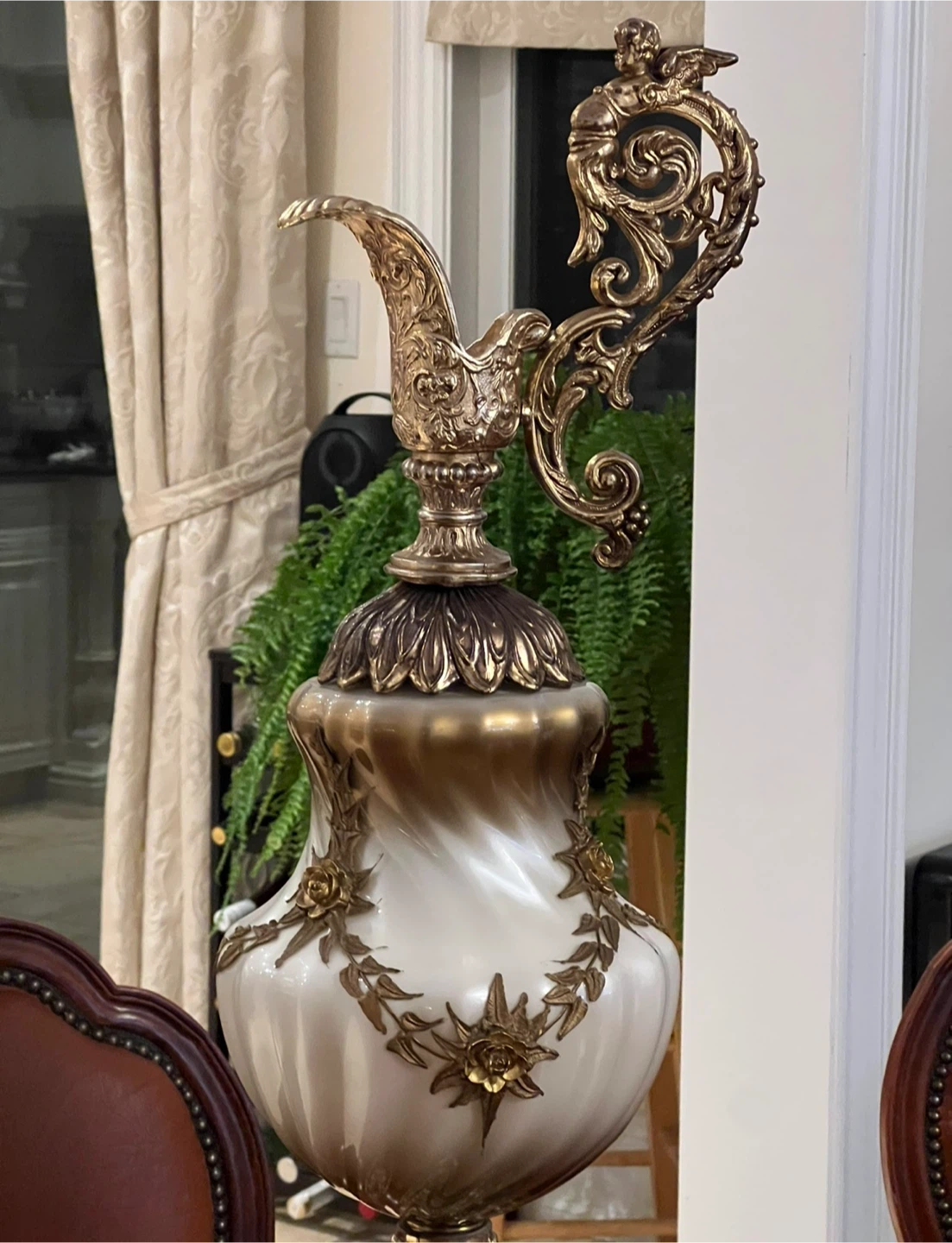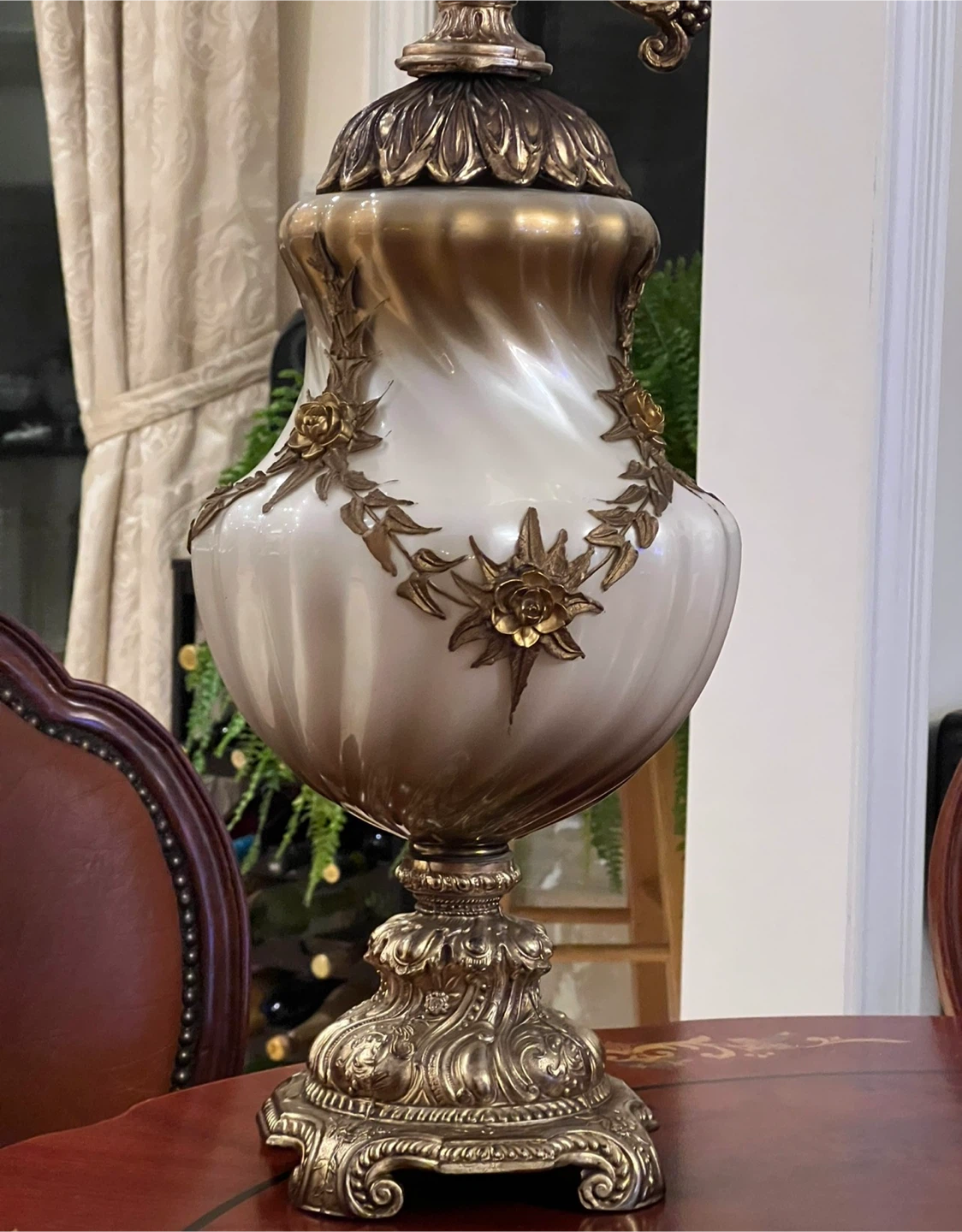 This is a beautiful, ornate decorative urn. It features intricate gold detailing and a unique design. It would make a stunning addition to any home decor