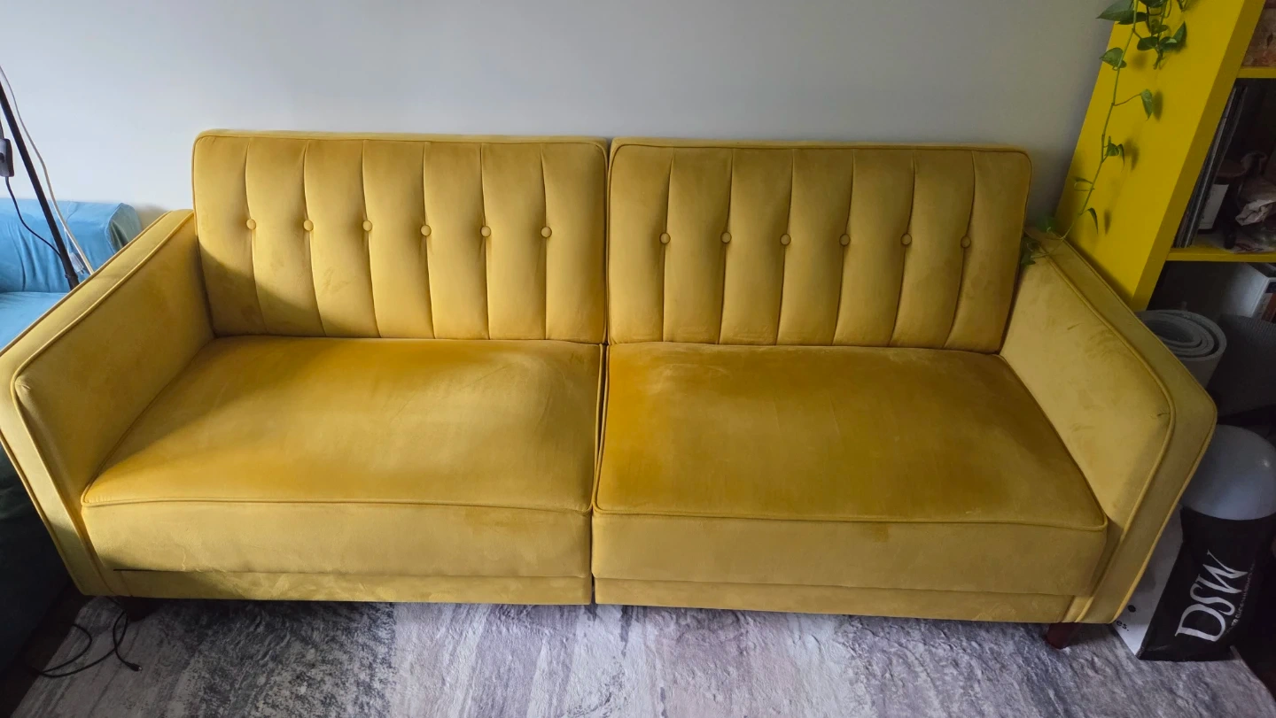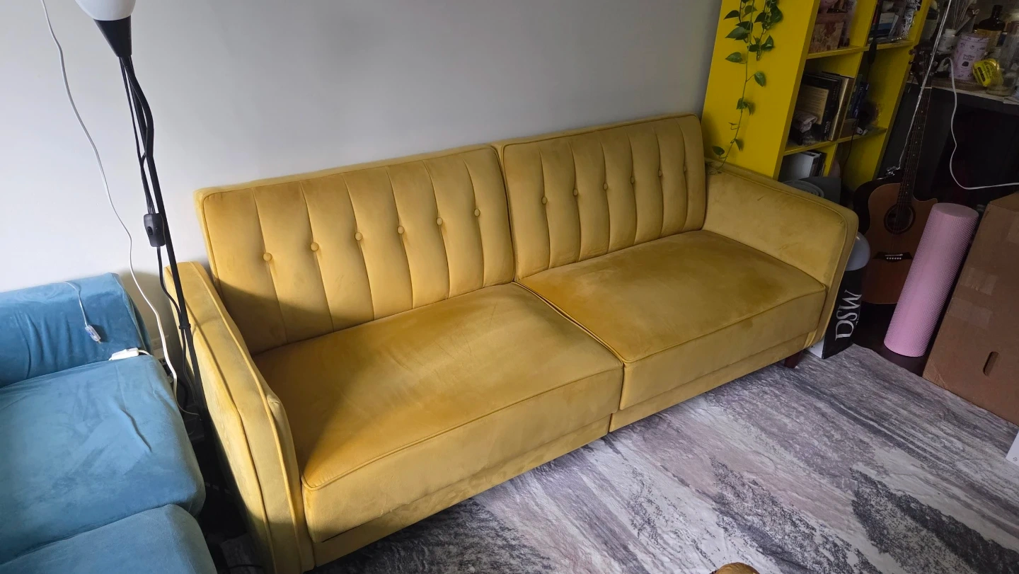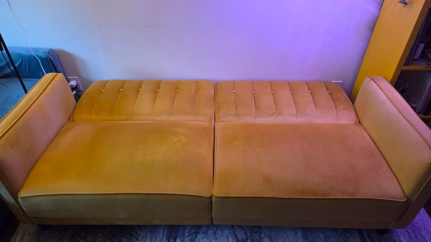 This is a tufted velvet sofa in a mustard yellow colour. It's split into two cushions for the seat and back. Some minor discolouration is present on the top of the backrest.