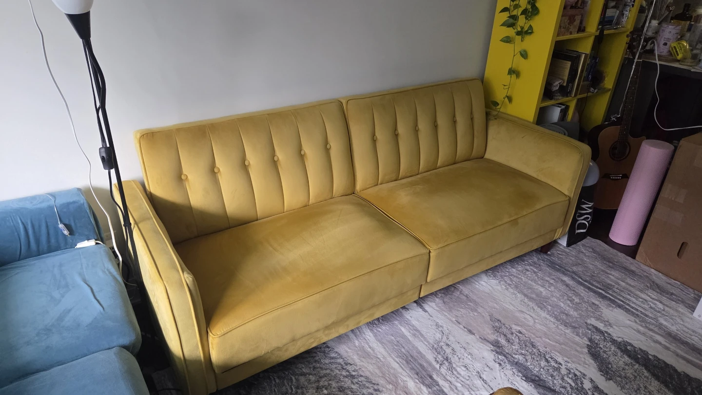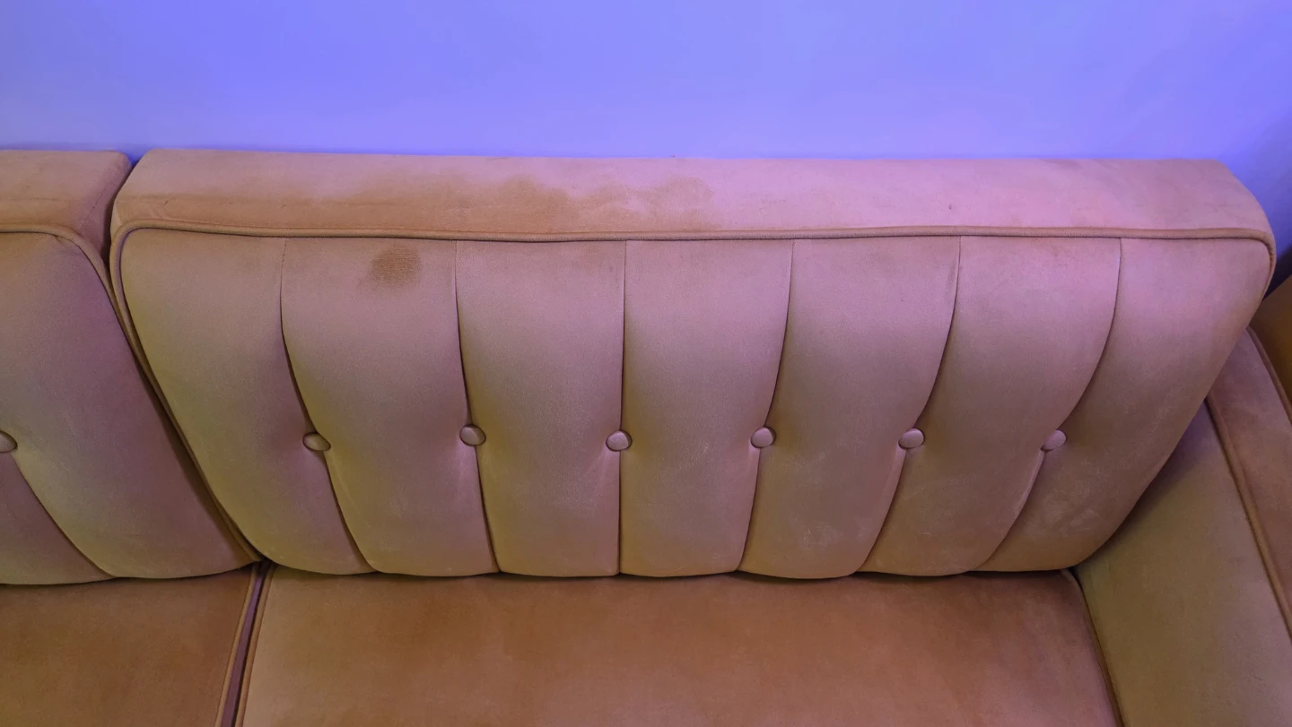 This is a tufted velvet sofa in a mustard yellow colour. It's split into two cushions for the seat and back. Some minor discolouration is present on the top of the backrest.
