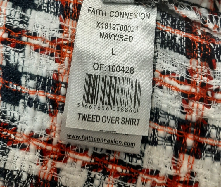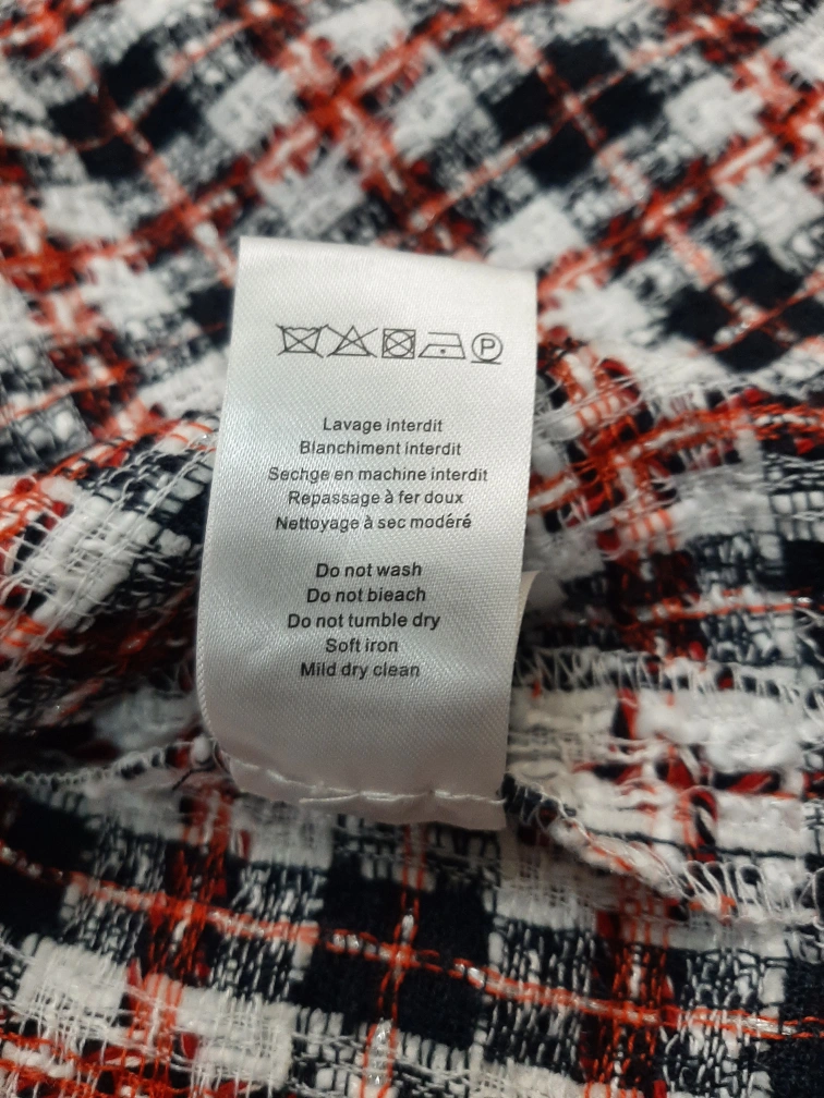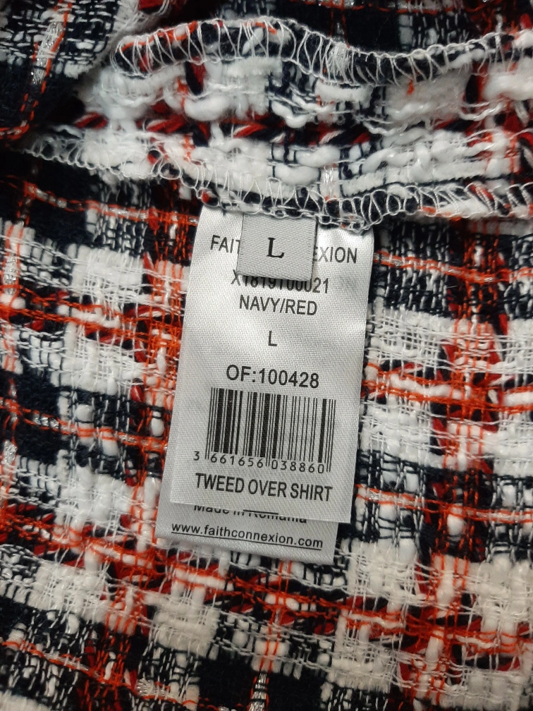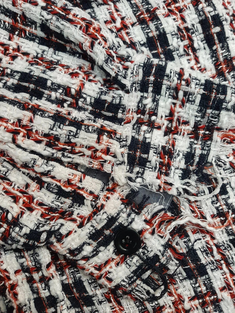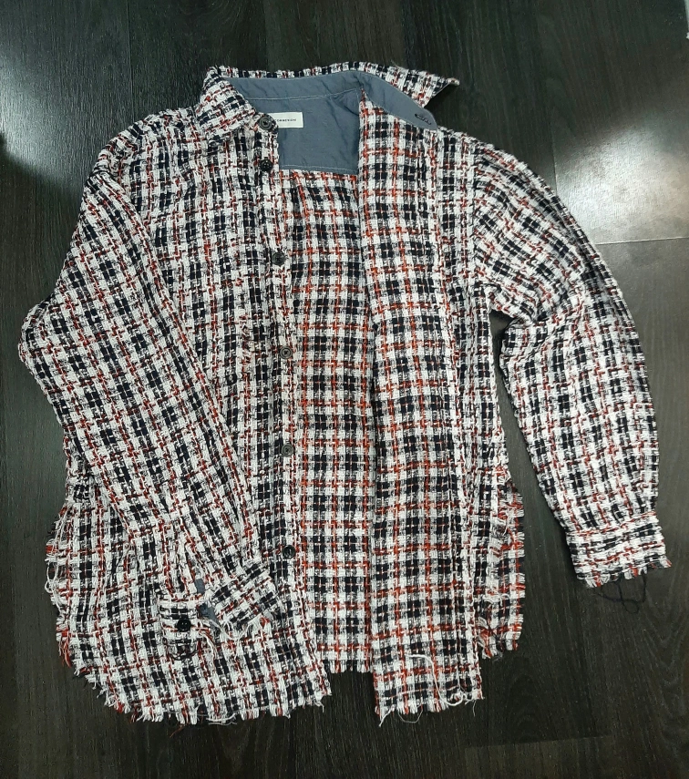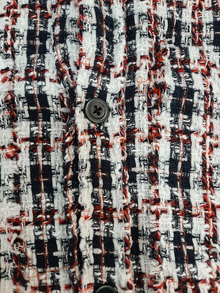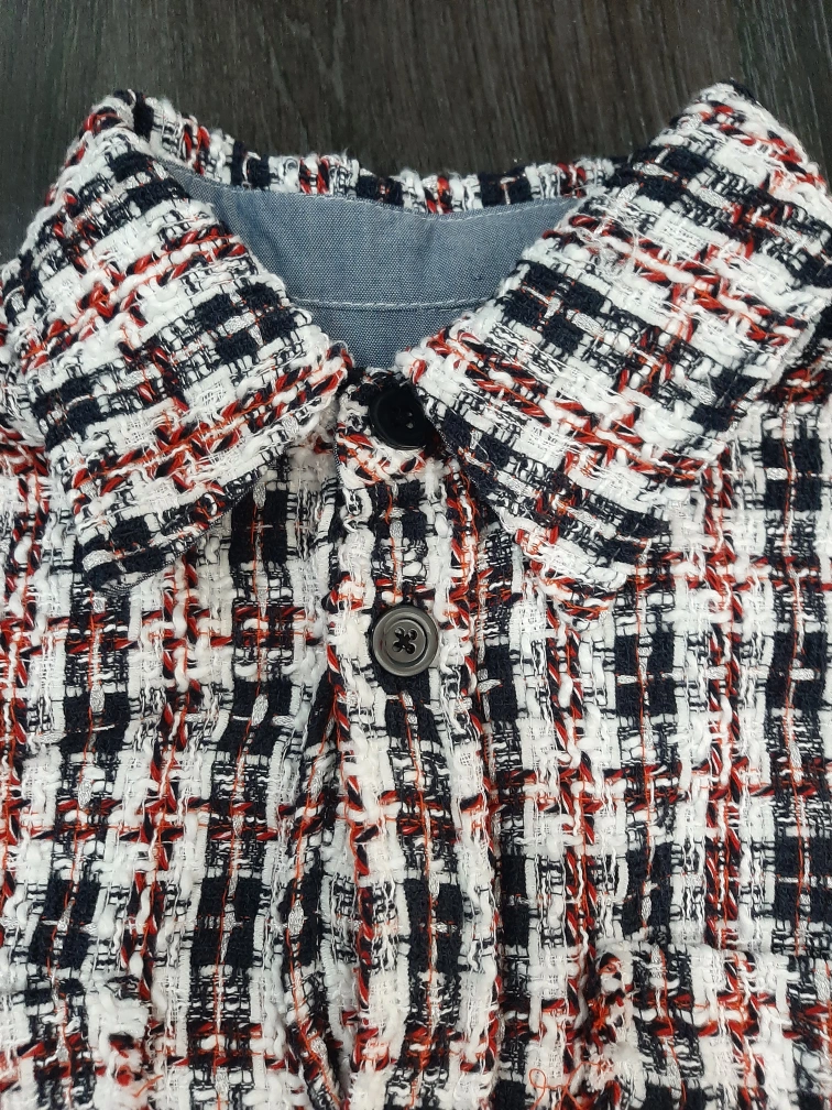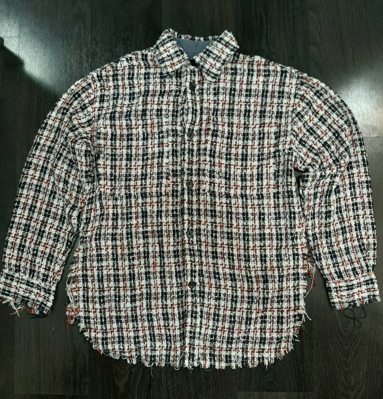 Beautiful oversized overshirt. Features a collar. The fabric seems to be textured with red, black and white threads. Consider it for a cozy evening.