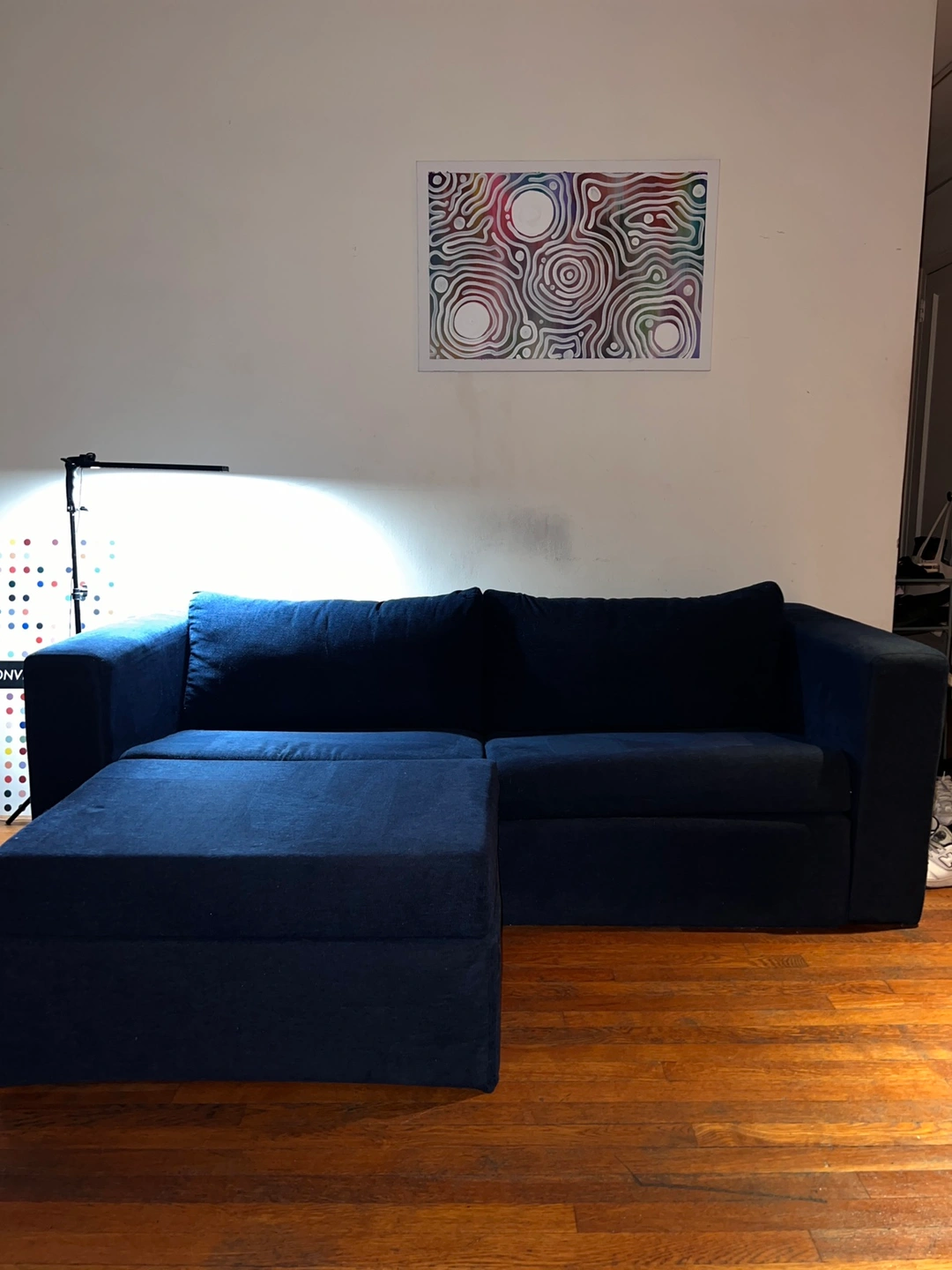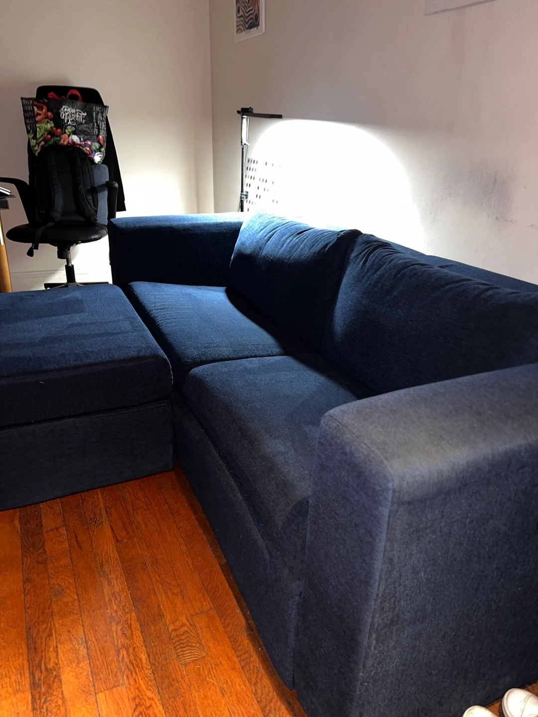 The sofa is made of a soft durable cotton material and comes with a separate ottoman. This sofa seats up to 3 people comfortably and is modular; meaning it can be broken down in easy to move parts. It’s in great condition with minor tears that’s have been repaired. It is the perfect size for a small apartment or living room and easy to transport.