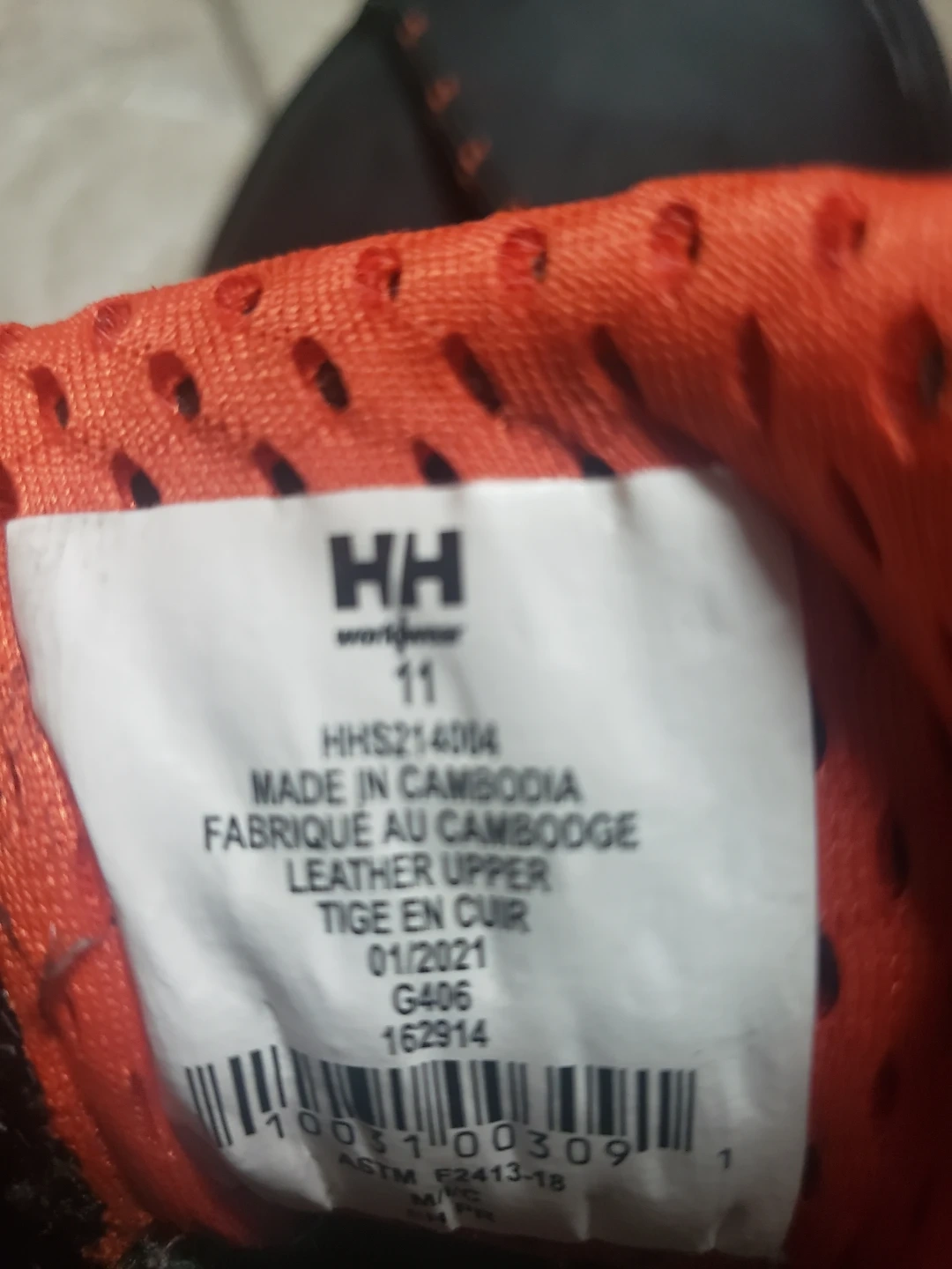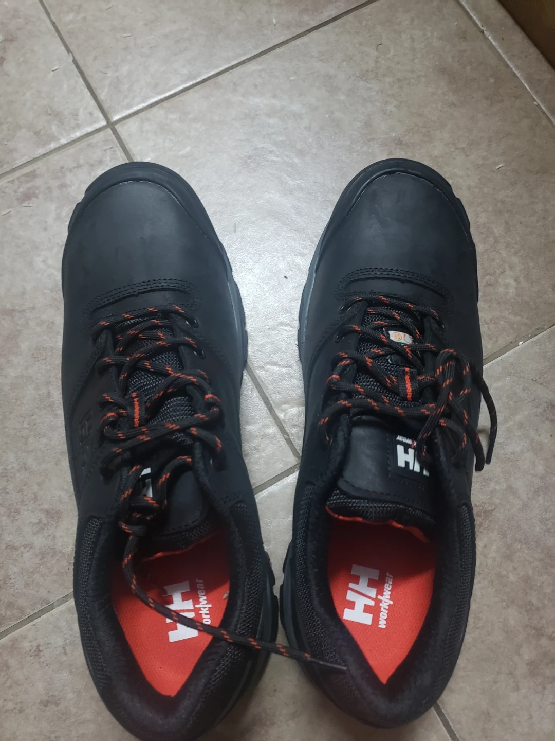 These Helly Hansen safety shoes feature a black leather upper and orange laces. Made in Cambodia, stamped 01/2021. They're size 11.