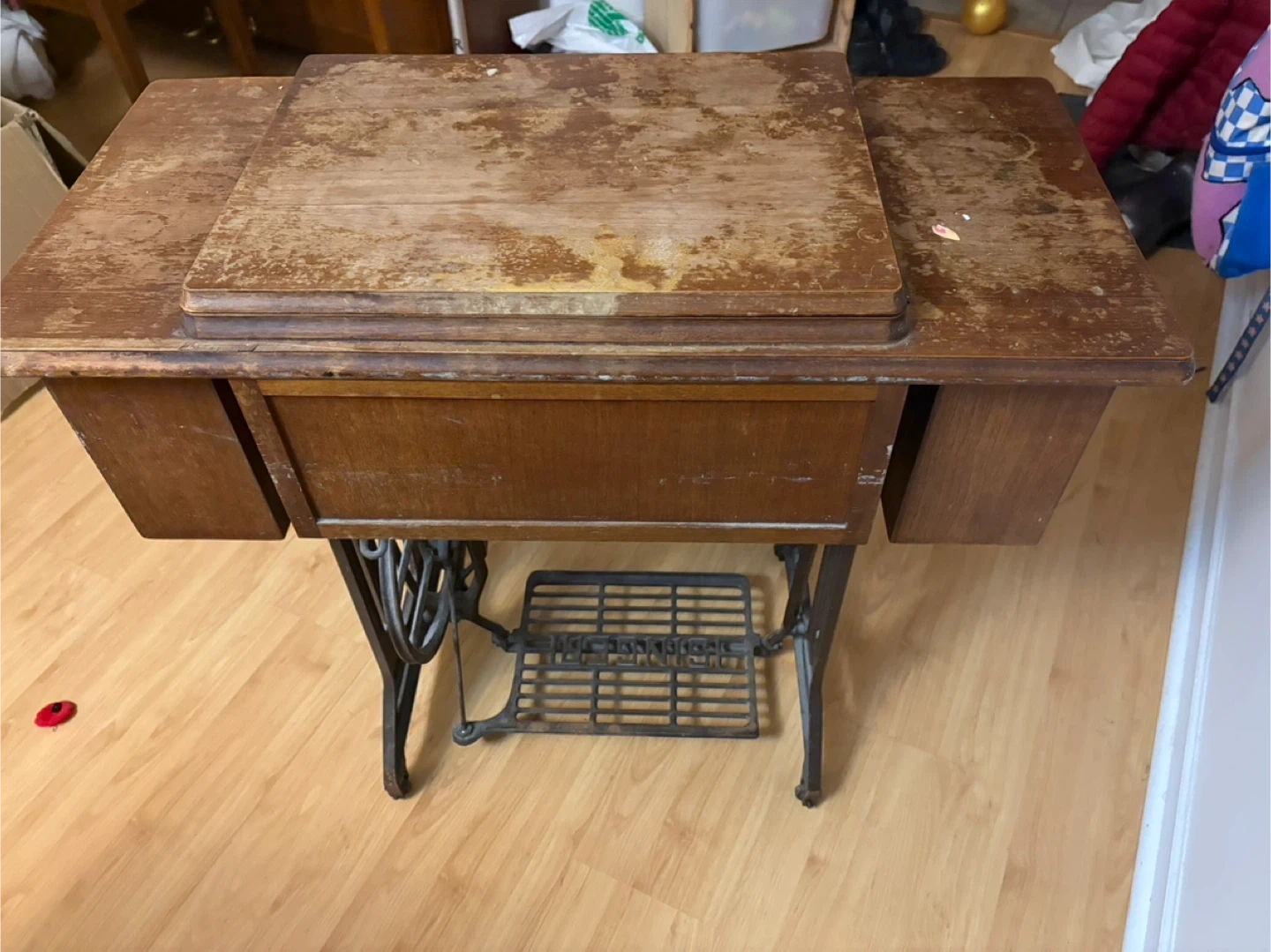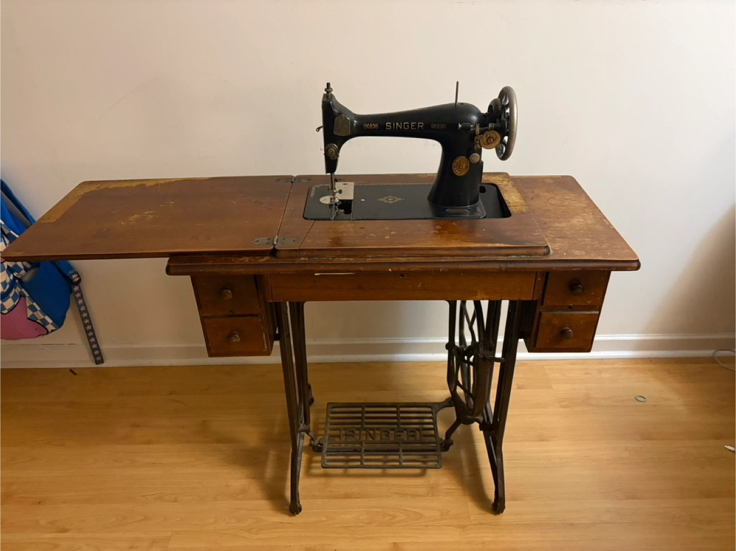 Selling a vintage Singer sewing machine with its original table! It shows signs of wear and tear, but it's a beautiful piece of history. Includes the sewing machine, table, and some accessories as pictured.