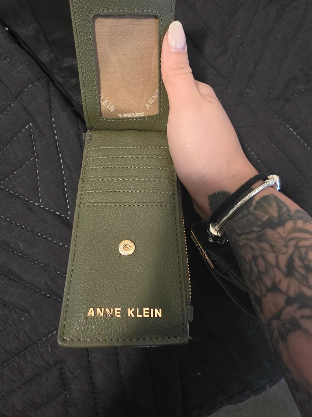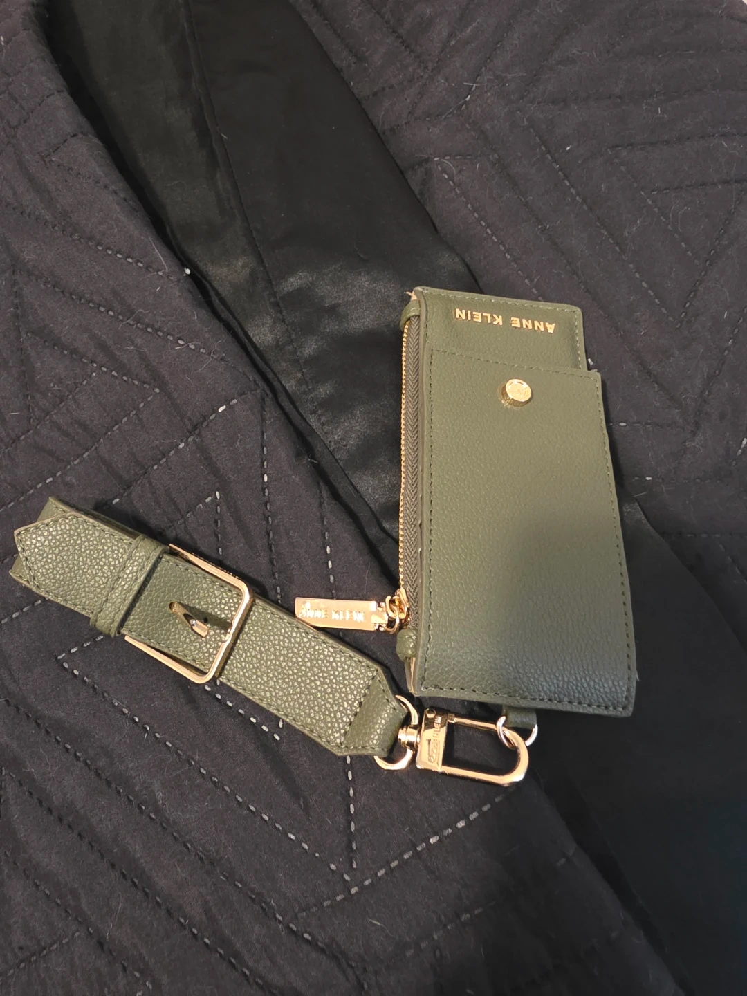 This Anne Klein card holder is a stylish olive green colour. It features multiple card slots and a zippered compartment. It comes with a detachable strap for easy carrying.