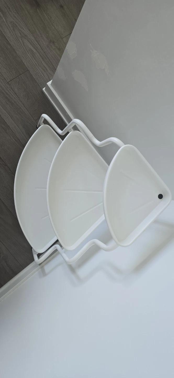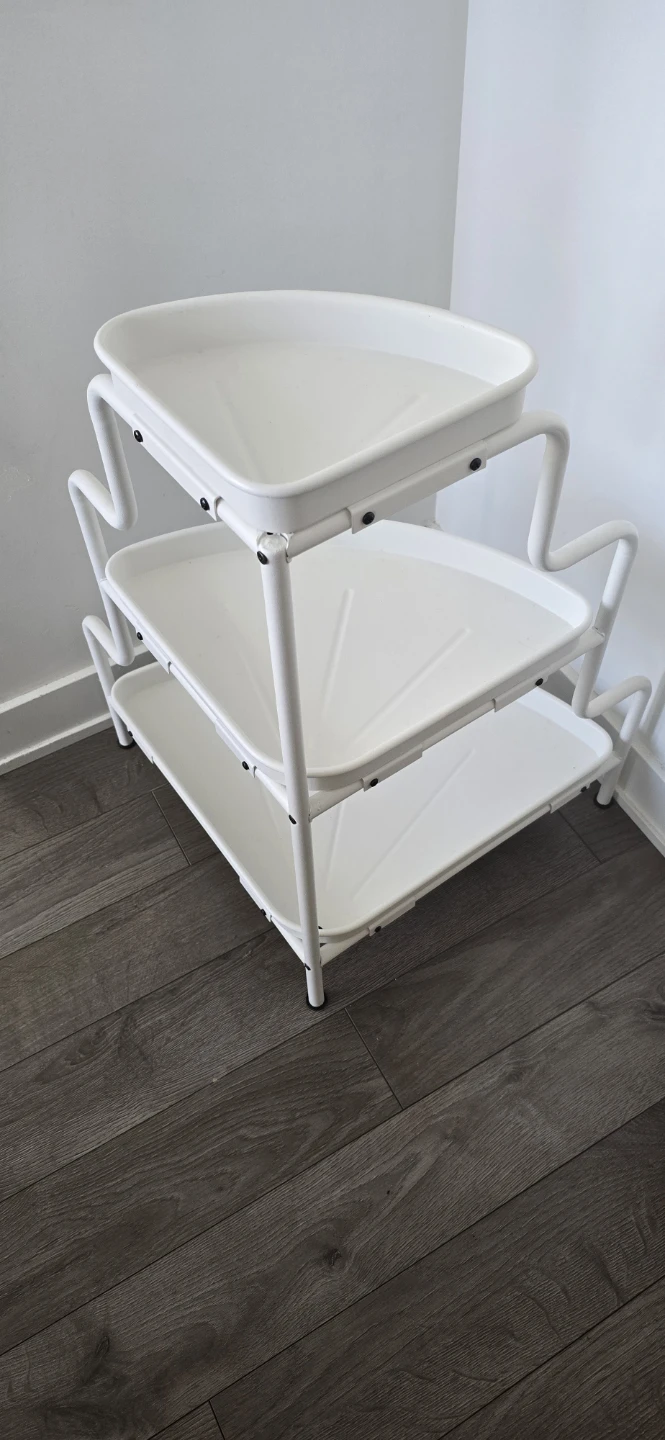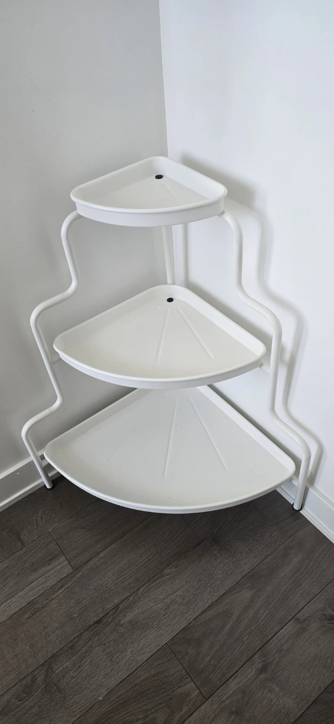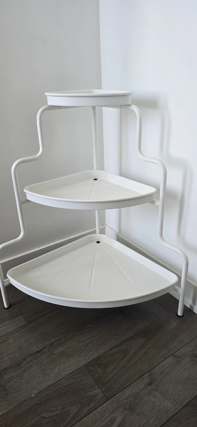 Selling three-tier White IKEA SOCKER corner shelf. It's perfect for adding storage to any corner of your home. The triangular shelves are spaced to hold various items.