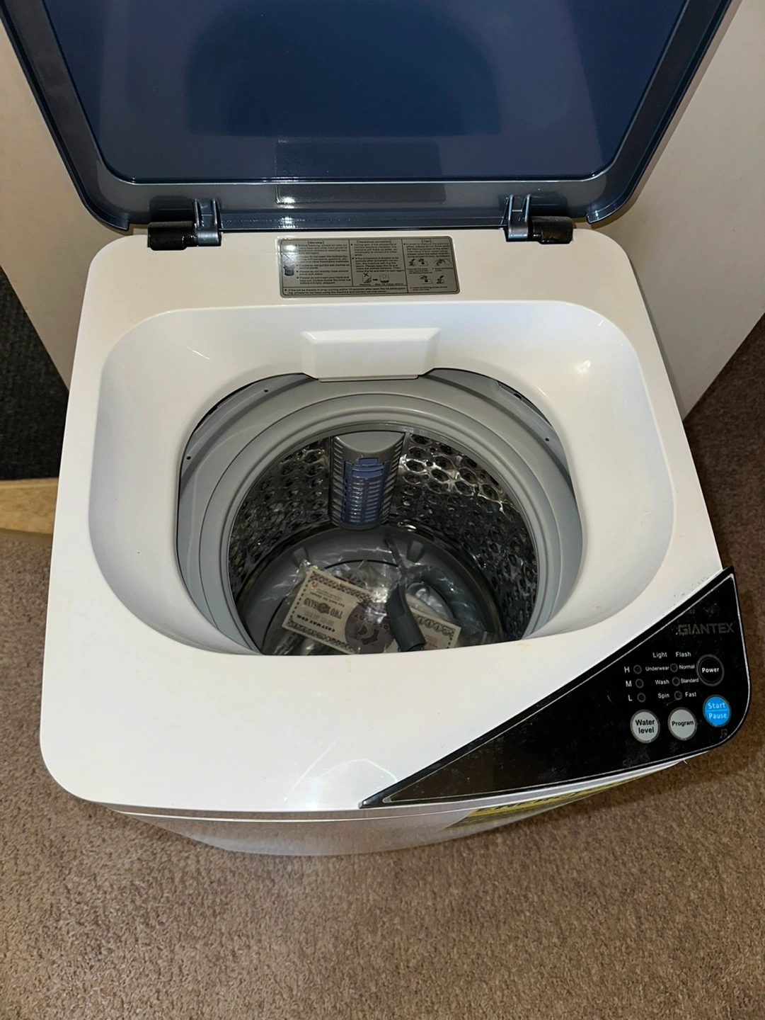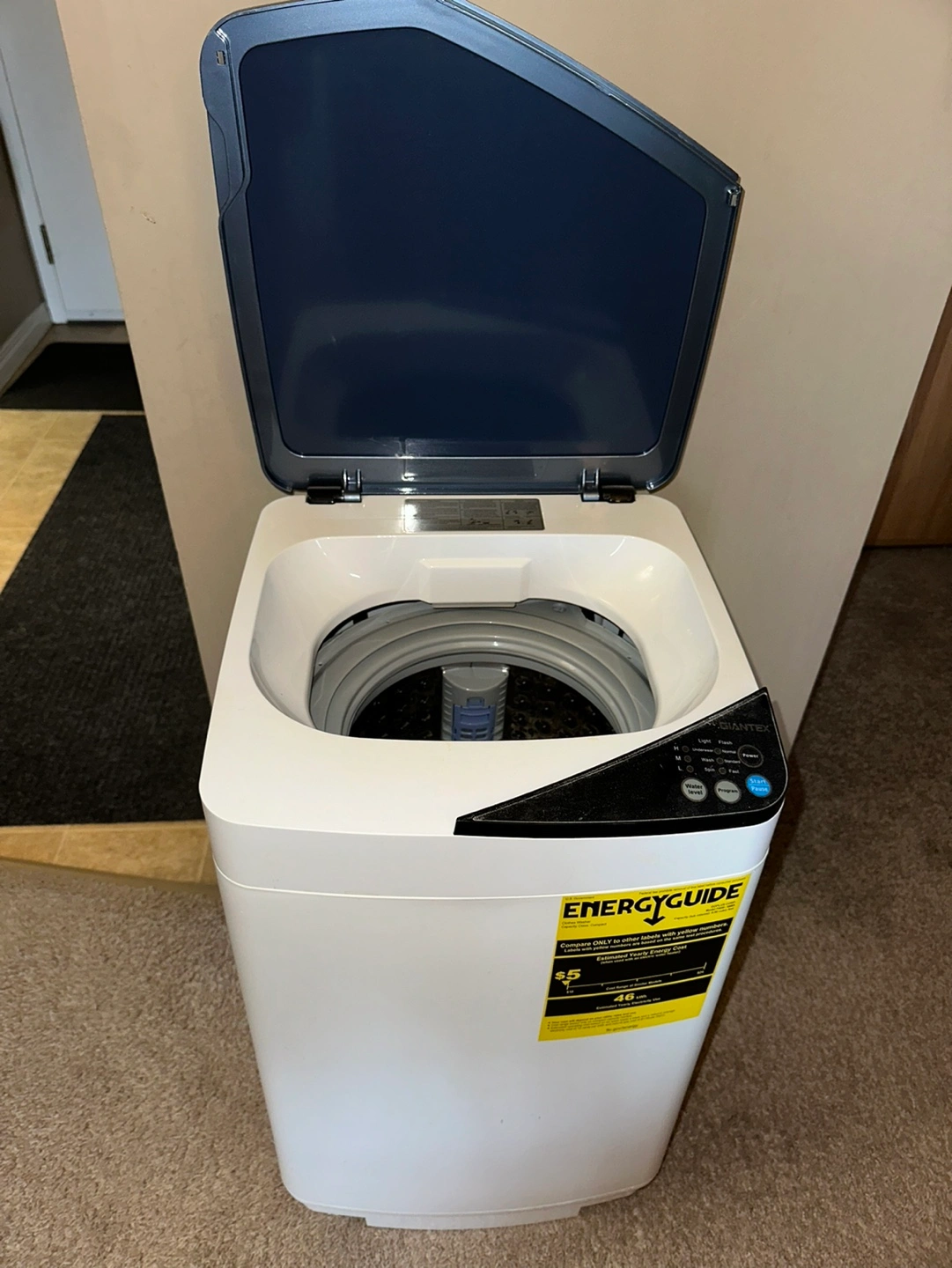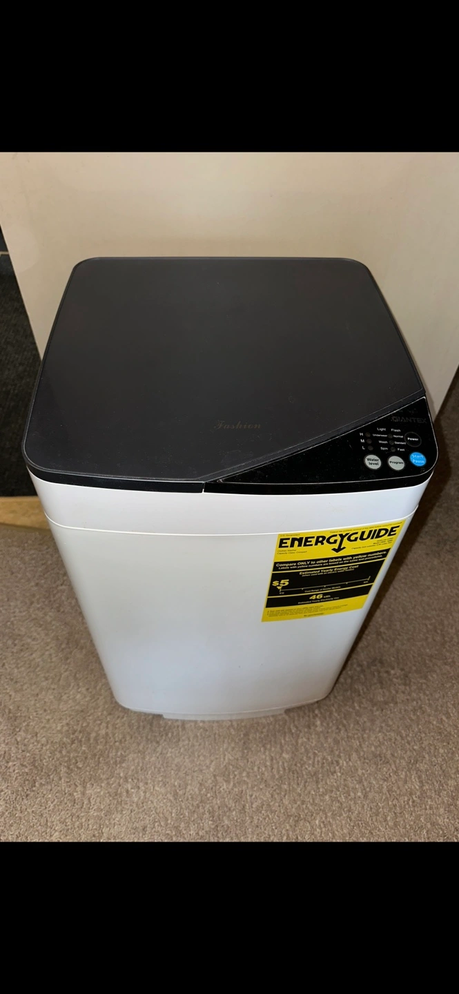 Small portable washing machine. White with a black lid and control panel. Has multiple wash cycles and water levels.