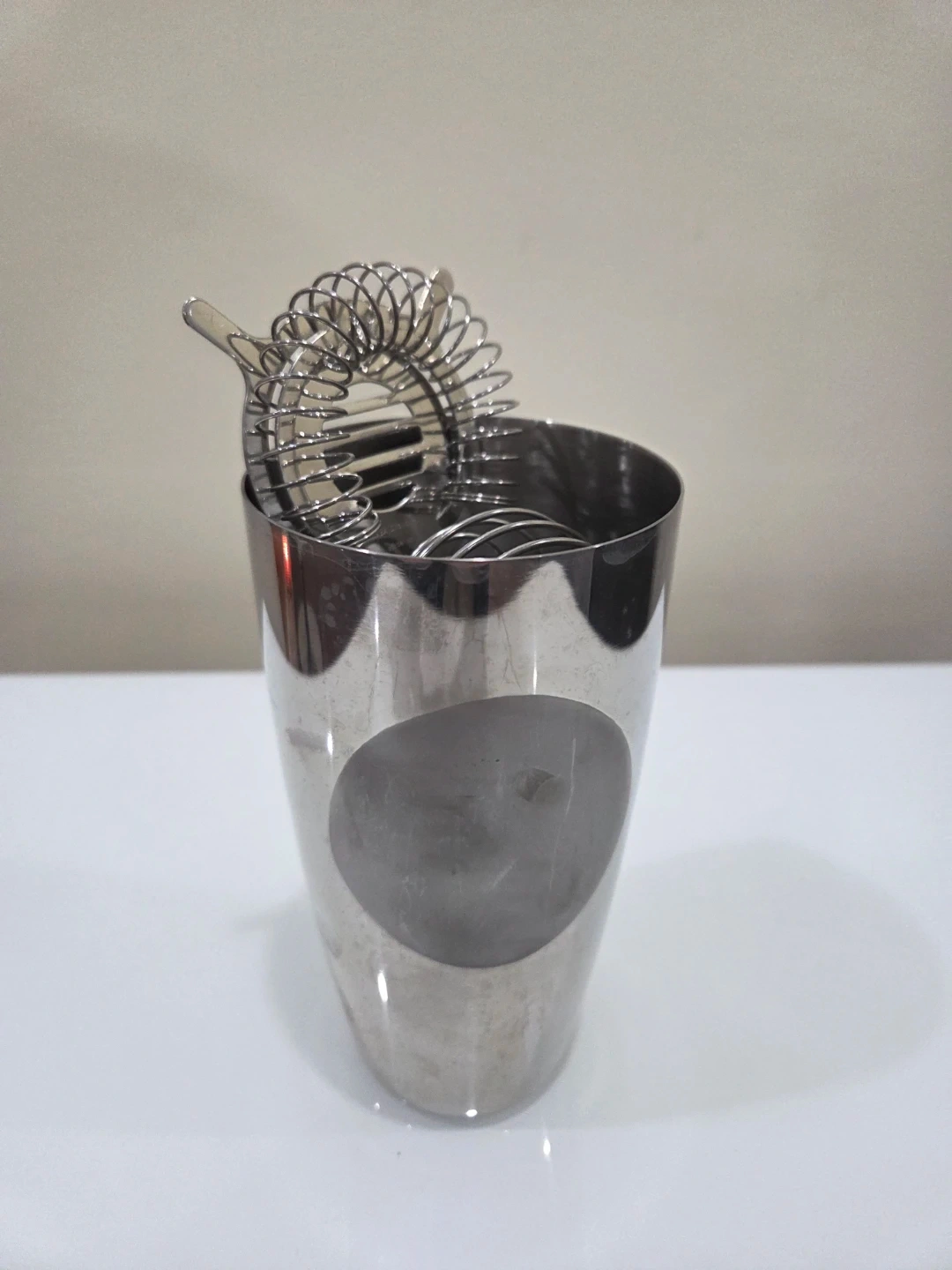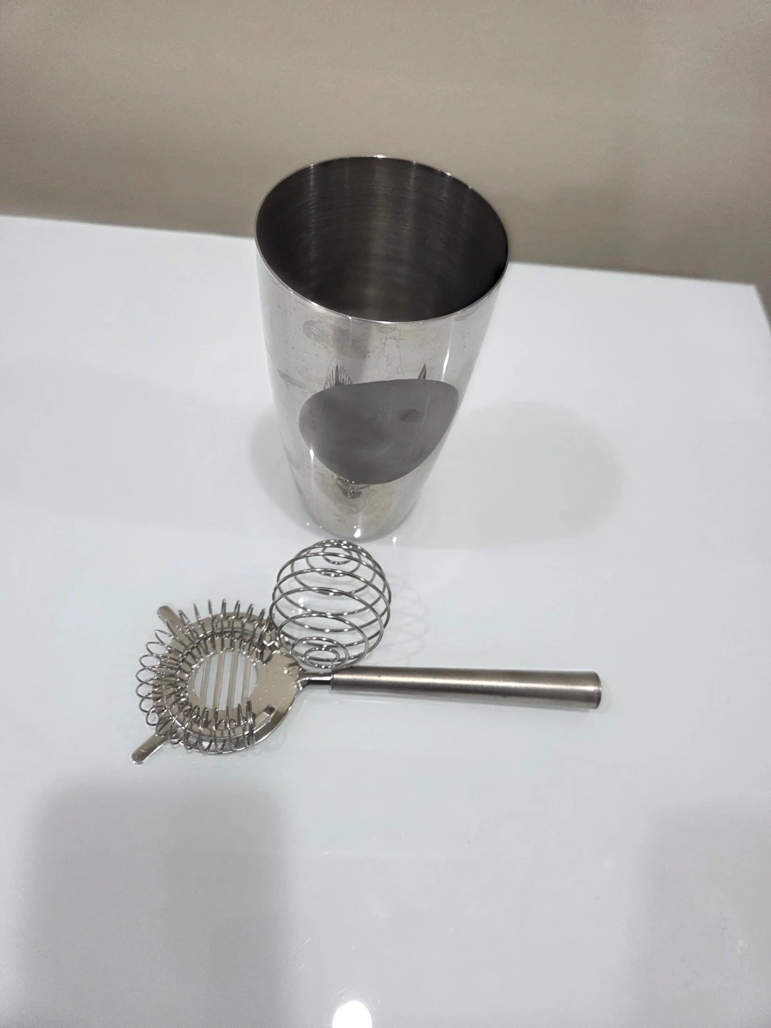 This stainless steel cocktail shaker set includes a shaker tin and a Hawthorne strainer. It's made from durable stainless steel, ready for your next home bartending session! This set is perfect for making classic cocktails at home.