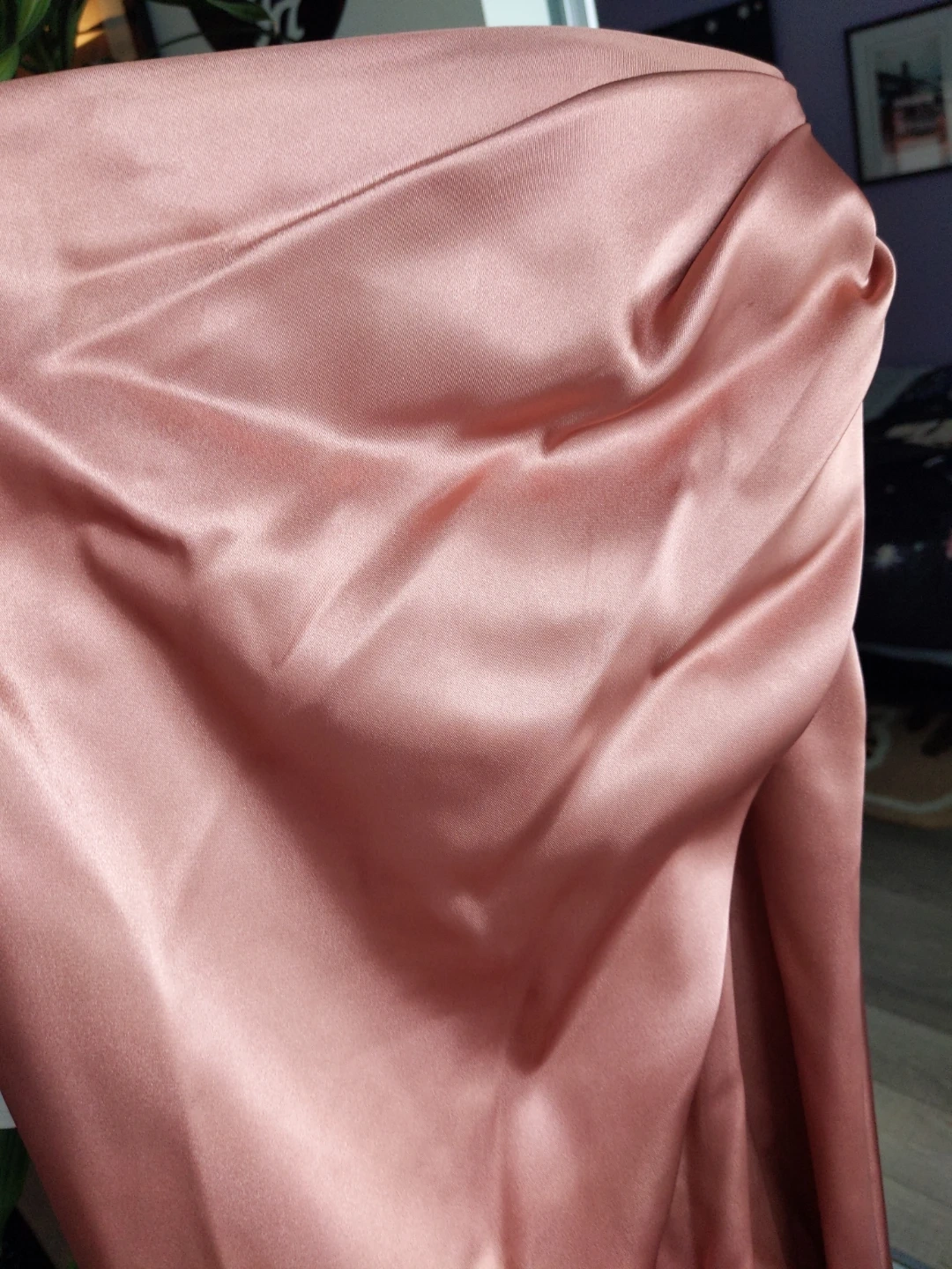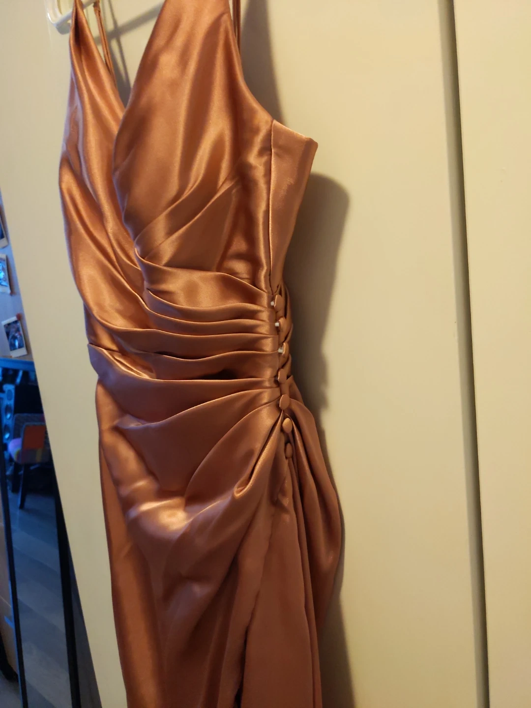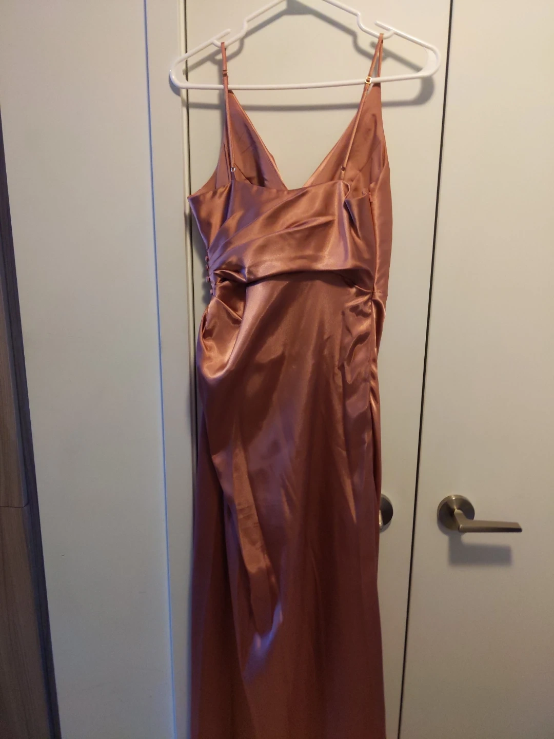 This elegant rose gold satin slip dress features a flattering ruched detail. It's perfect for a formal event or a night out. The fabric has a beautiful sheen.