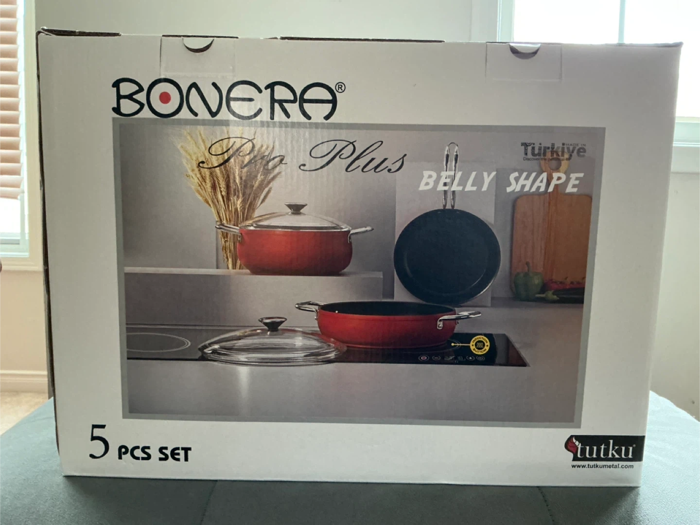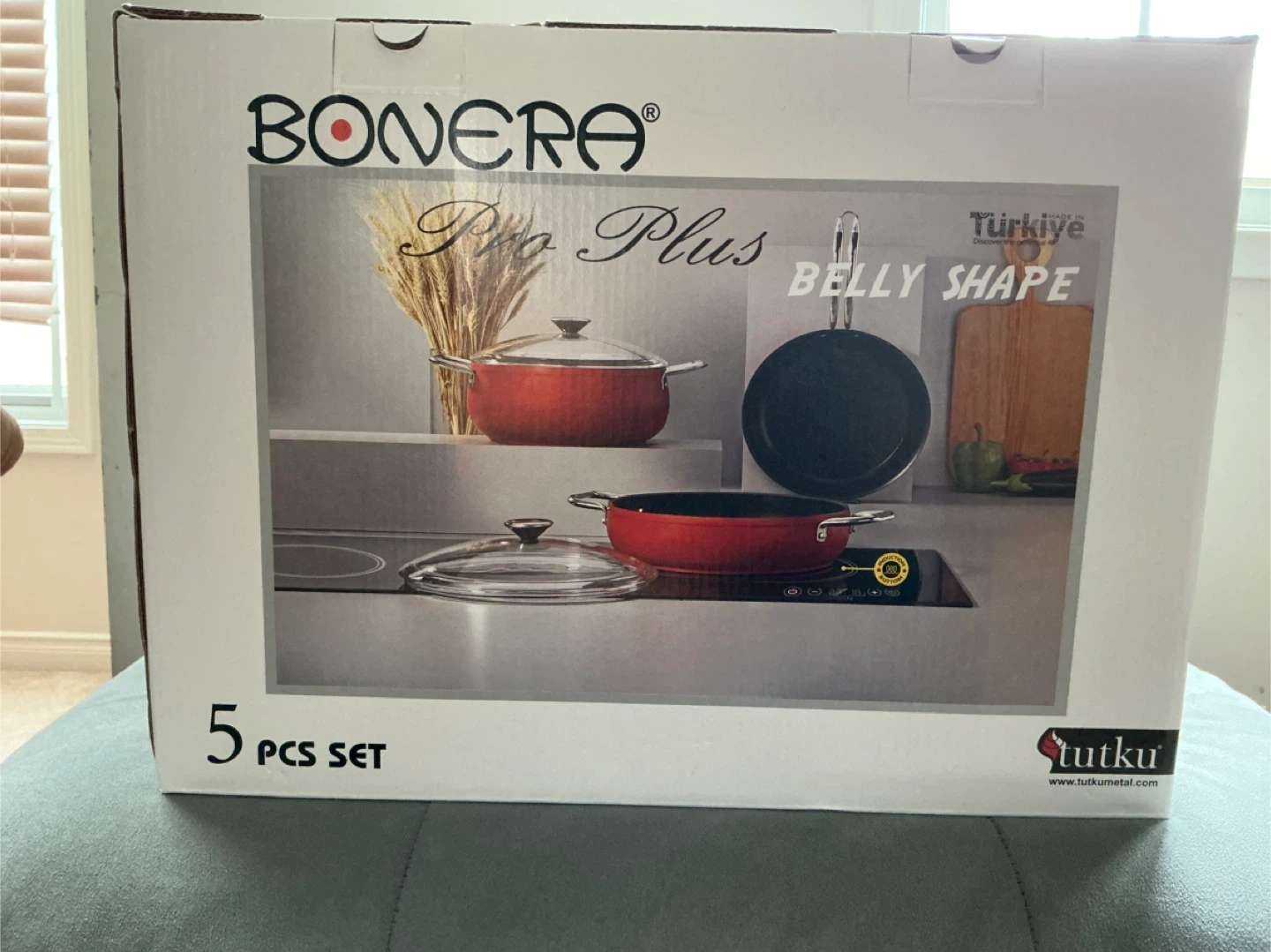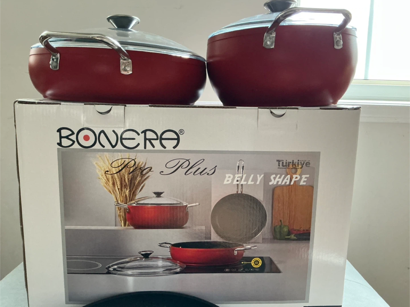 This is a 5-piece cookware set by BONERA from the Pro Plus line. It's designed with a belly shape and comes in a vibrant red colour. Great for everyday cooking tasks!