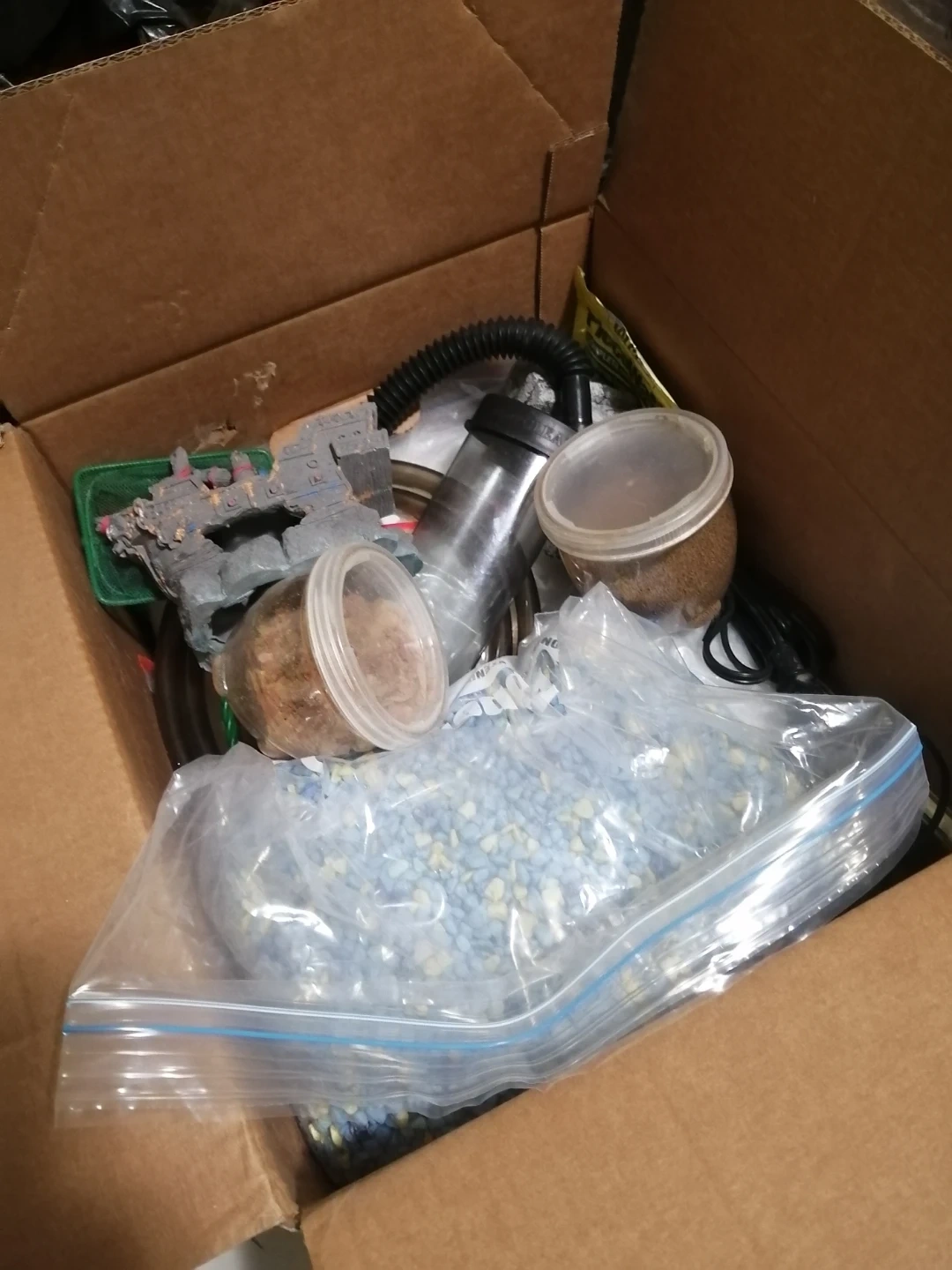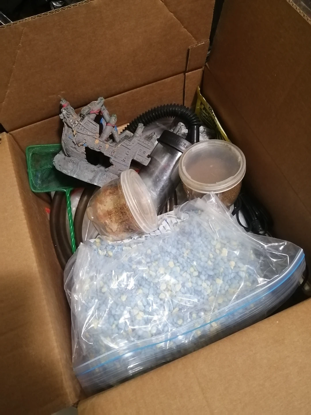 I have a box of fish tank accessories for sale. It includes gravel, decorations, and other items you might need for your aquarium