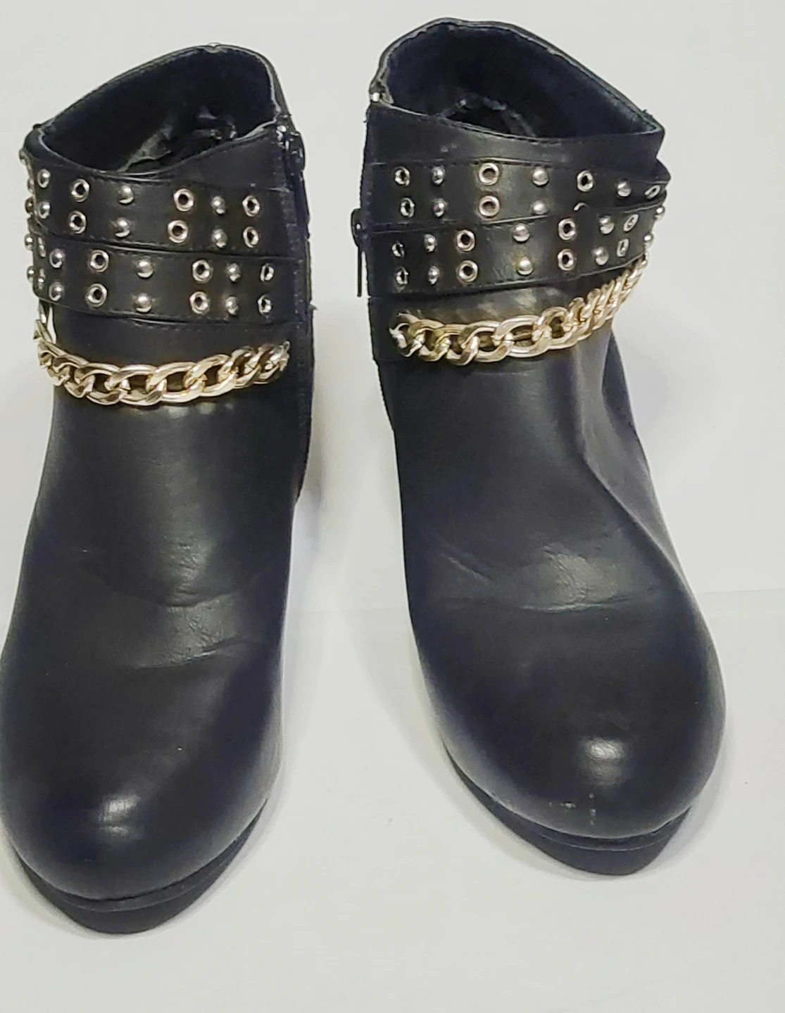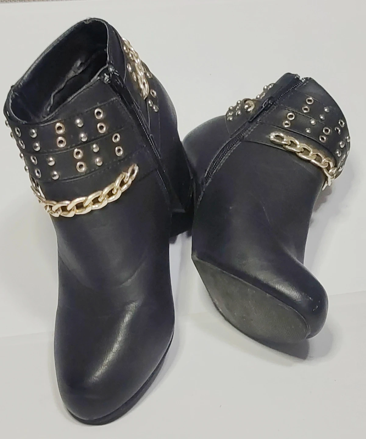 Black faux leather ankle boots featuring a gold chain accent and silver stud detailing. They're a size 8 and have a side zipper for easy on and off. These boots are perfect for adding some edge to any outfit!