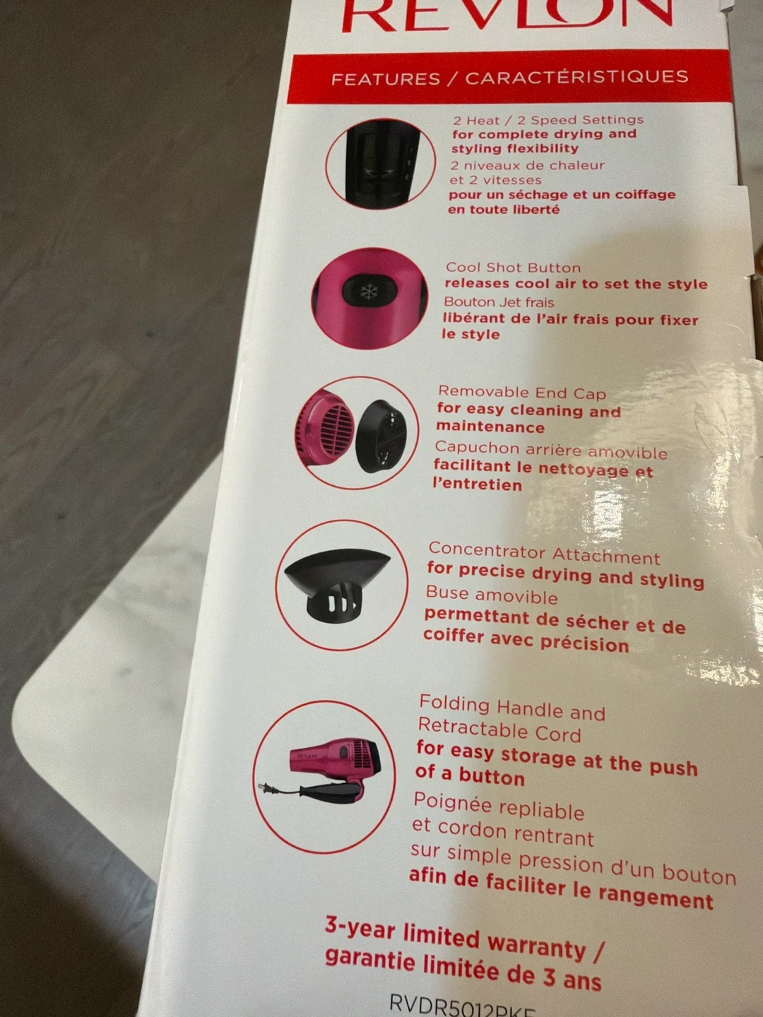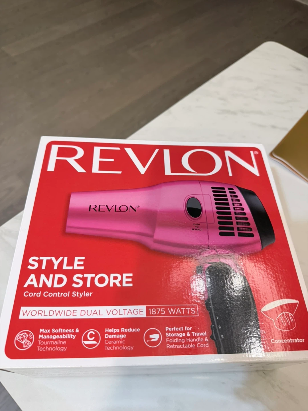 I'm selling a new Revlon Style and Store Cord Control Styler. It has worldwide dual voltage and 1875 watts. It features 2 heat and 2 speed settings for complete drying and styling flexibility. It also has a cool shot button to release cool air to set the style. It has a folding handle and retractable cord for easy storage at the push of a button. The box is included