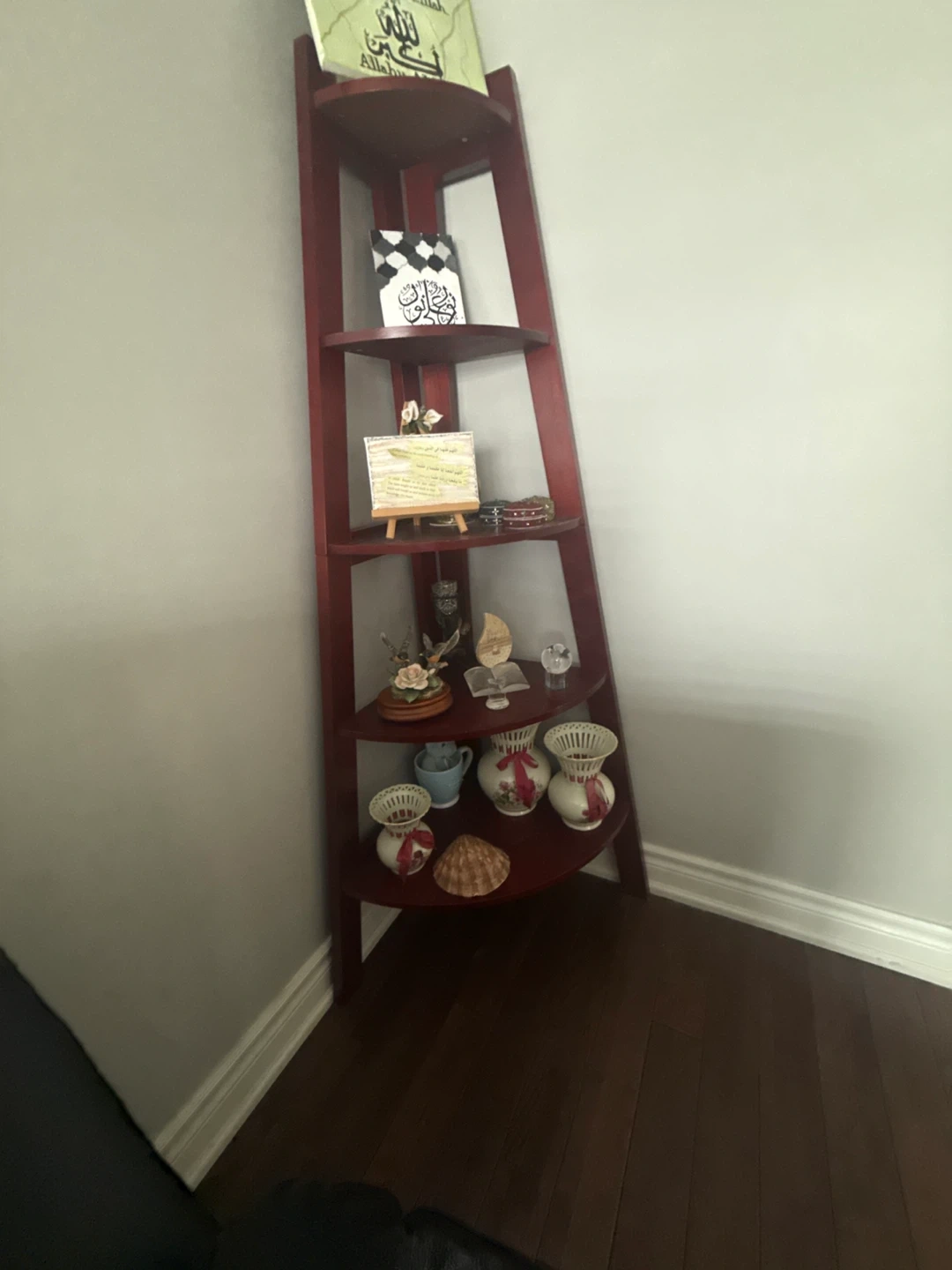 A red wooden corner shelf with four tiers. It's ideal for displaying decorative items or small books. This shelf fits neatly into any corner of your home.each $50