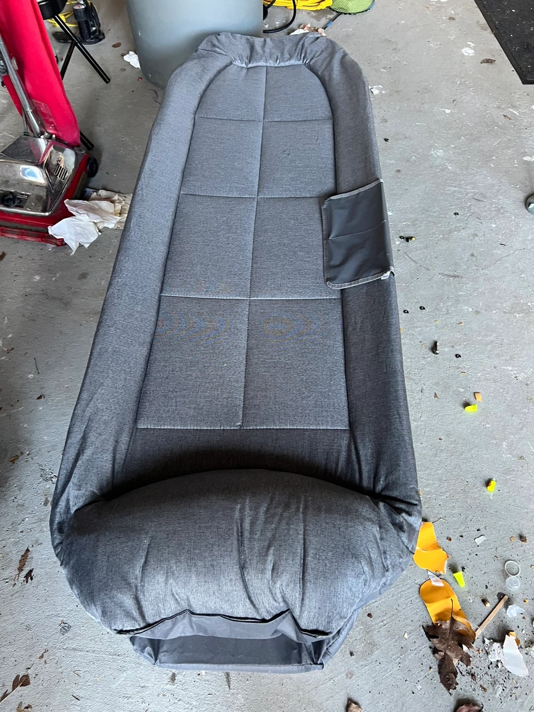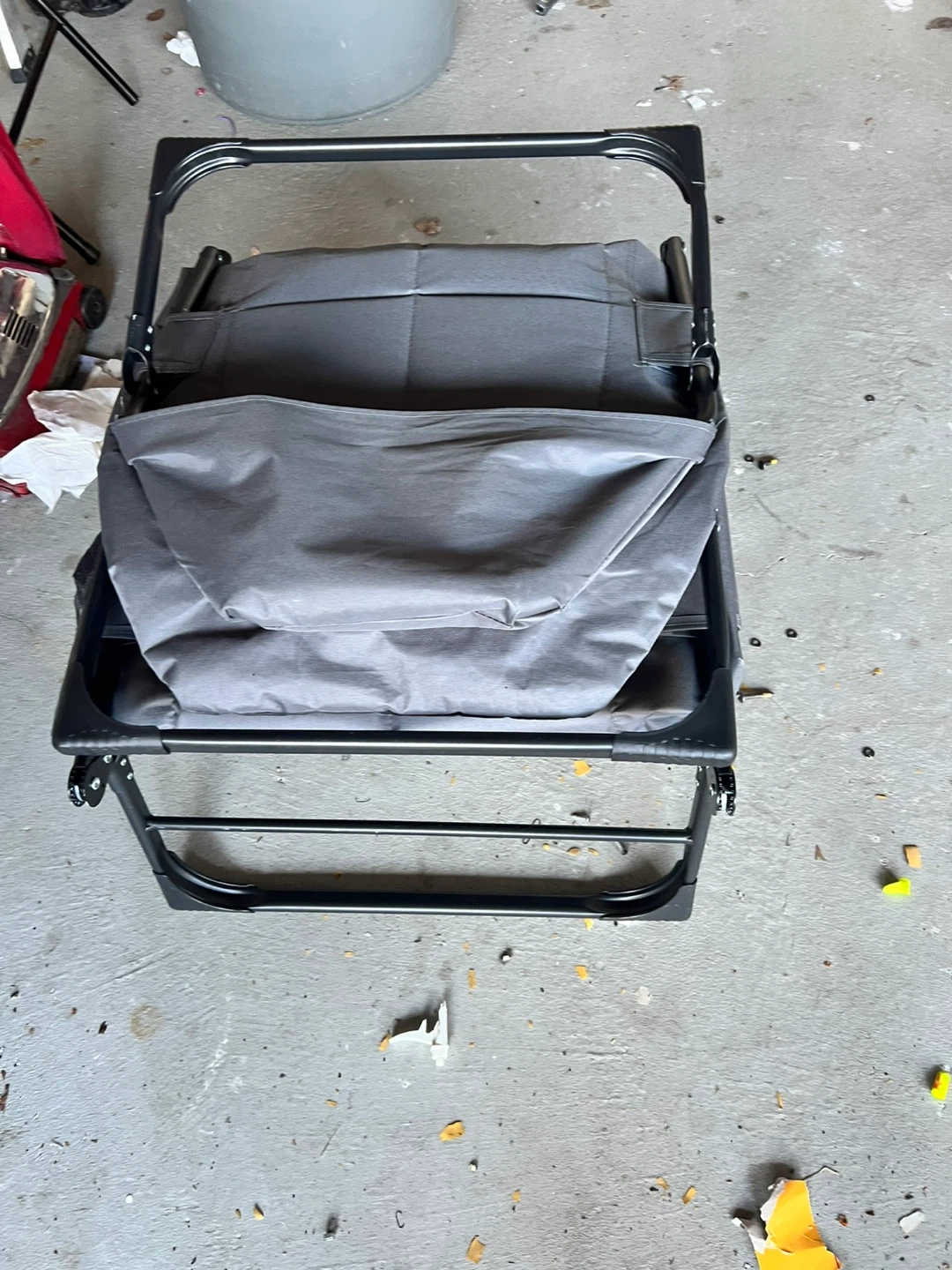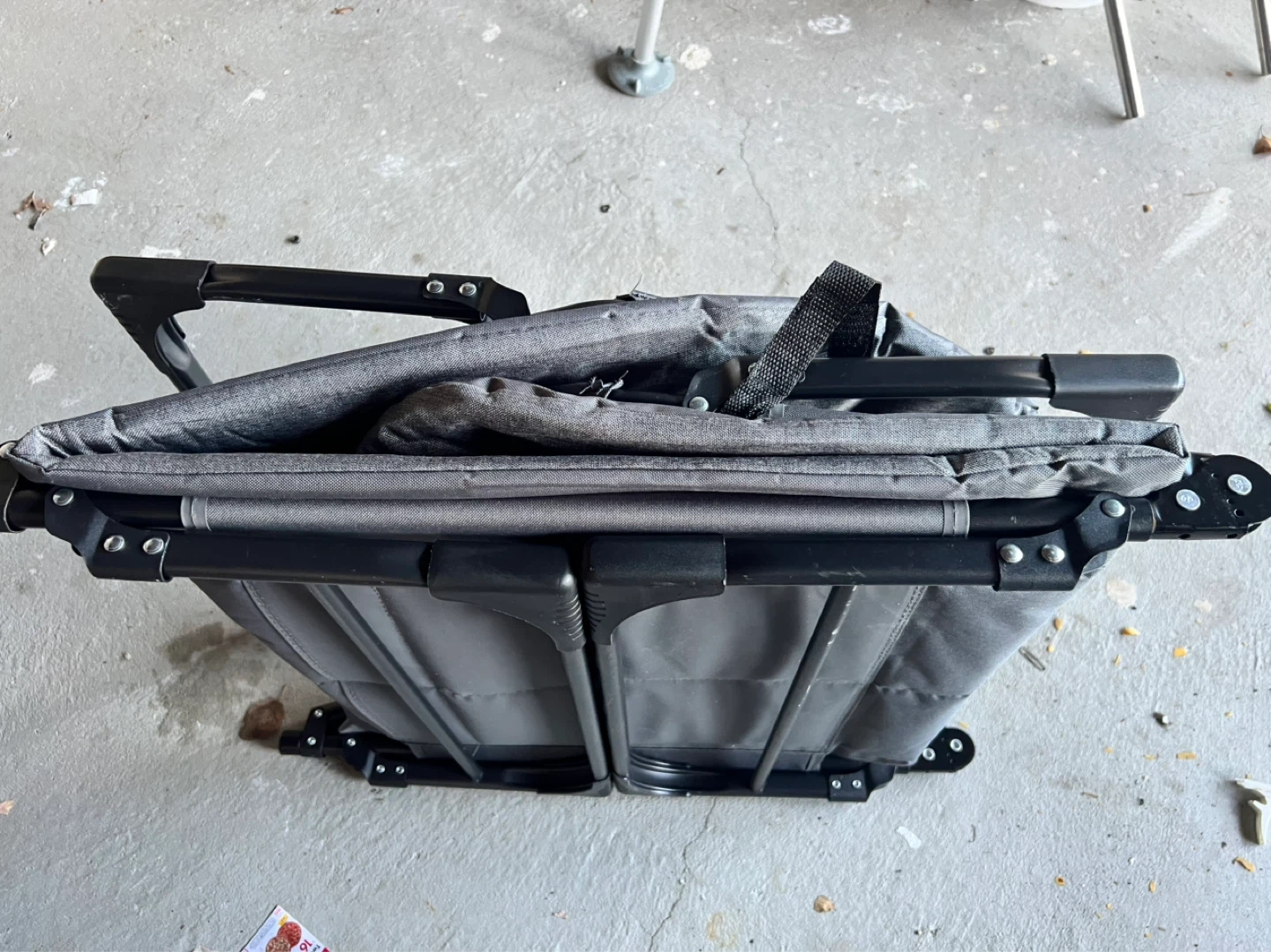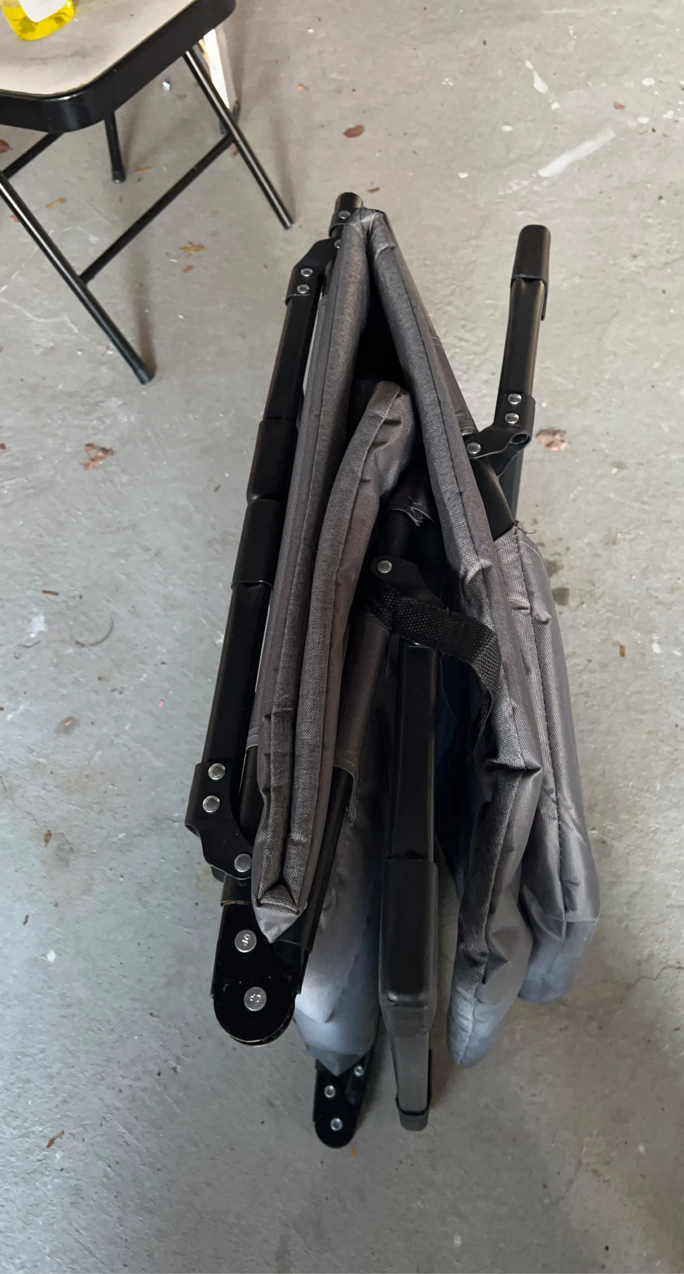 Grey folding camp chair with a durable metal frame. It's made of fabric and folds up compactly for easy transport. This chair is great for camping trips or outdoor events.