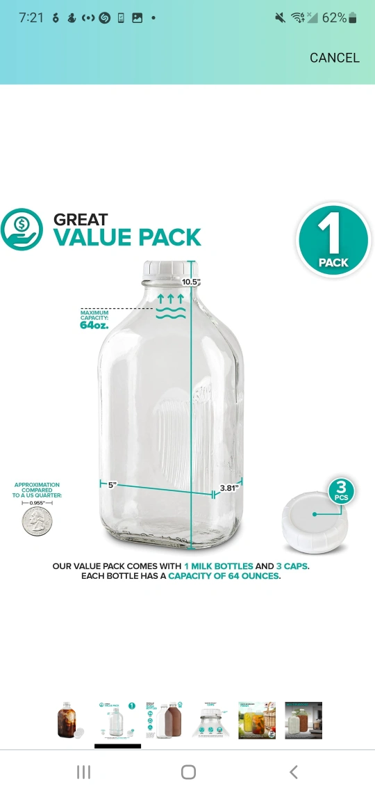I'm selling a 64oz glass milk bottle! It comes with 3 caps. It has a maximum capacity of 64 ounces and is approximately 10.5 inches tall and 5 inches wide