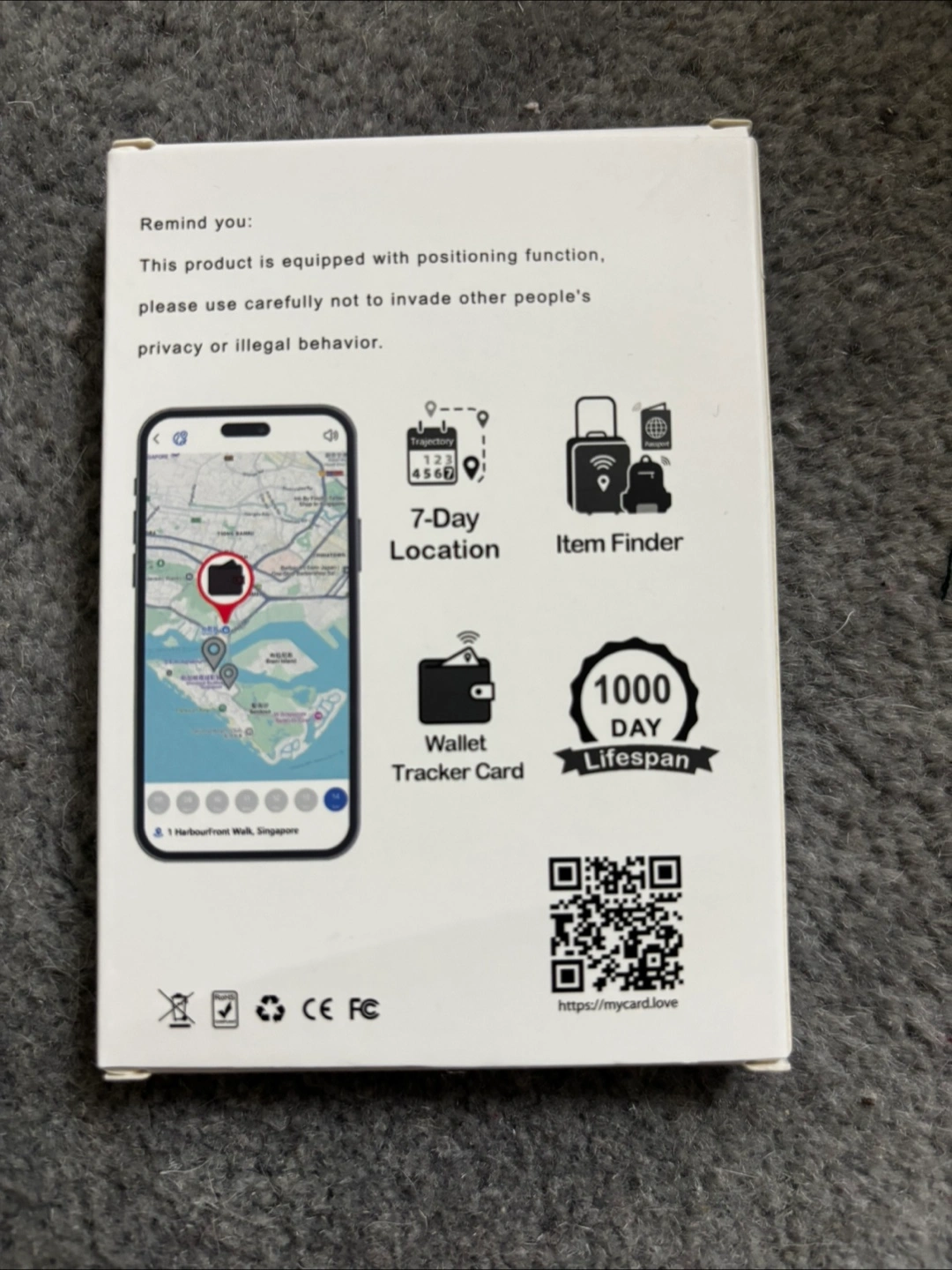 7-day location tracking. Works with iOS & Android. Positioning function. Wallet tracker card. 1000-day lifespan. New, unused. Battery for 3 years