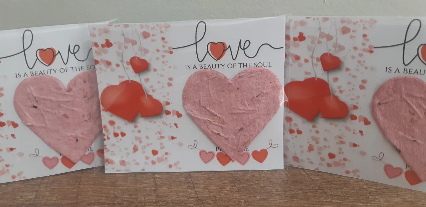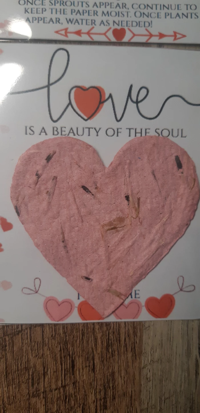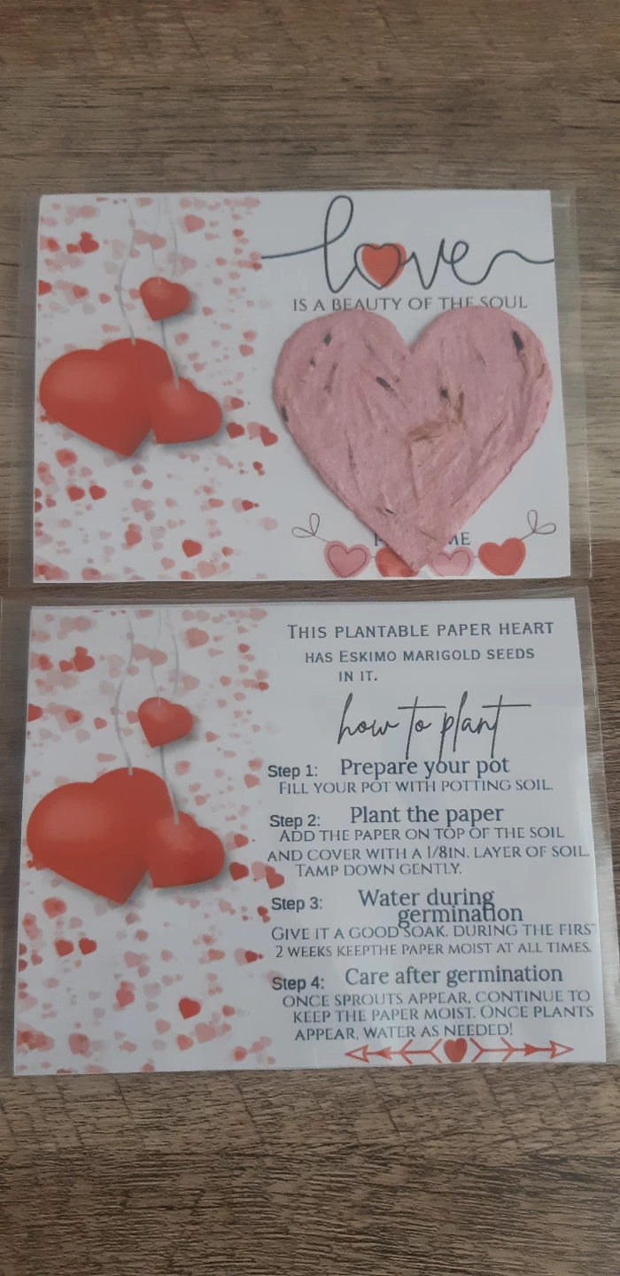 This is a plantable paper heart with Eskimo Marigold seeds embedded. Just plant it in soil and water to grow. It's a lovely way to share some love and watch something beautiful grow!
