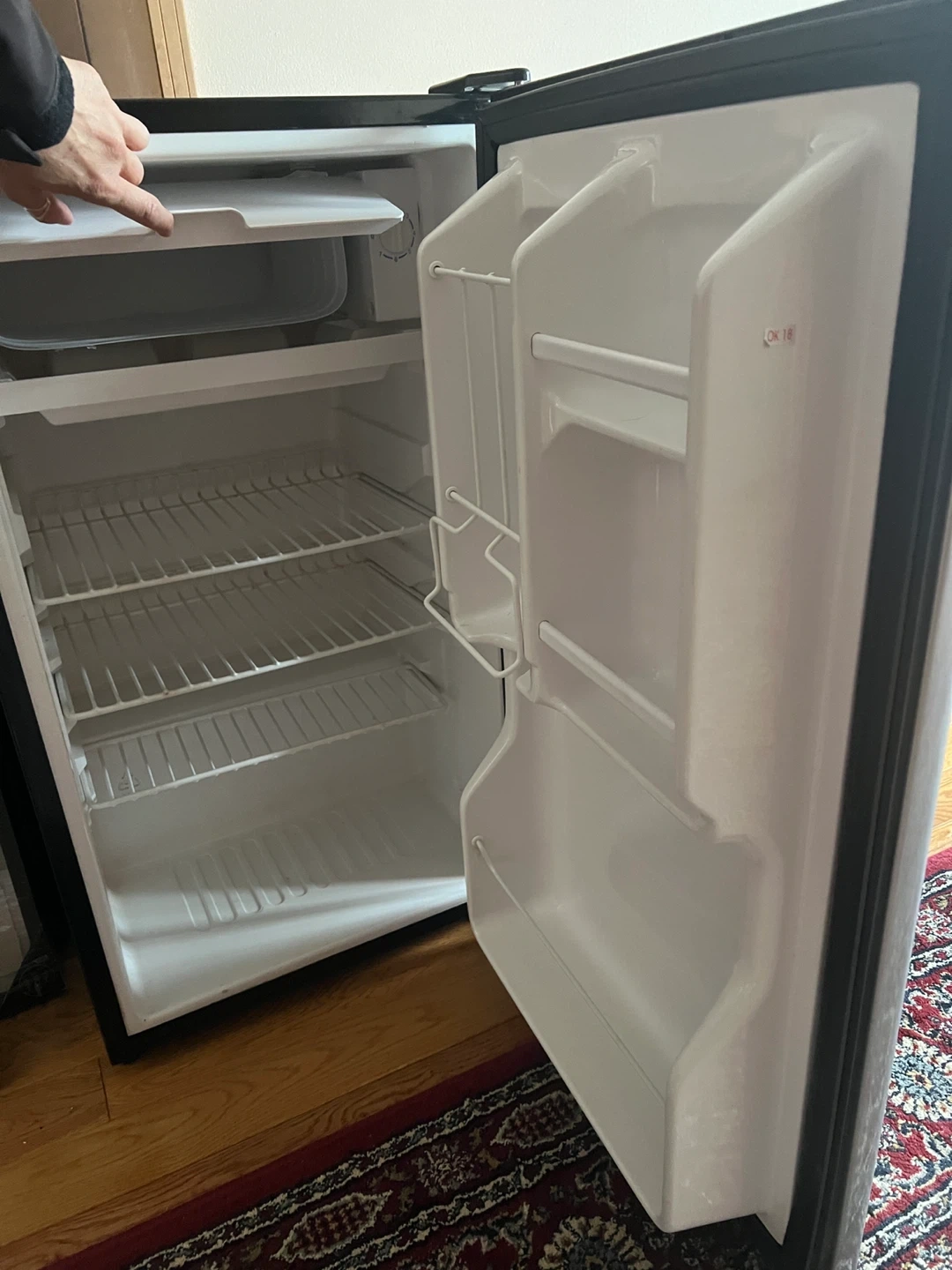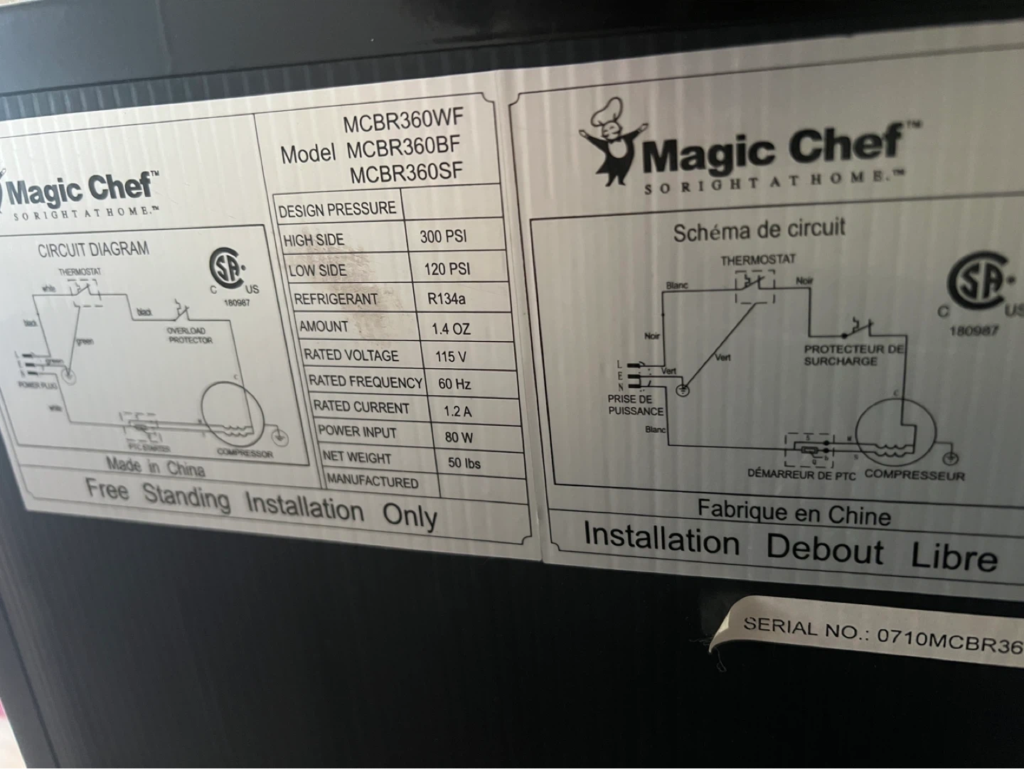 Perfect condition Magic Chef mini fridge, model MCBR360WF. It's silver and black with adjustable shelves. Measures approximately 34 inches tall. Great for a dorm room or office!