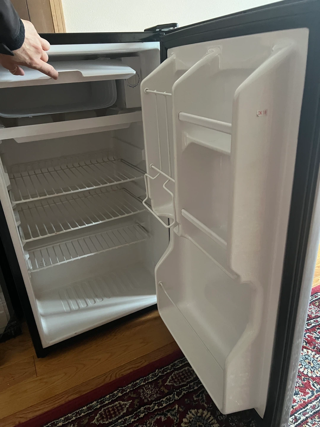 Perfect condition Magic Chef mini fridge, model MCBR360WF. It's silver and black with adjustable shelves. Measures approximately 34 inches tall. Great for a dorm room or office!