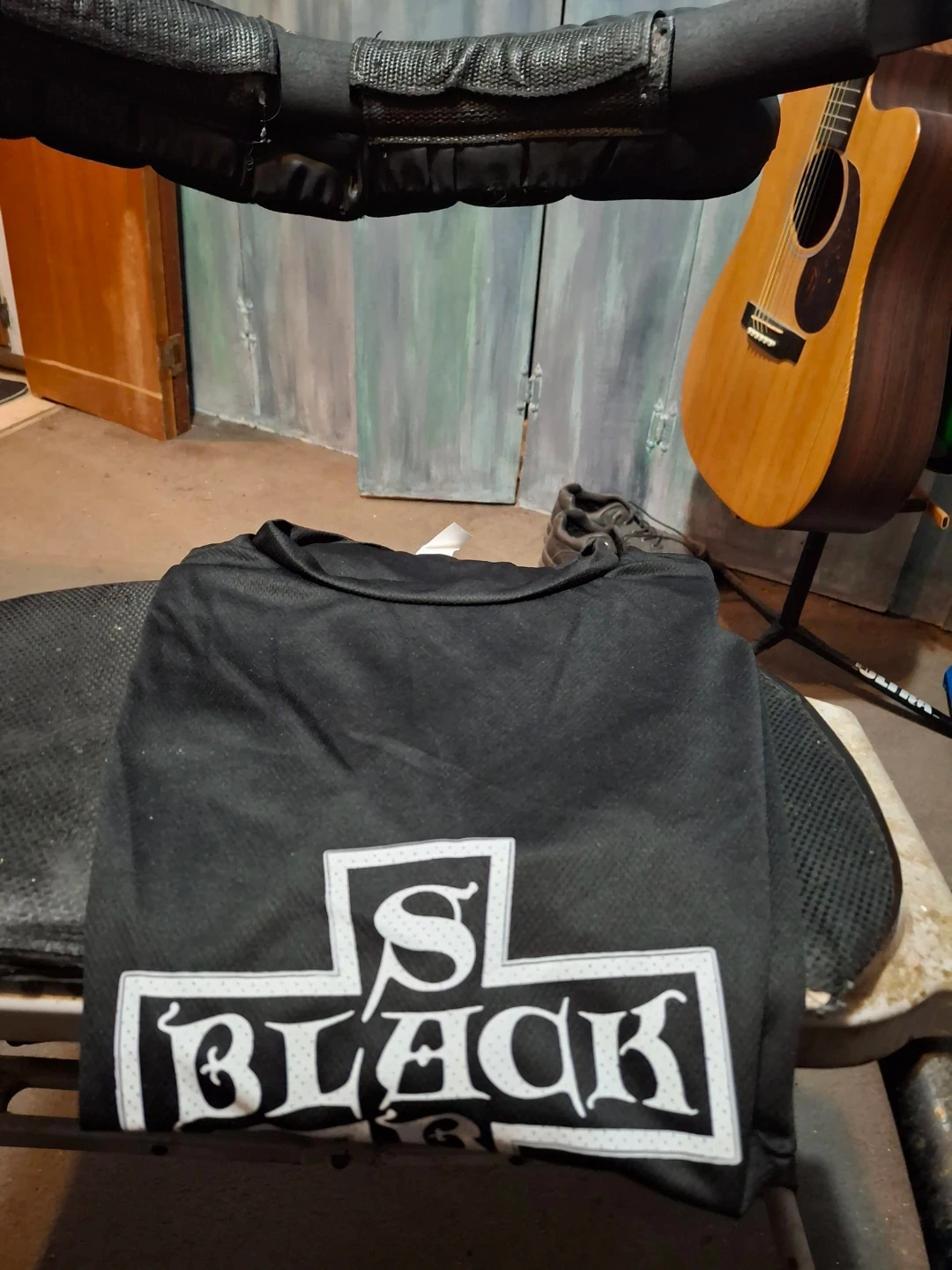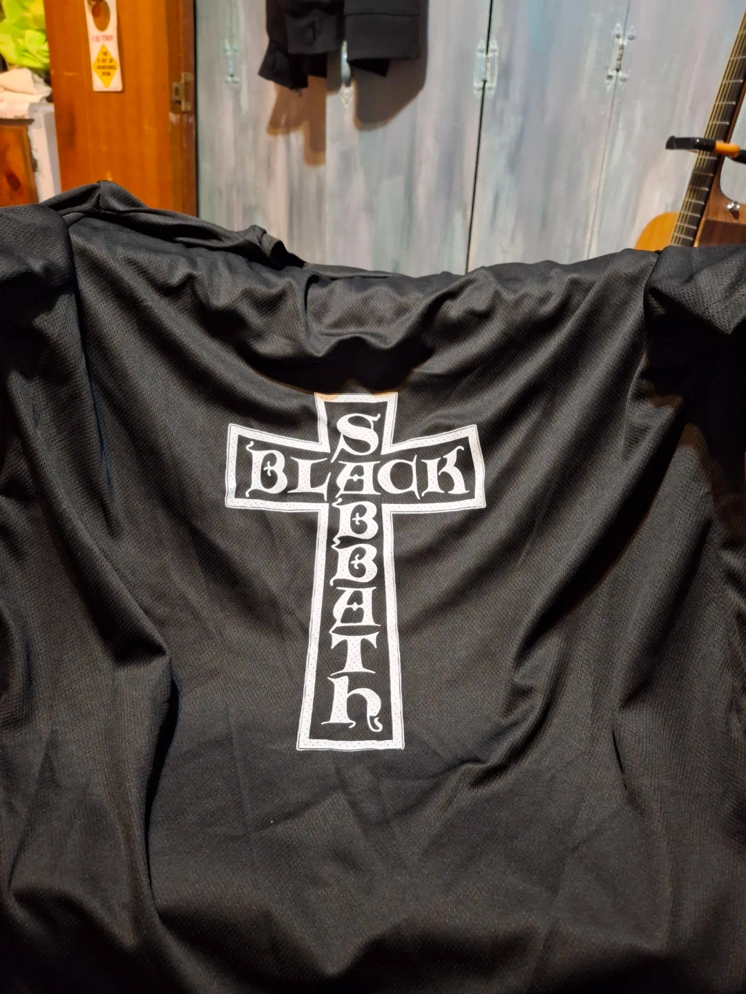 Black t-shirt featuring the iconic Black Sabbath cross logo. It's made of a breathable, lightweight fabric, perfect for concerts or casual wear. A must-have for any fan!