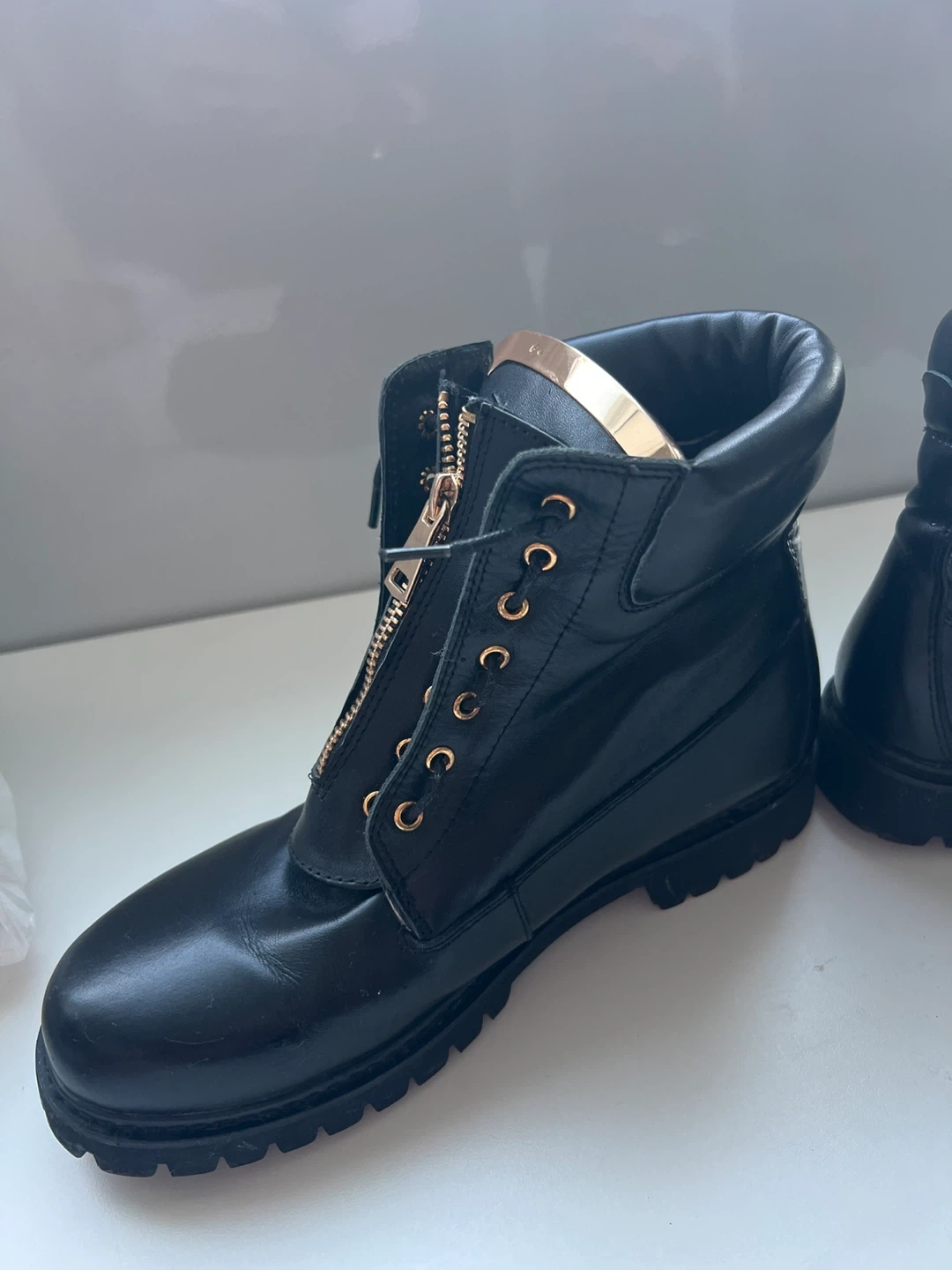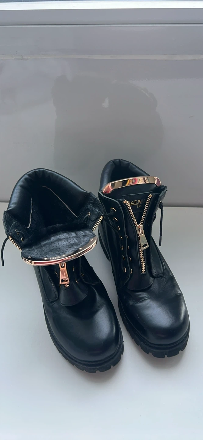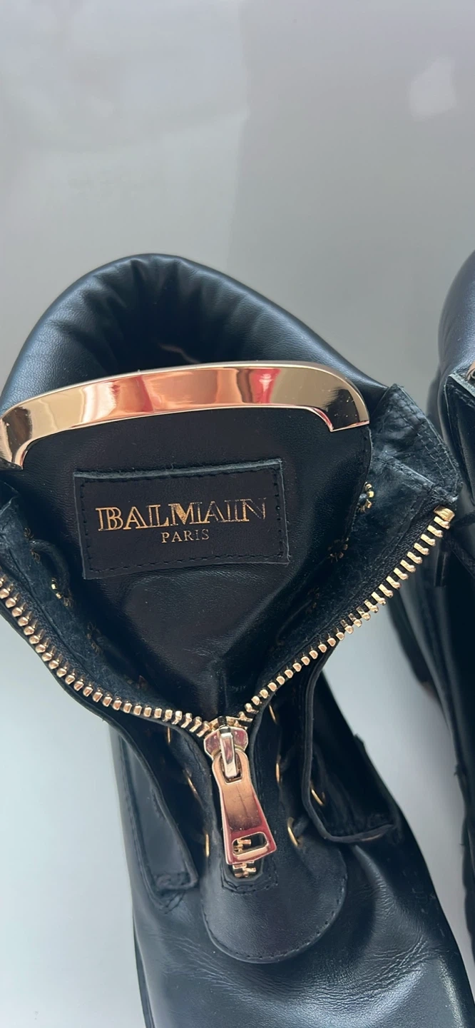 These Balmain Paris boots are made from black leather. They feature a front zip closure and gold hardware. They are a size 38.