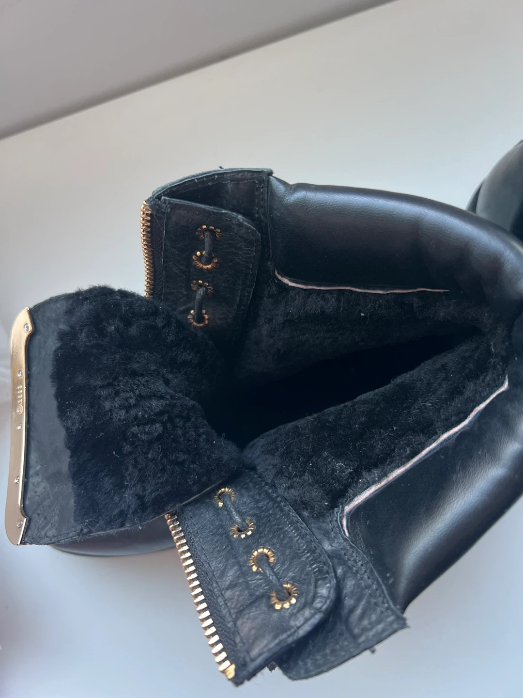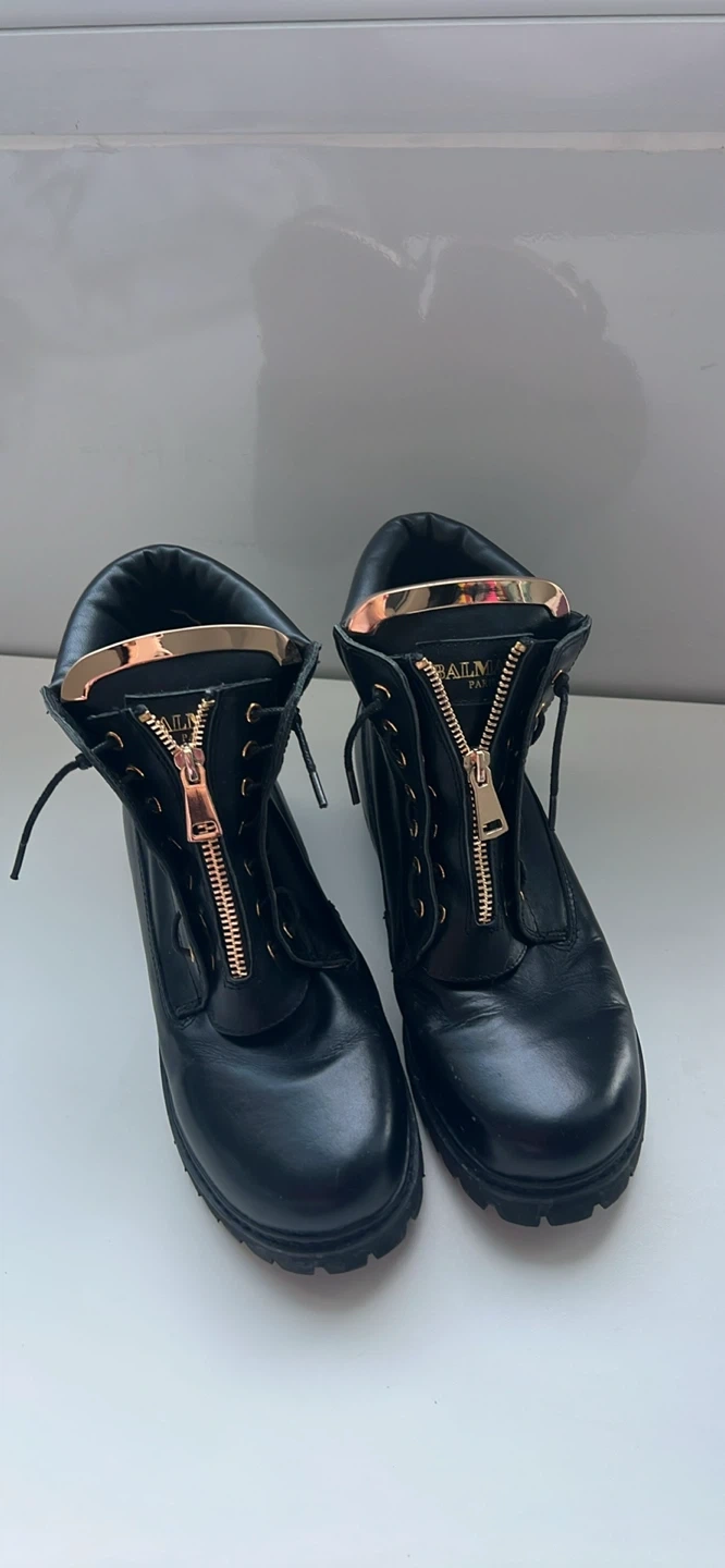 These Balmain Paris boots are made from black leather. They feature a front zip closure and gold hardware. They are a size 38.
