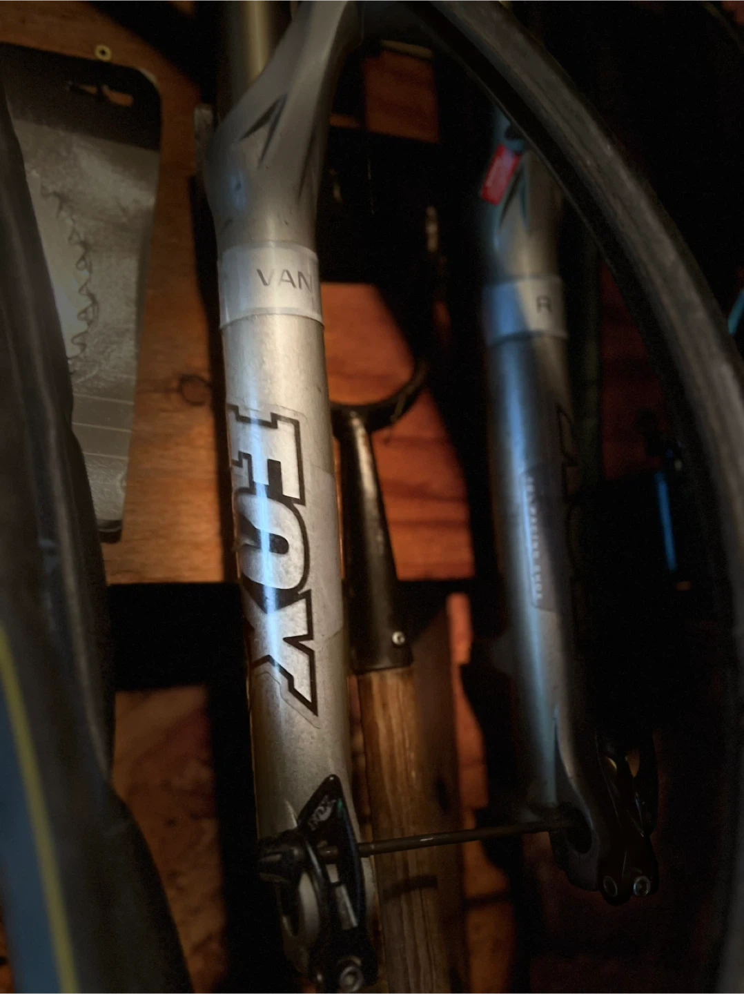 Used FOX suspension fork for mountain bikes. It's a silver and gold model with 'FOX' clearly visible on the stanchions. This fork is designed for downhill or trail riding. VAN R Series
