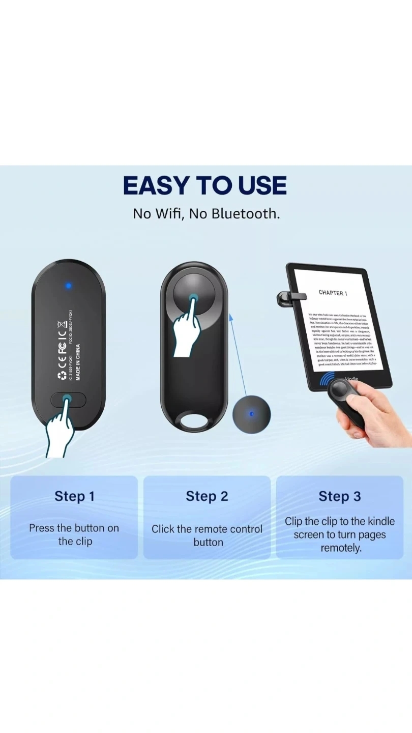 This wireless page turner remote allows you to flip pages on your Kindle, iPhone, or Android device without touching the screen. It has a long battery life and is compatible with most e-readers and phones. The device is lightweight and easy to carry with its included pouch.