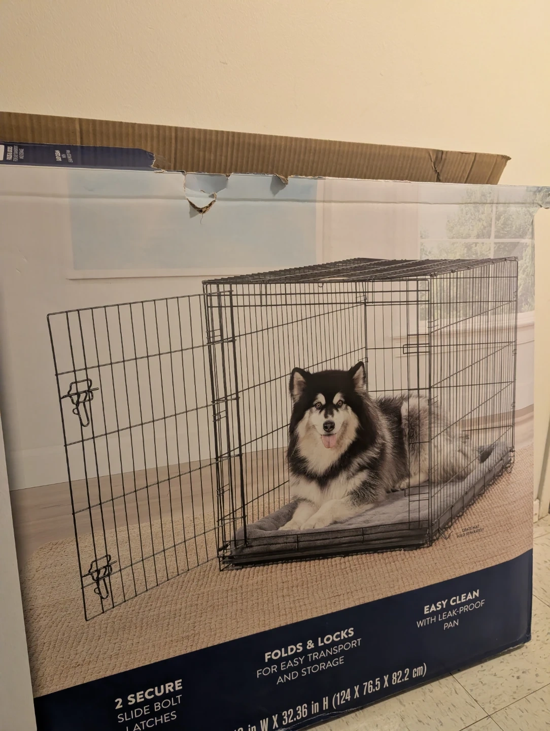 This is a Top-Paw 48-inch single-door folding dog crate. It features two secure slide bolt latches for the door. The crate folds and locks for easy transport and storage. It includes an easy-clean, leak-proof pan.