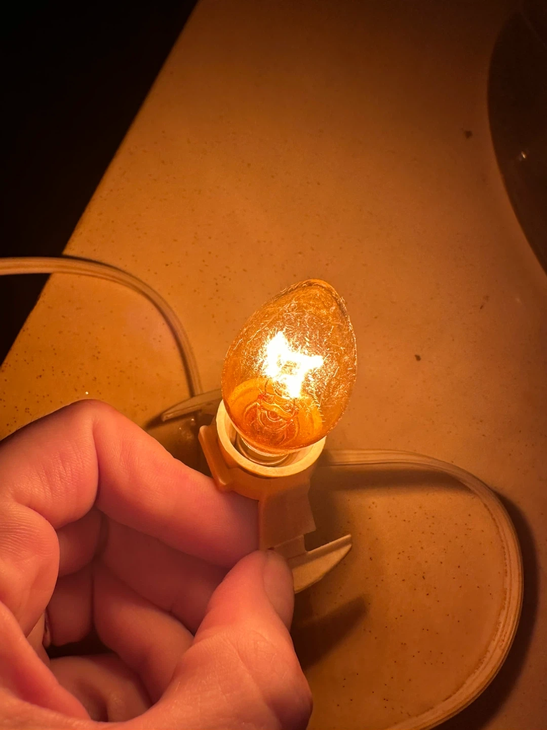 Single yellow C7 Christmas light bulb with a white cord. This bulb is a warm yellow colour and is ready to be used for your holiday decorating! It's a standard replacement bulb for many string light sets.