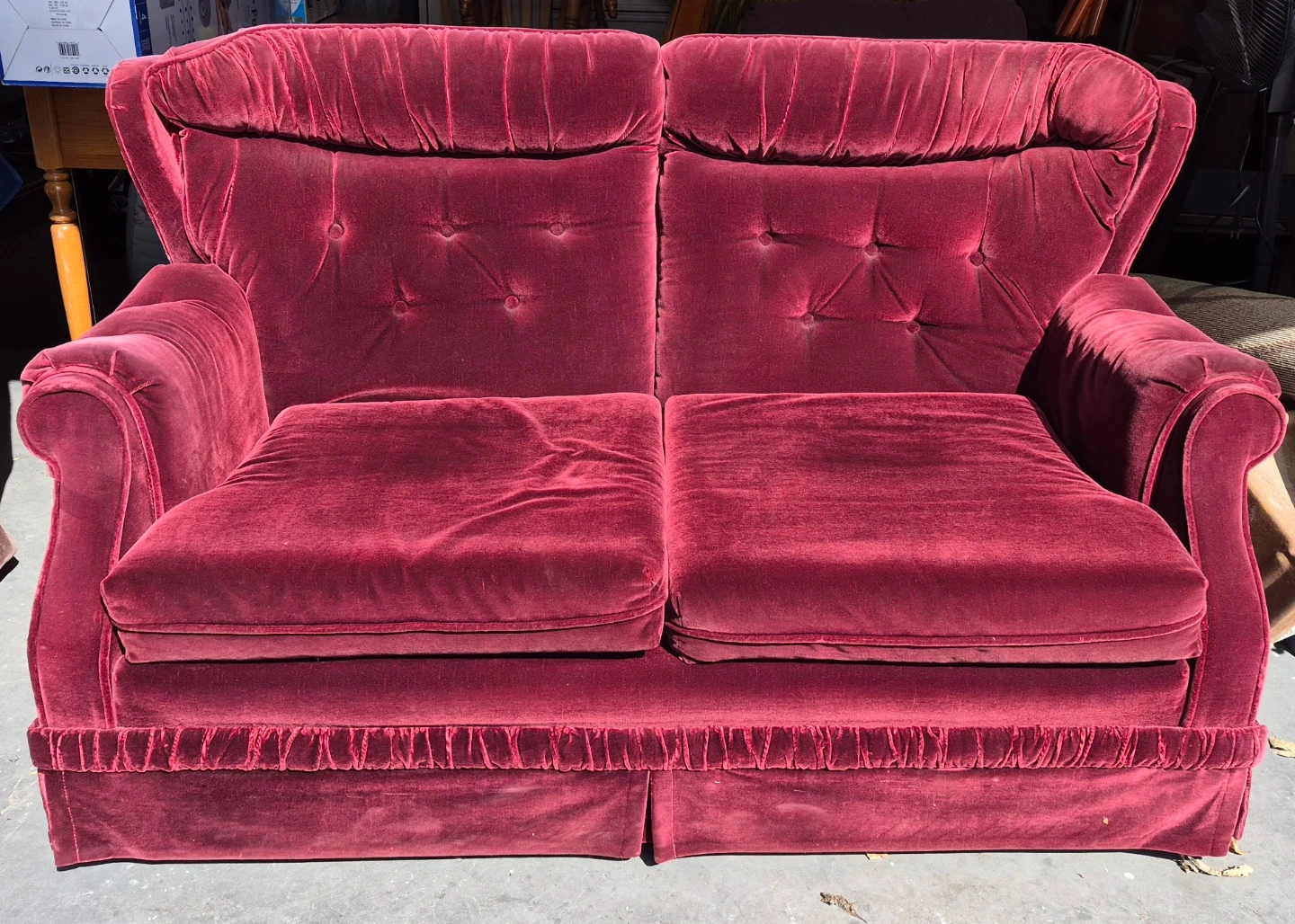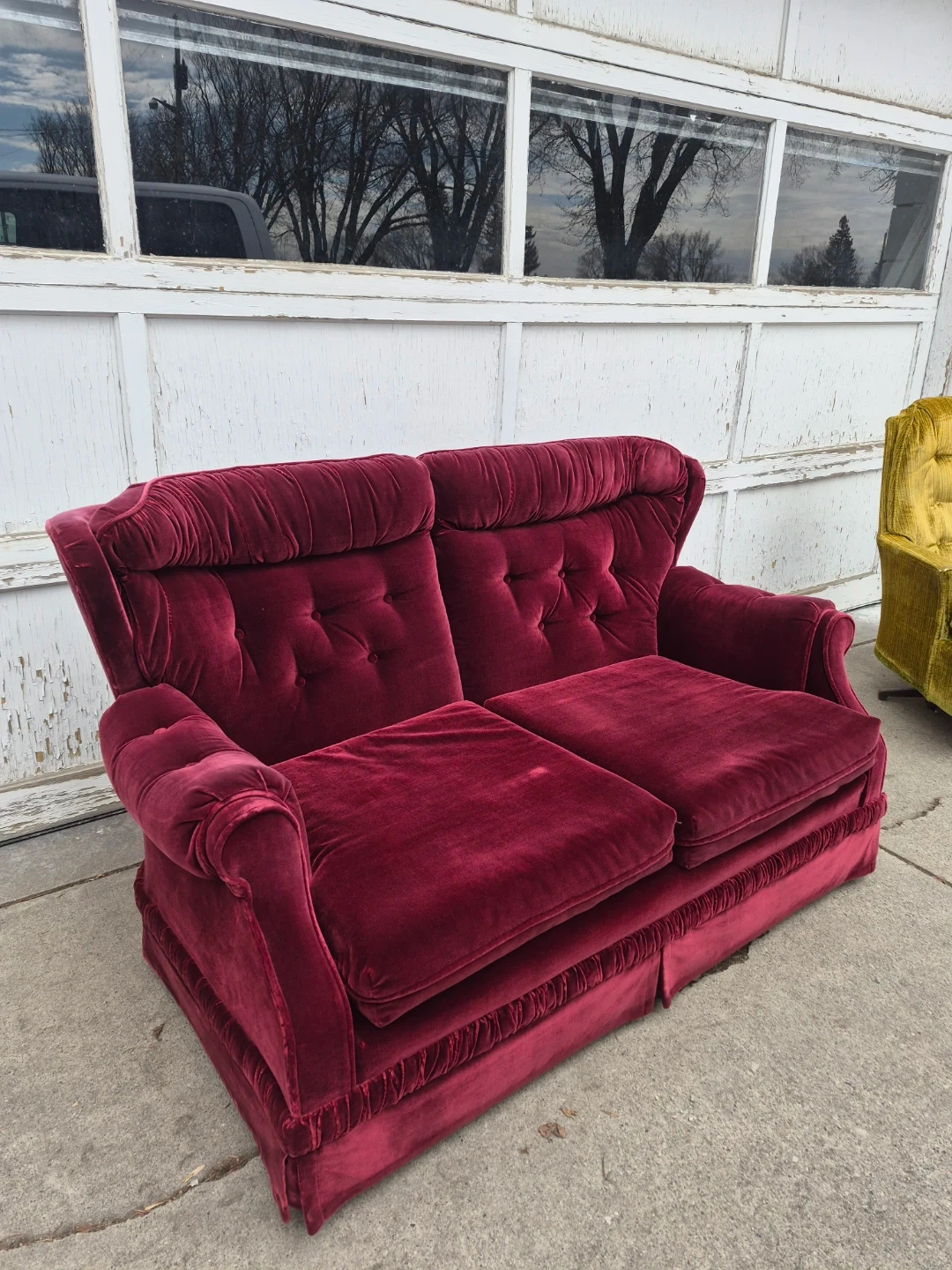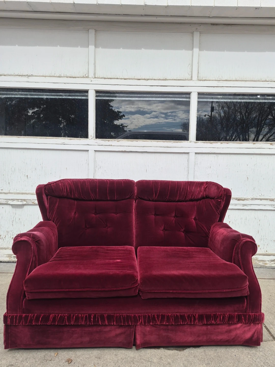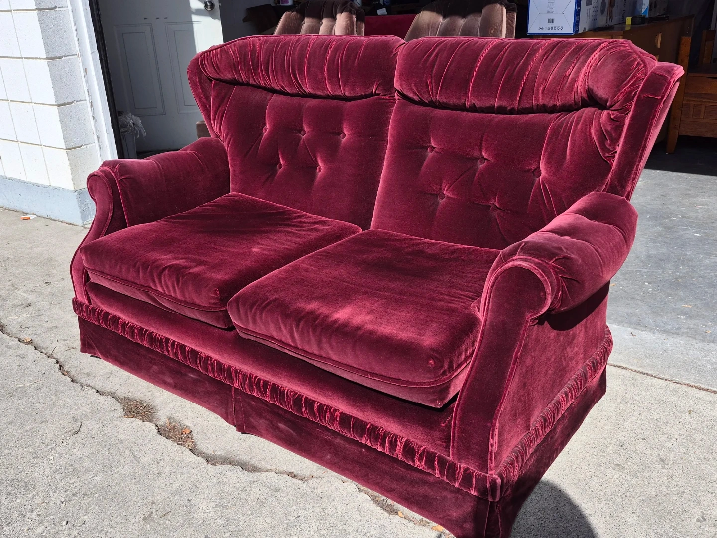 This is a beautiful two-seater loveseat upholstered in plush burgundy velvet. It features tufted back cushions and decorative trim along the base. Two accent pillows are Not included.