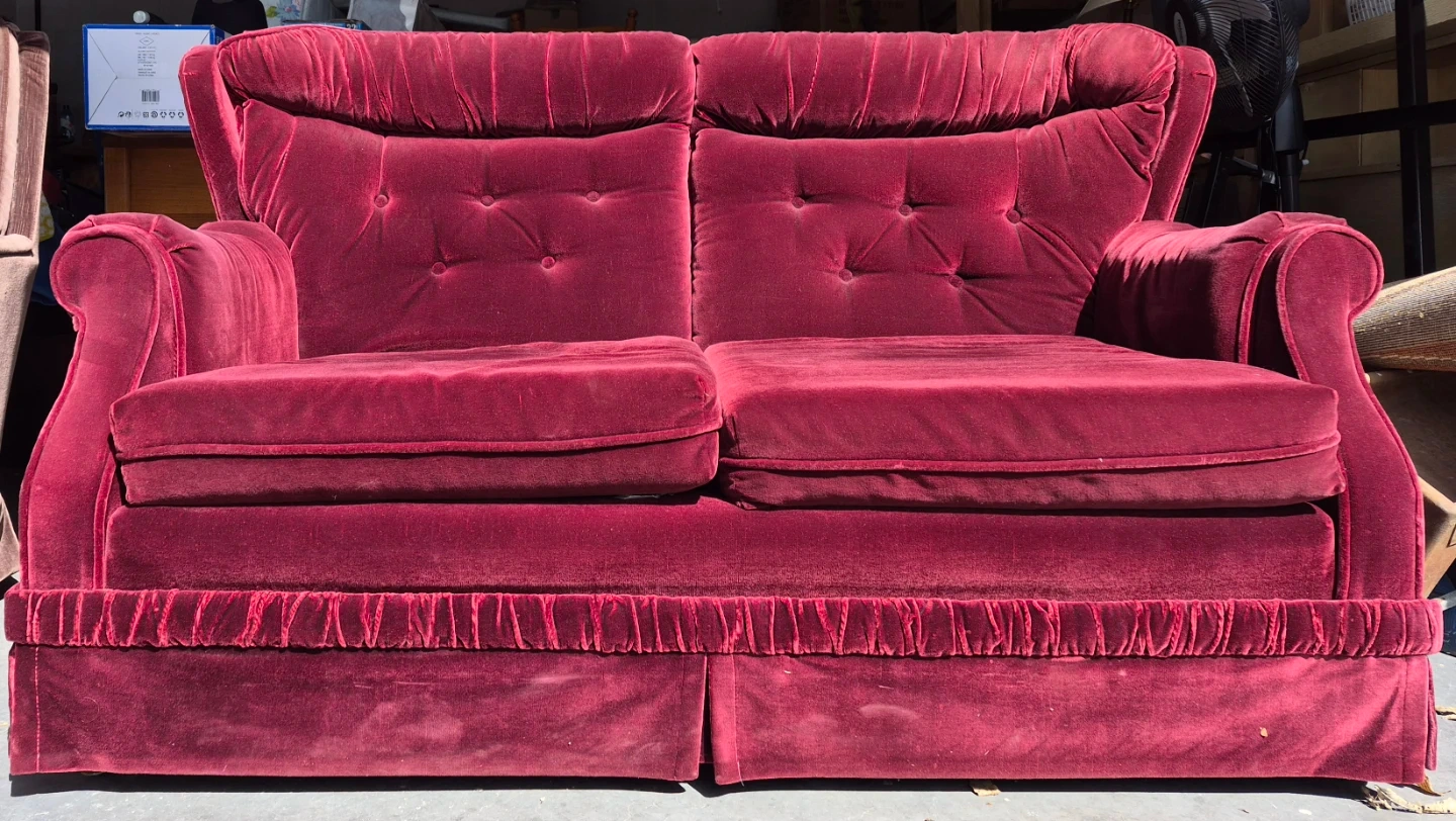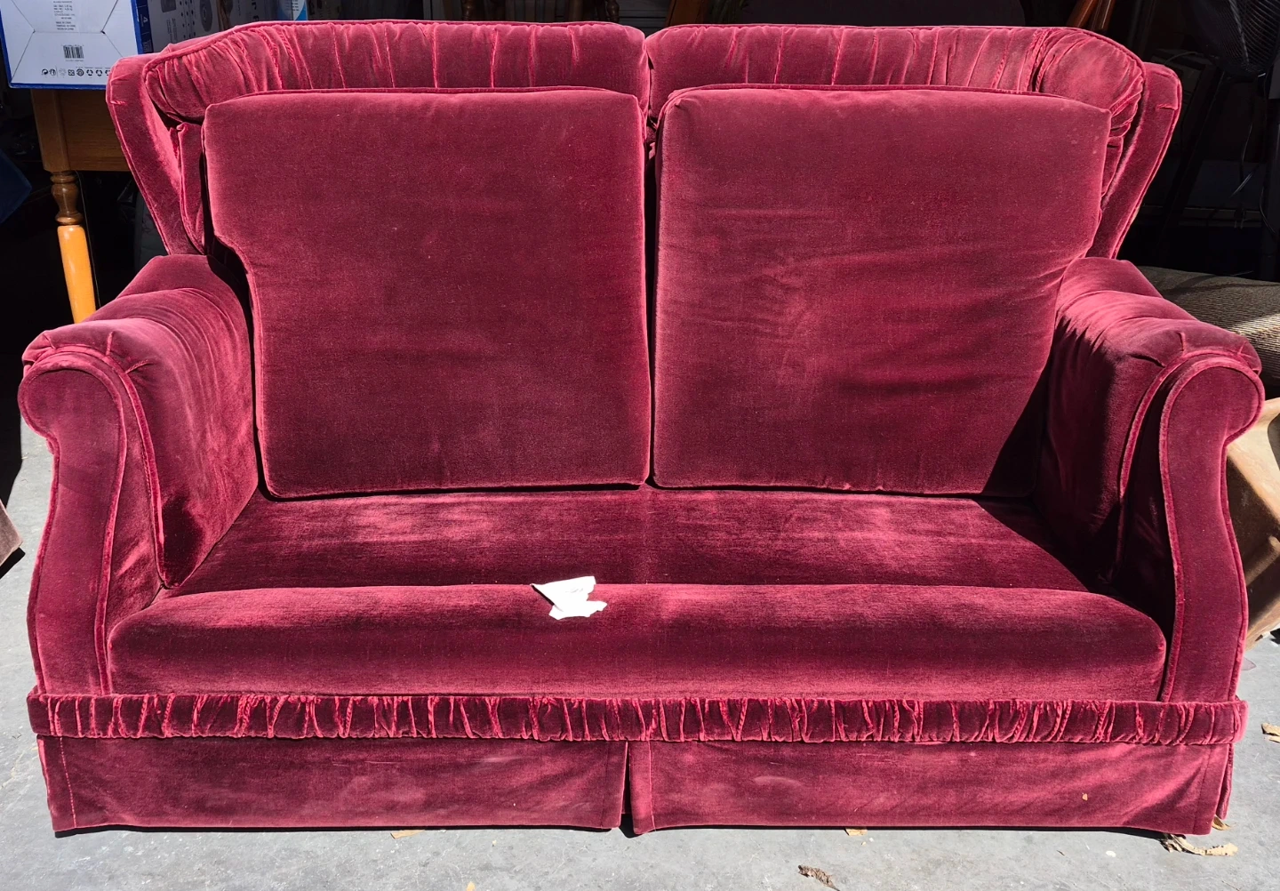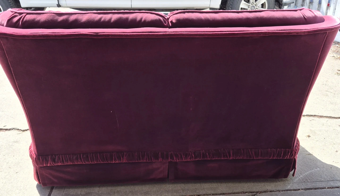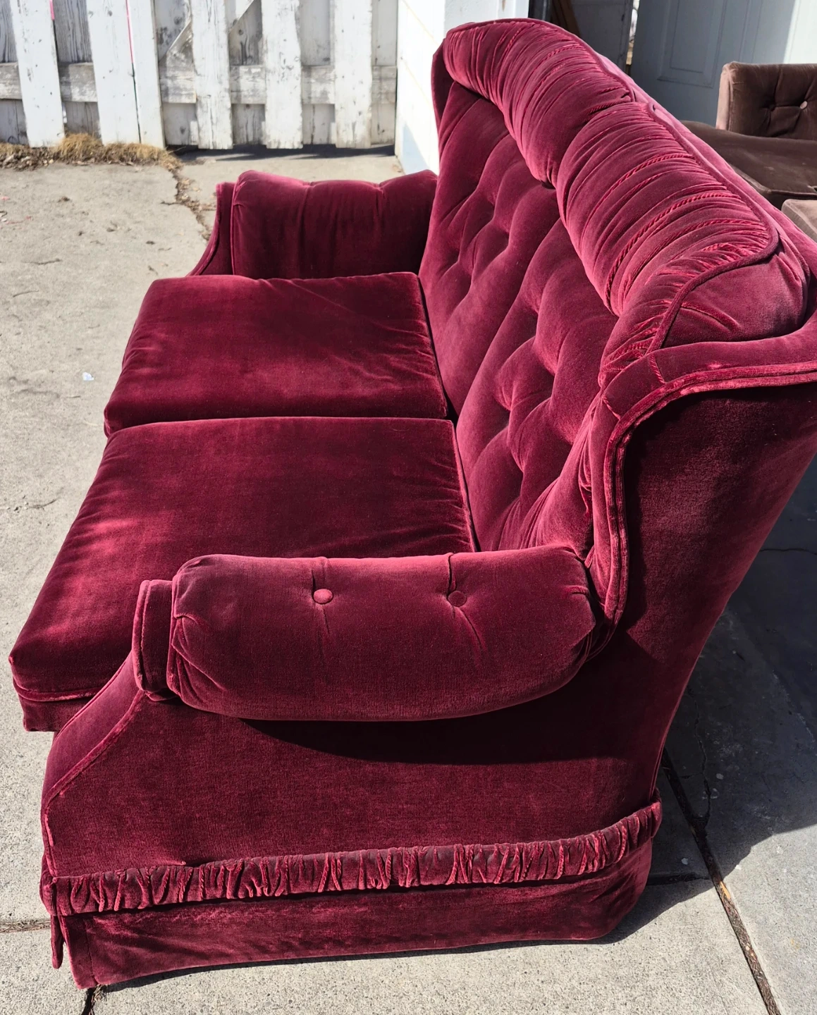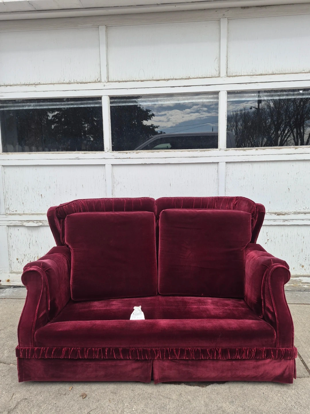 This is a beautiful two-seater loveseat upholstered in plush burgundy velvet. It features tufted back cushions and decorative trim along the base. Two accent pillows are Not included.