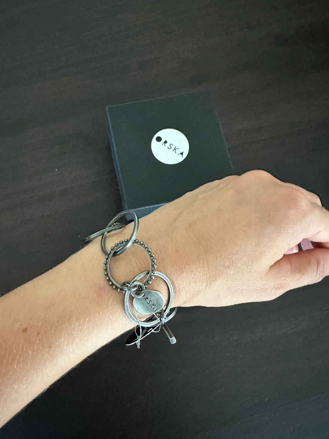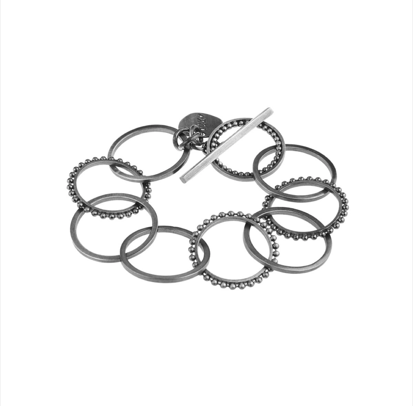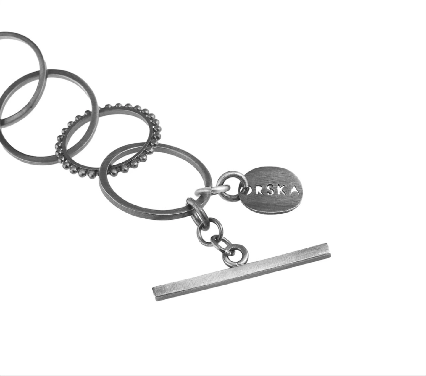 The classic bracelet was handcrafted from silver. The simple form is enriched by the use of various links of the same size and their irregular arrangement. Fastened with a decorative clasp, it rhythmically sounds with every movement. Thanks to its universal character and elegant form, it will be a great complement to many creations, both everyday and evening.